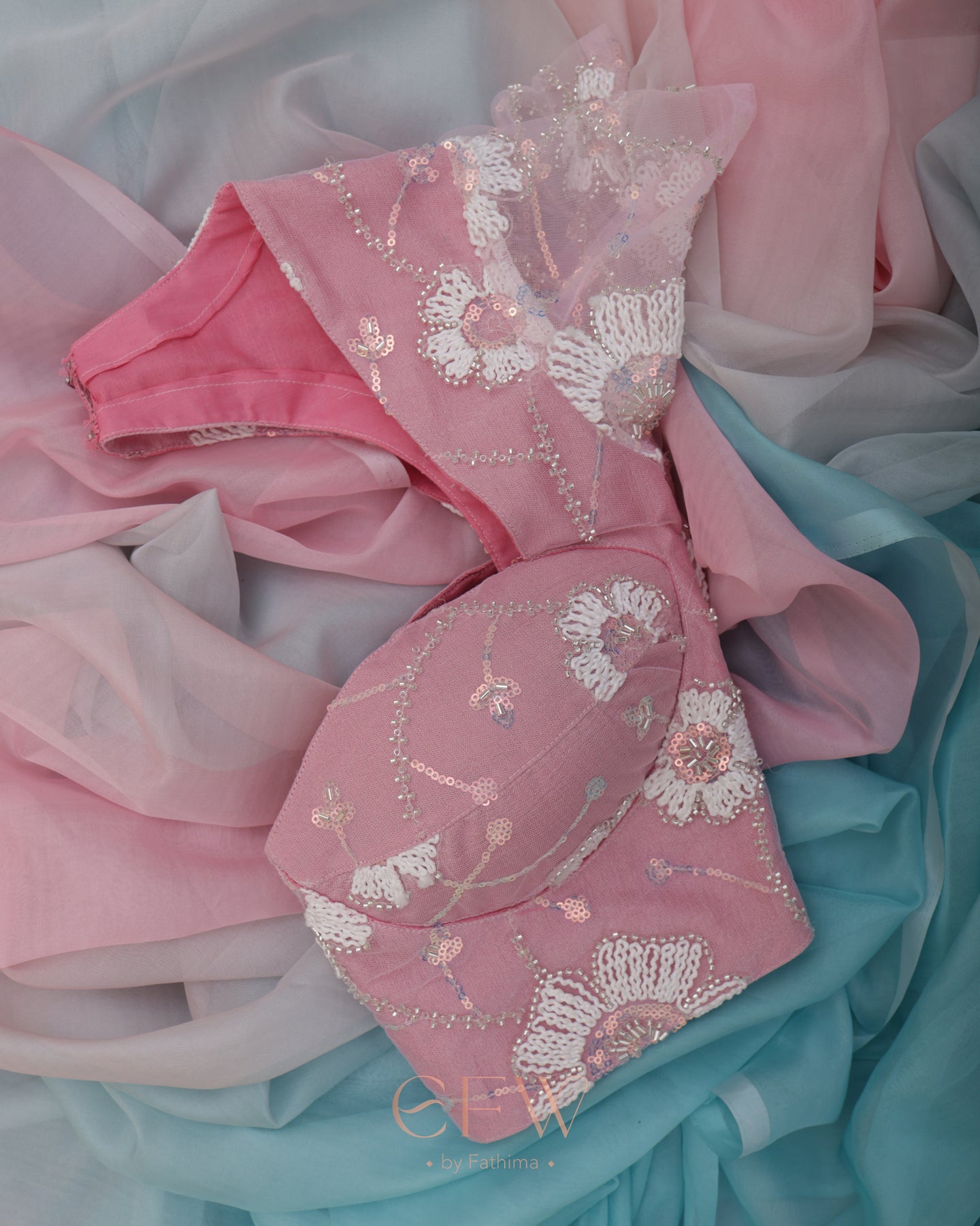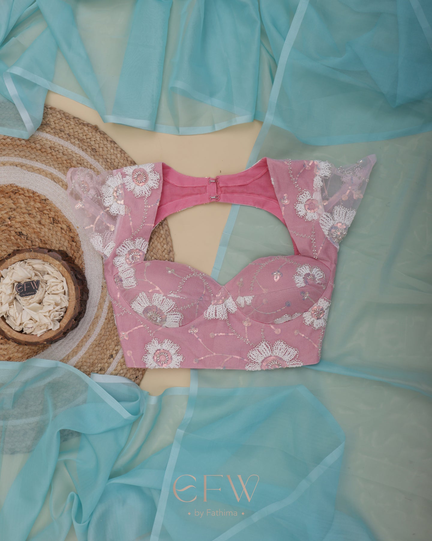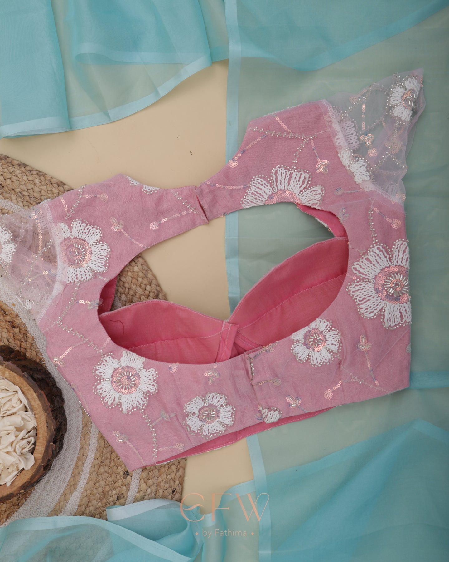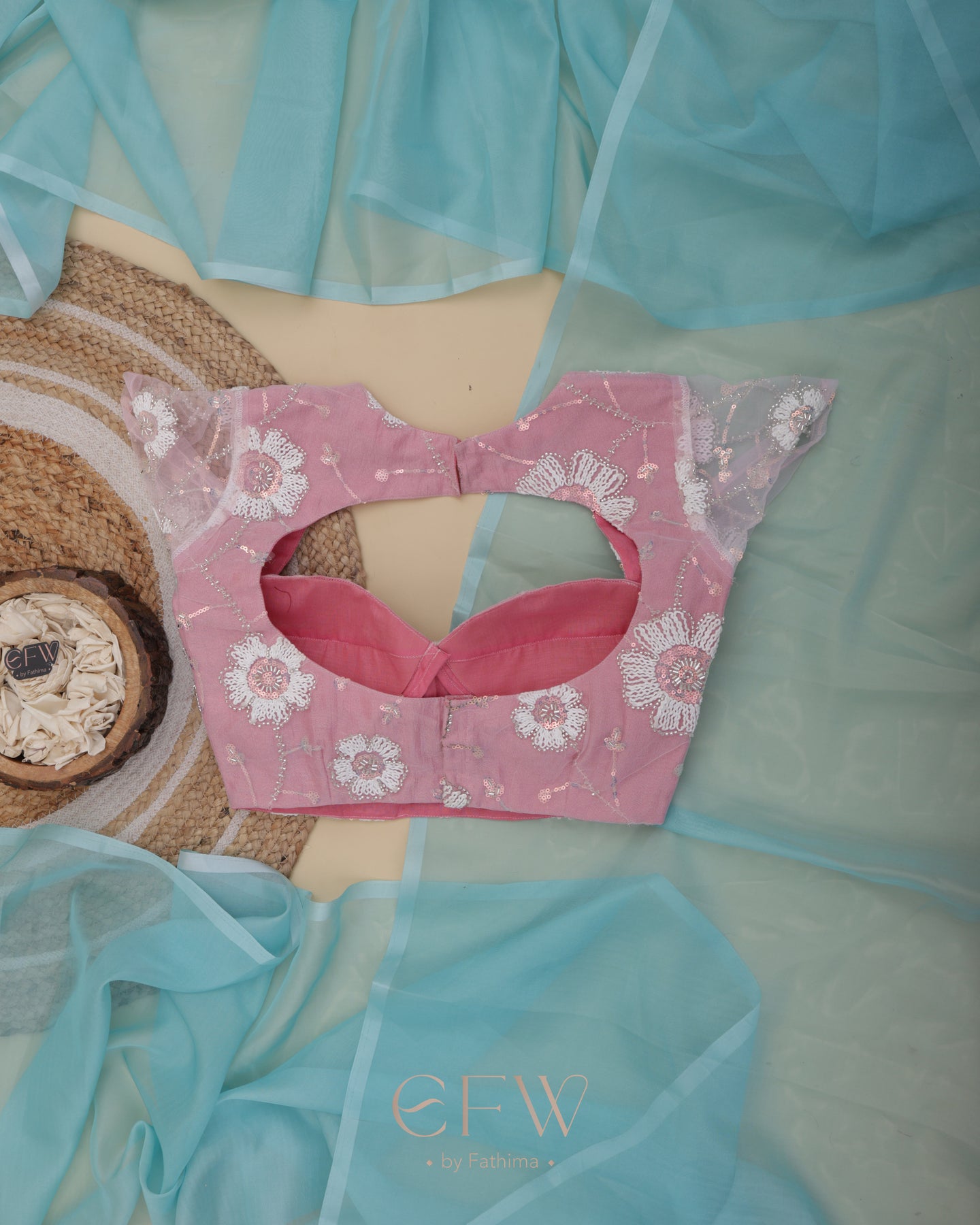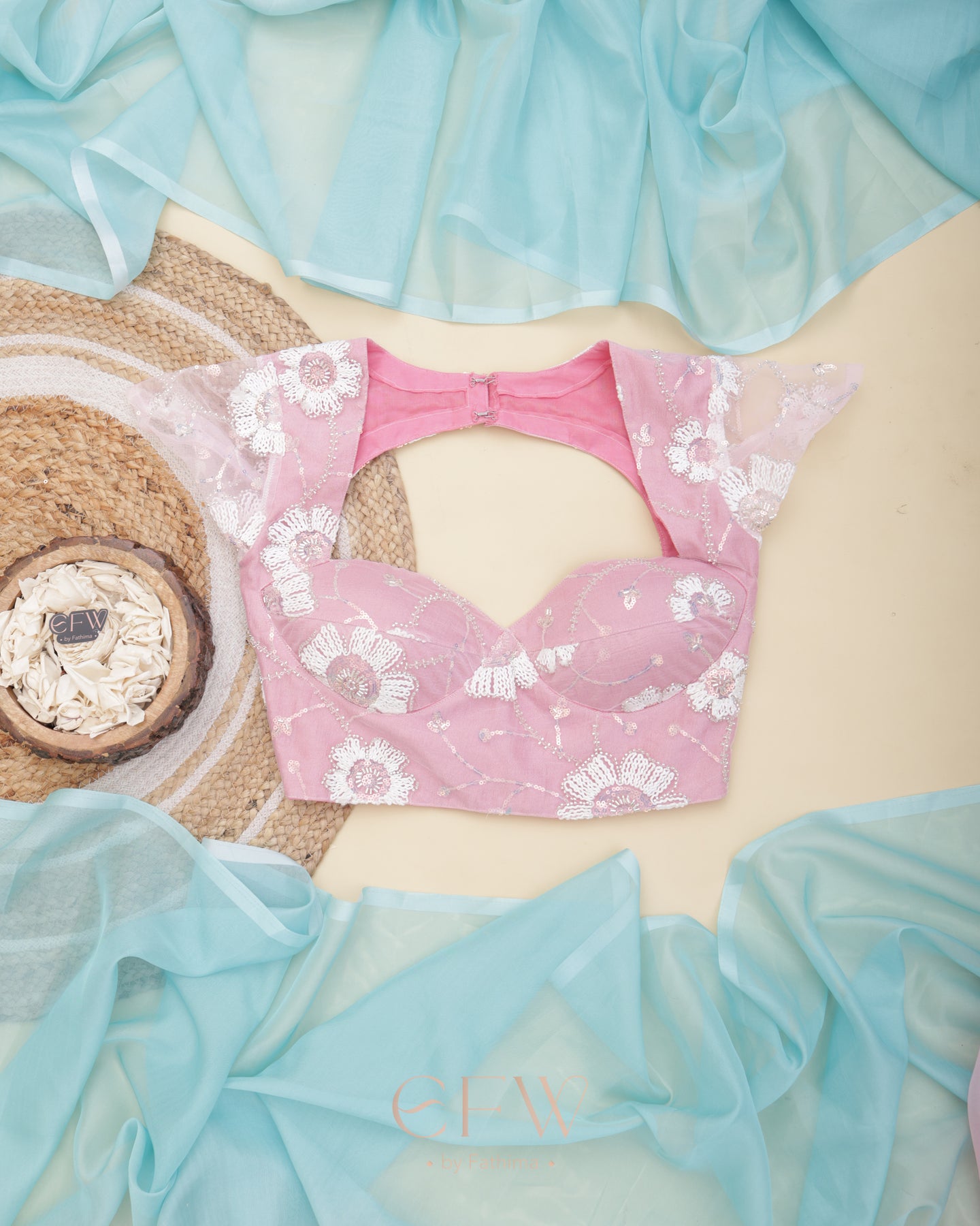 The blouse is versatile enough to pair with other pastel sarees, skirts, or lehengas.