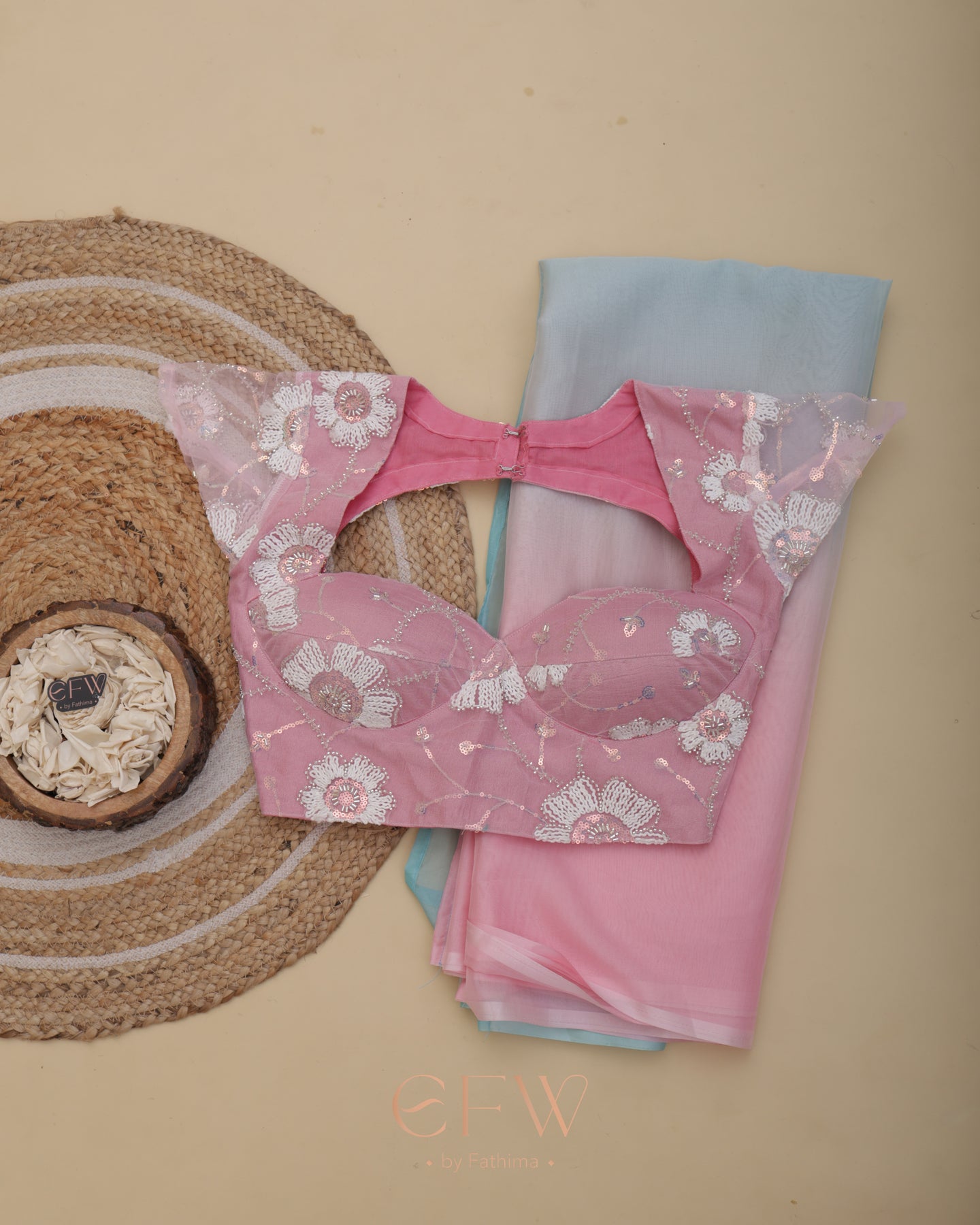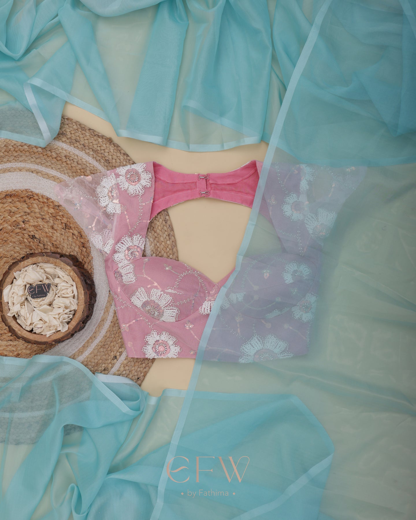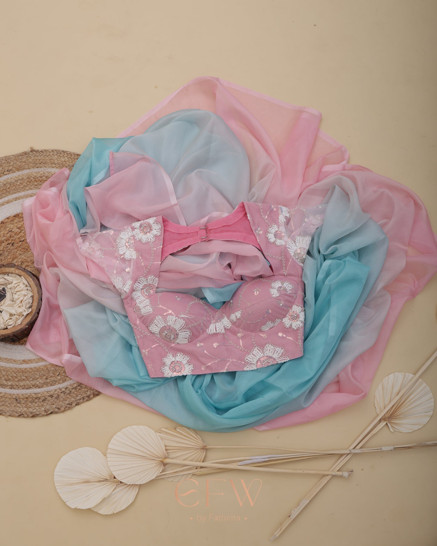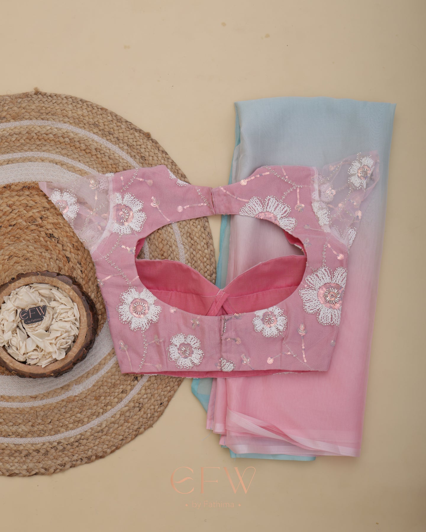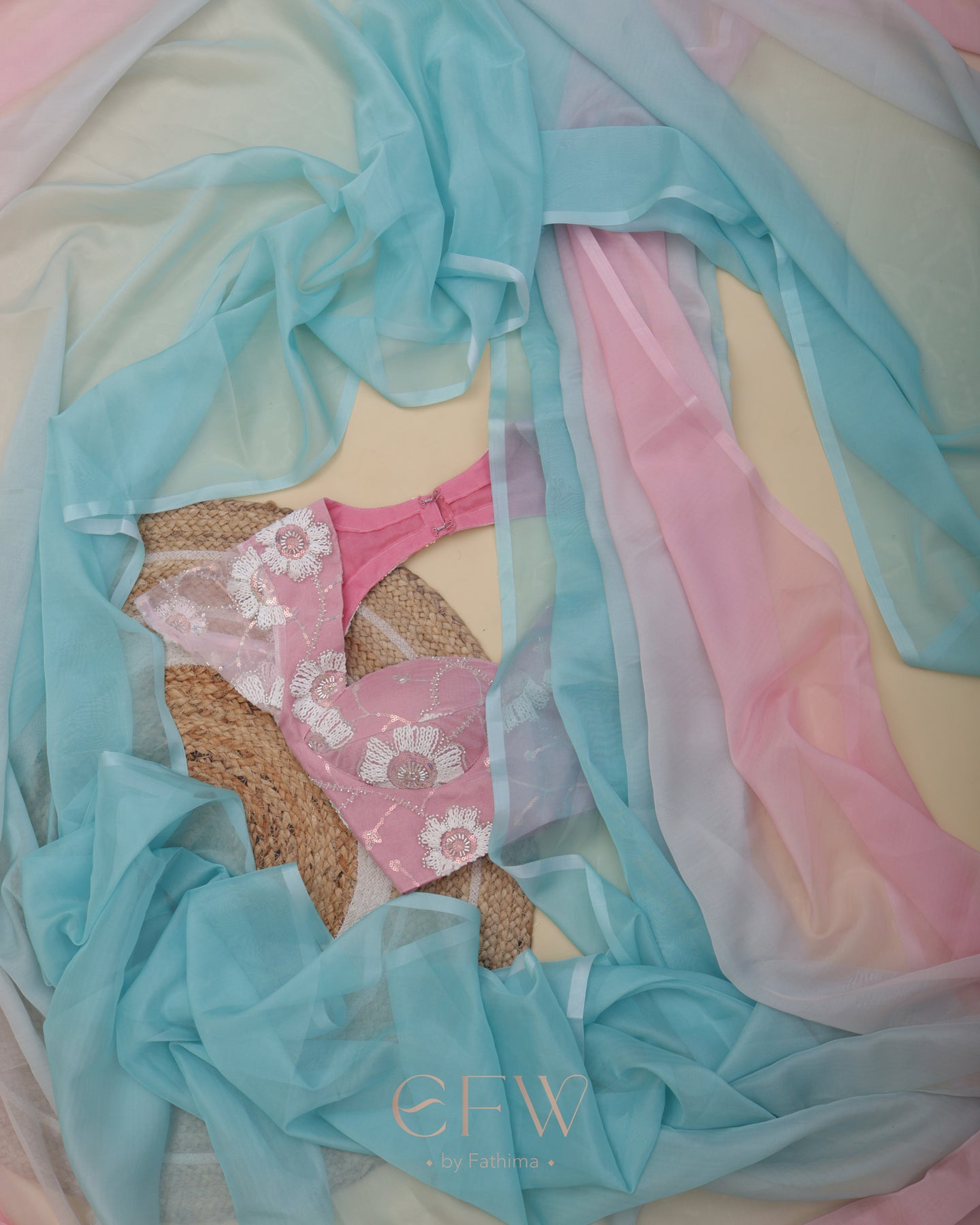 The SELENE Saree Set is a pastel dream designed for women who love elegance wrapped in lightness. A perfect blend of aqua calmness and blush romance, it celebrates the softness of organza with a statement blouse.