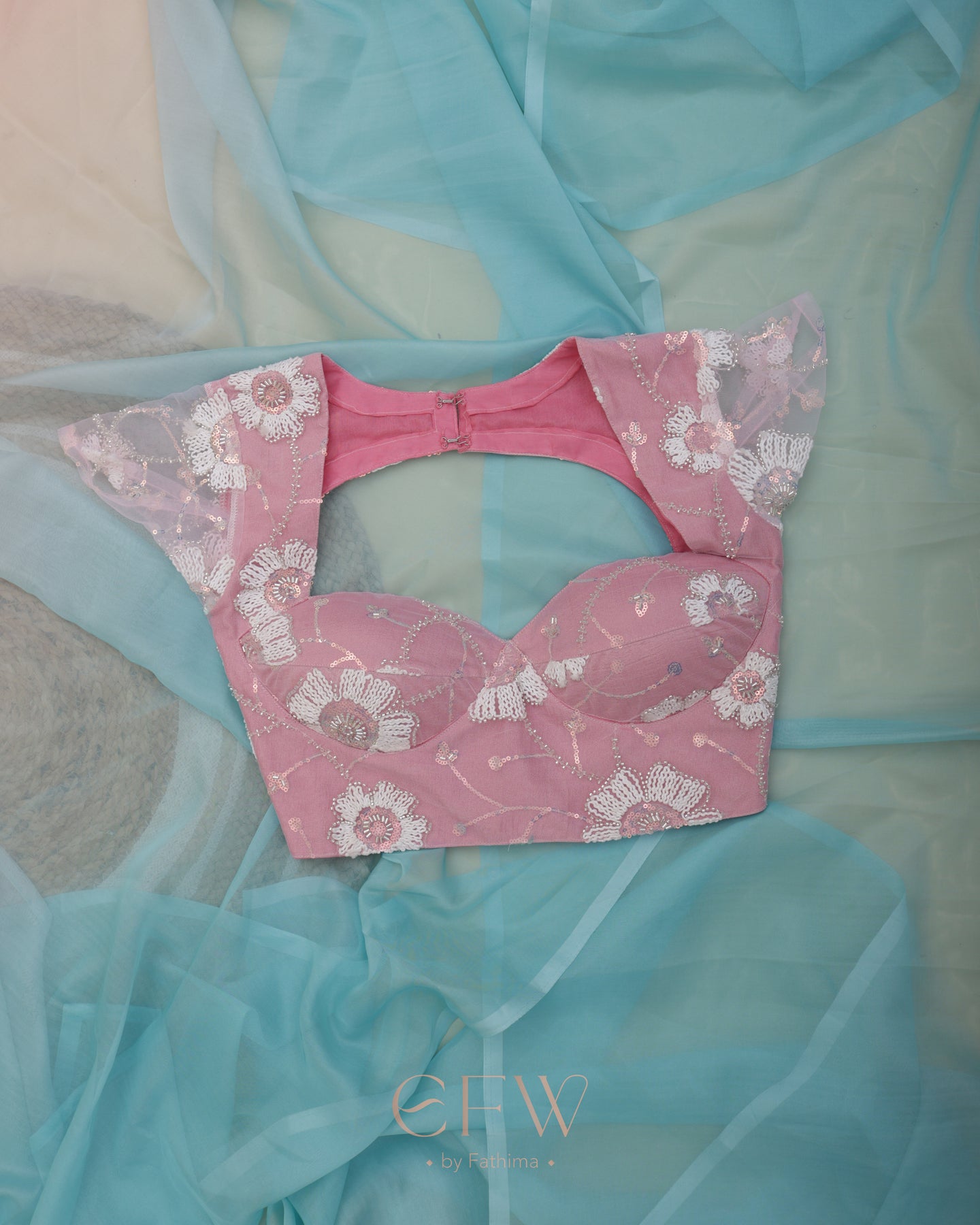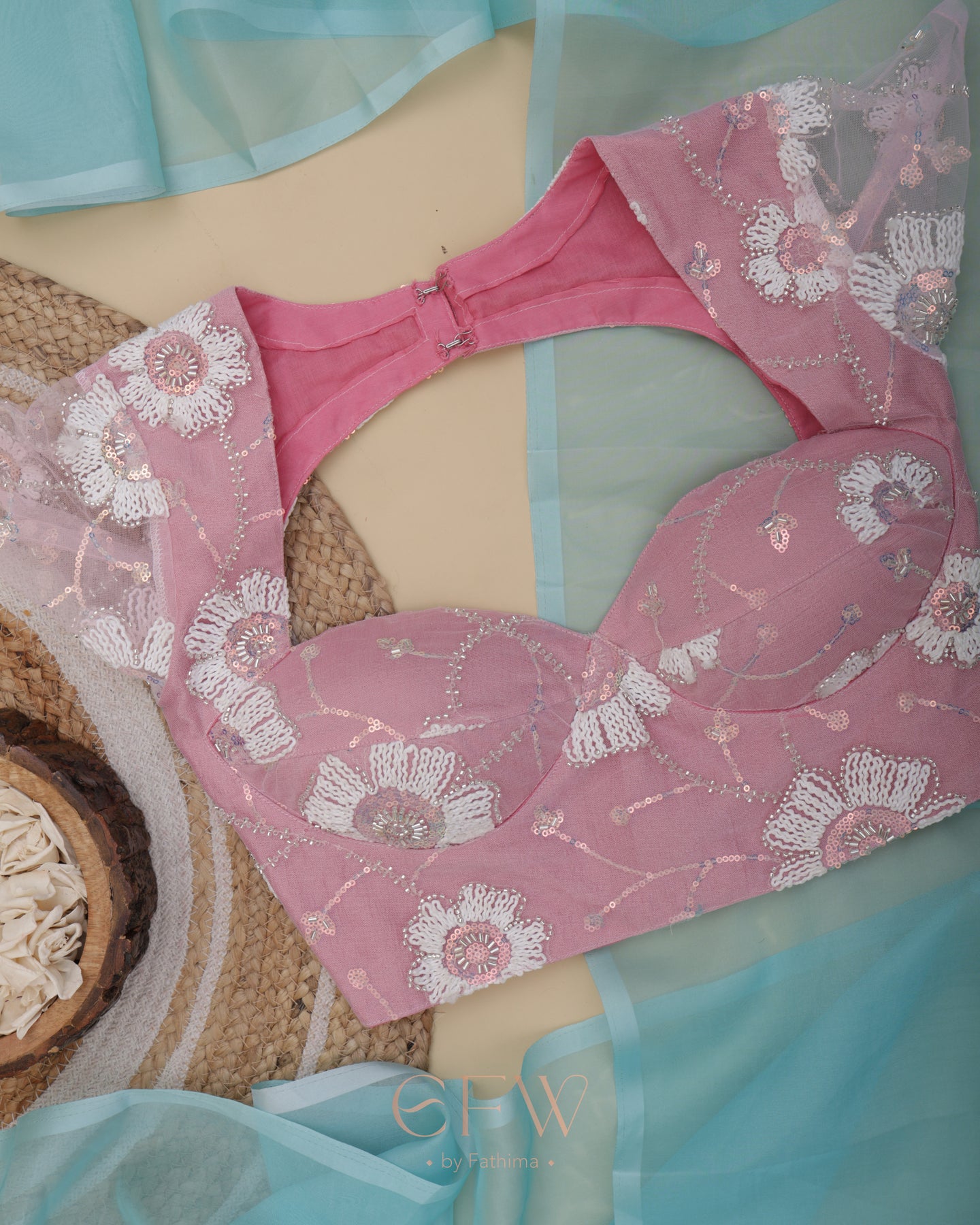 Paired with a blush pink sweetheart blouse adorned with white floral embroidery and sequins.