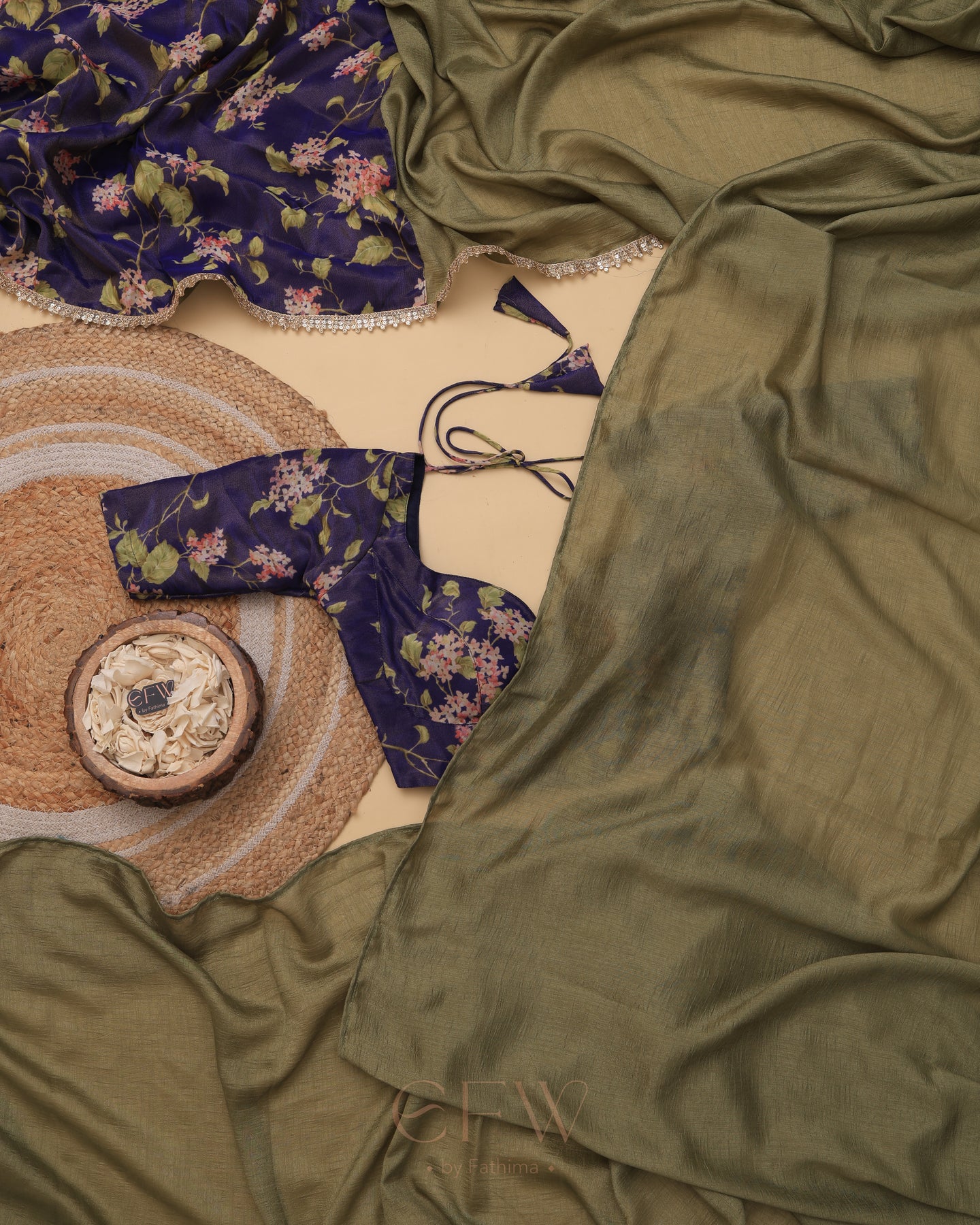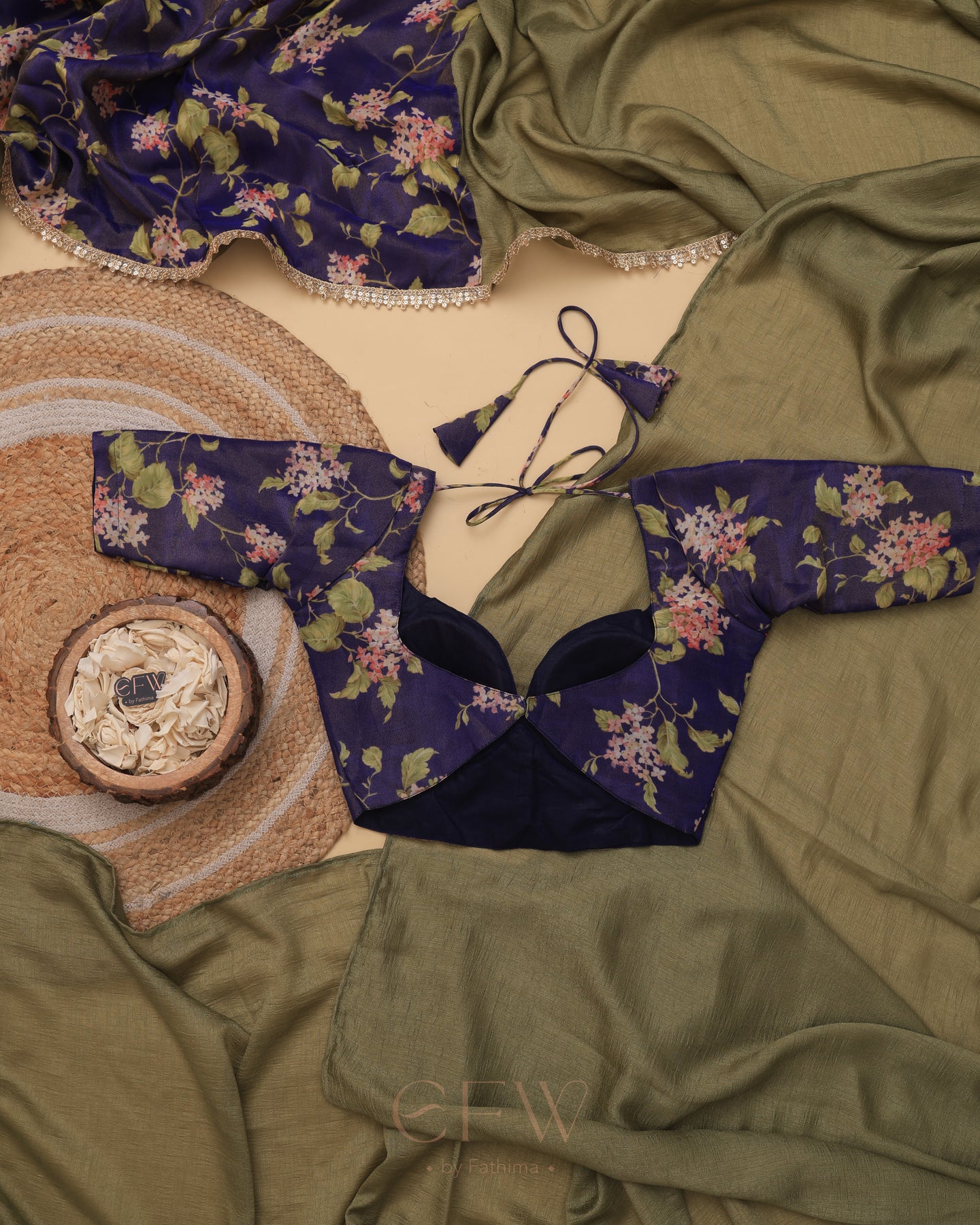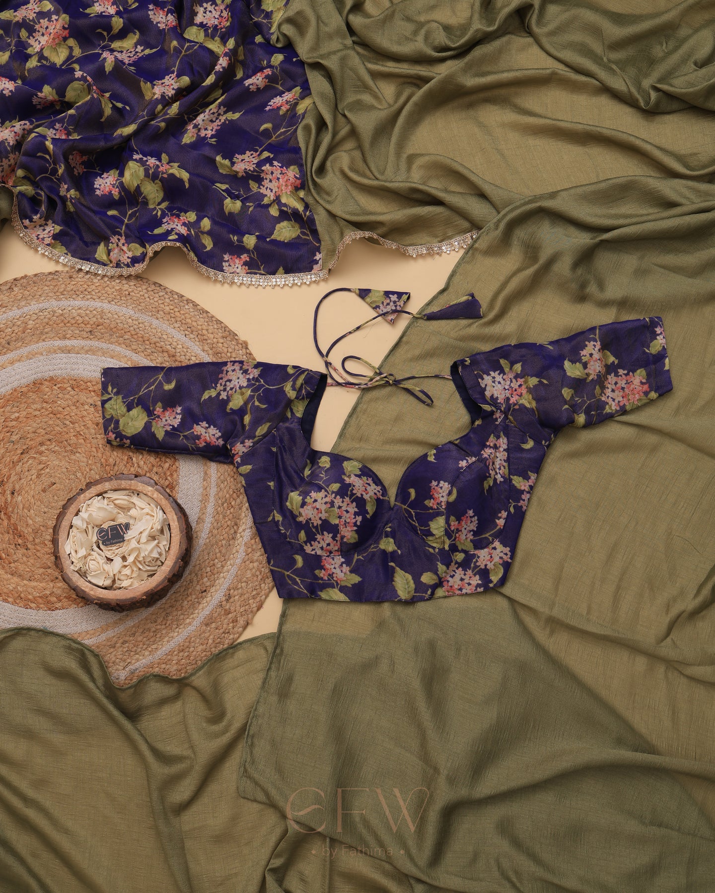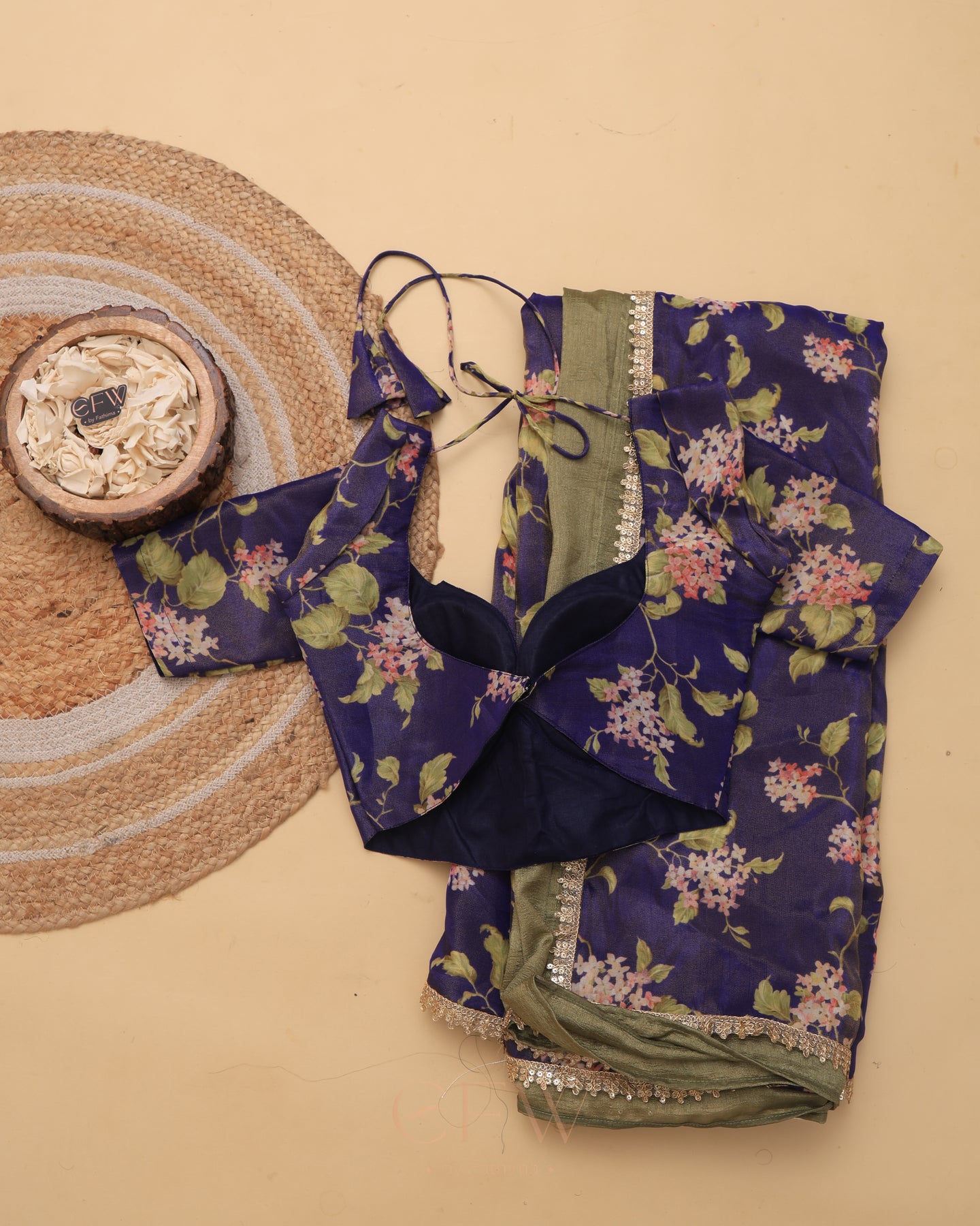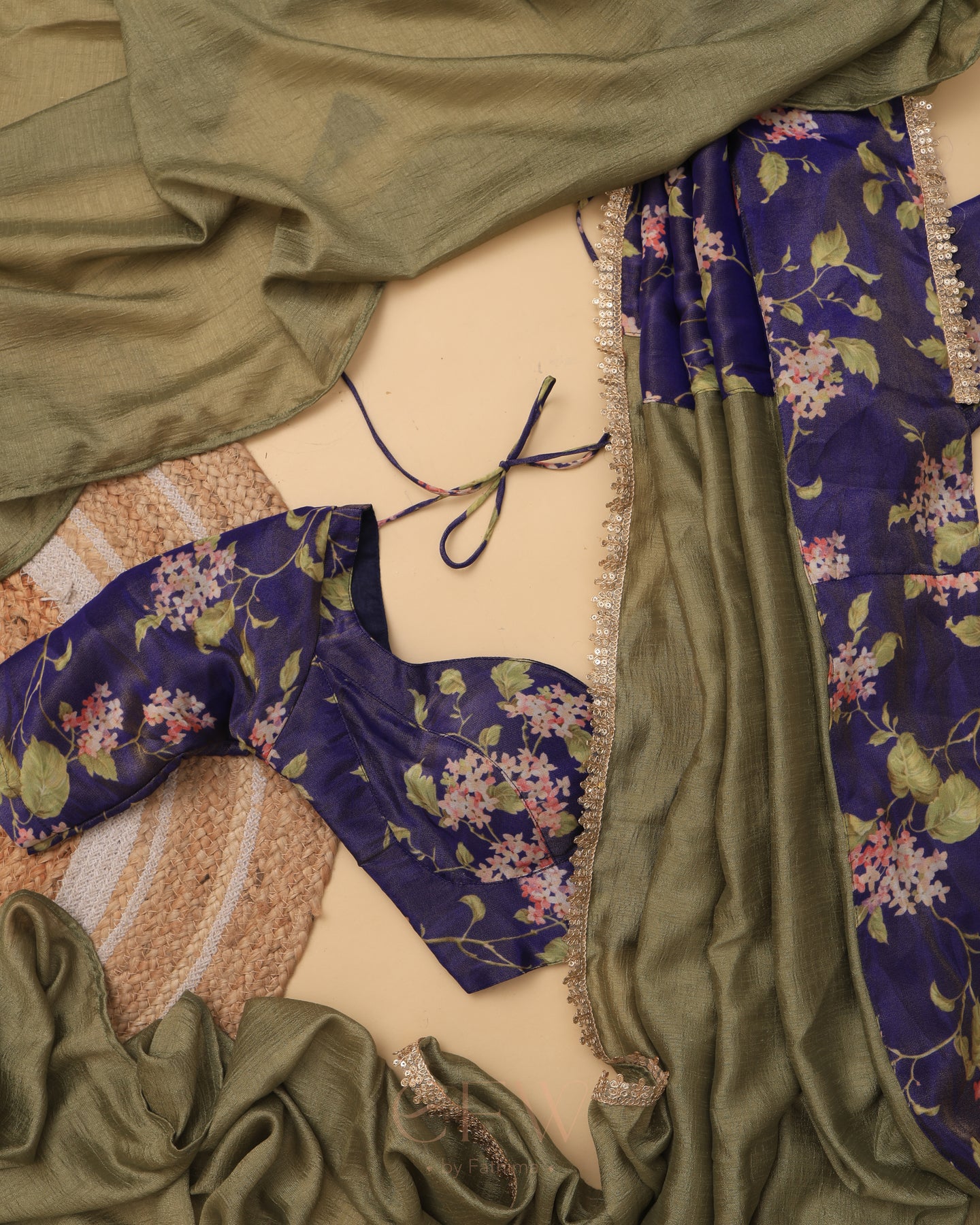 Step into a world where timeless charm meets contemporary elegance with Trishika, a curated ensemble that echoes grace in every fold. Crafted in a fluid moss green drape with a matte finish, the saree exudes quiet luxury, contrasted flawlessly by deep indigo floral panels that breathe life and romance into the piece.