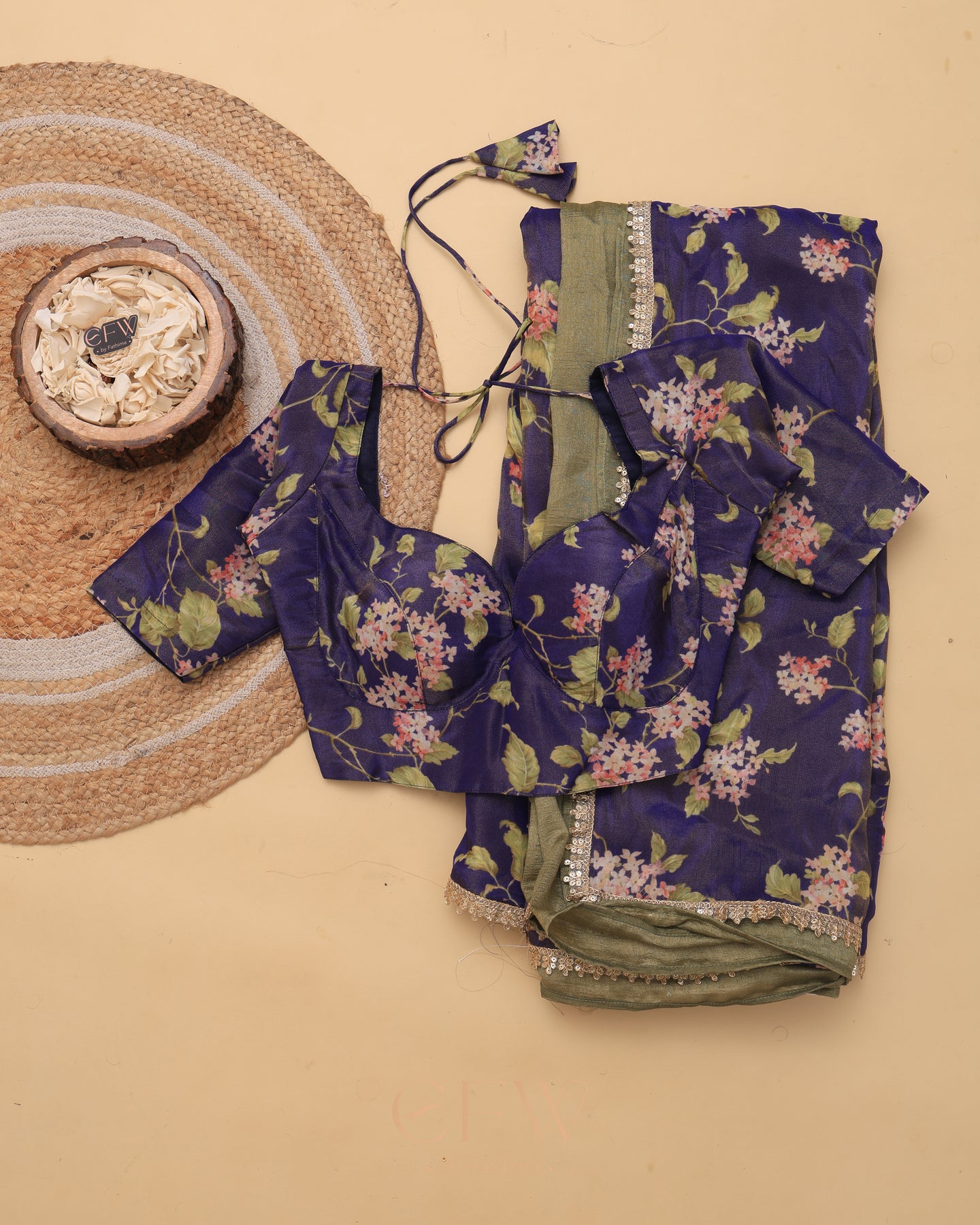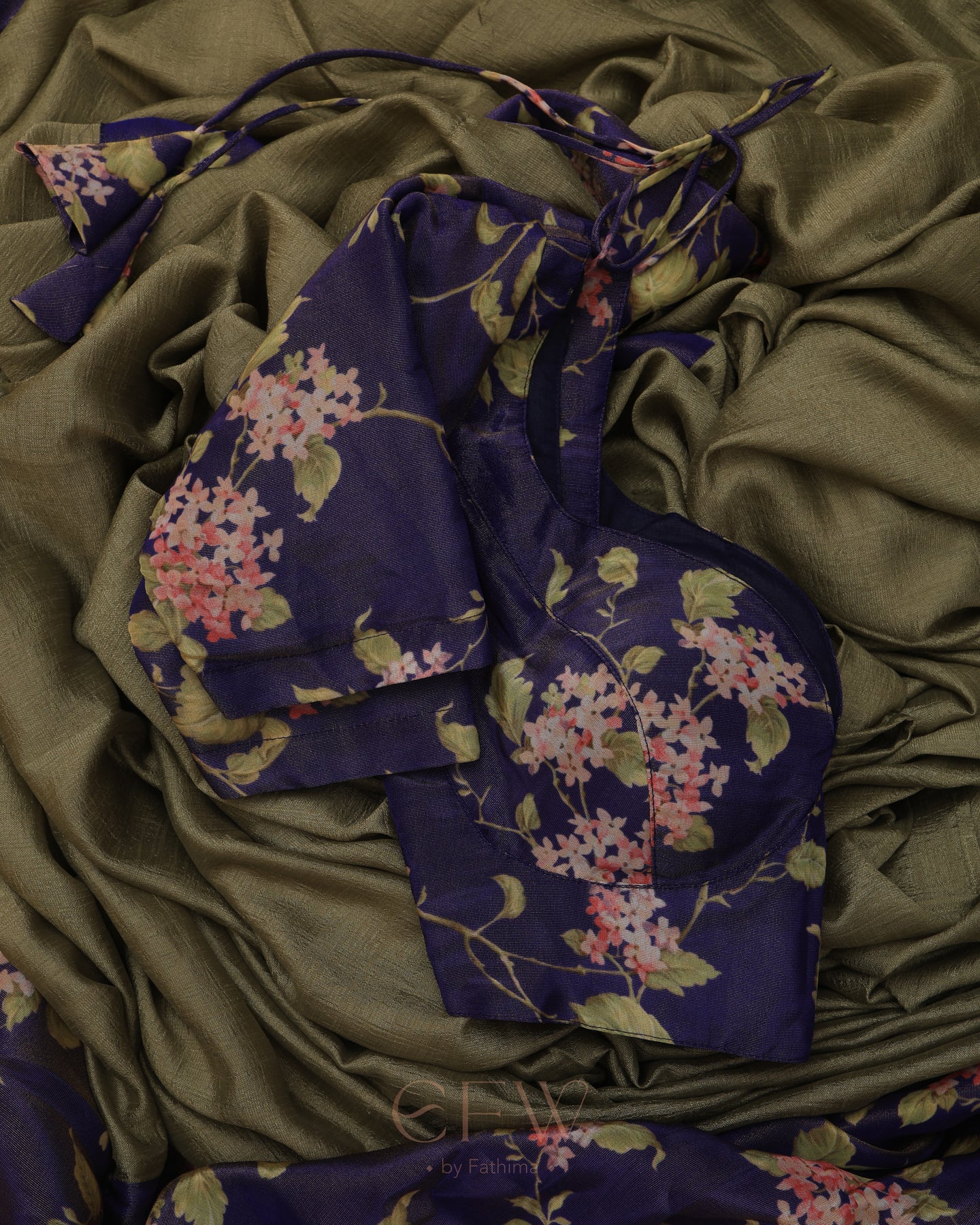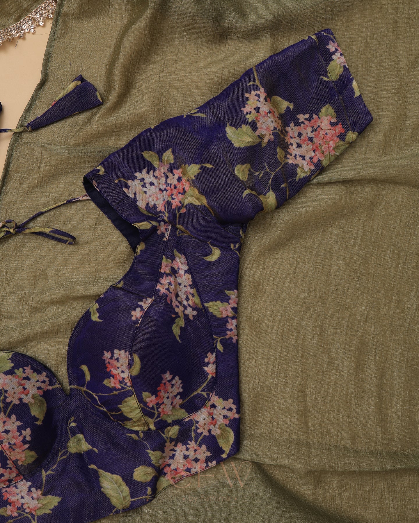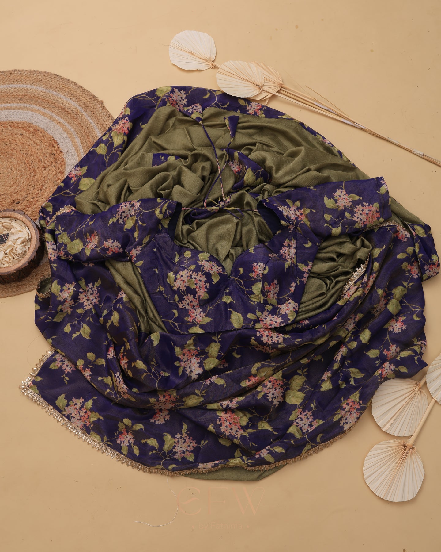 Step into a world where timeless charm meets contemporary elegance with Trishika, a curated ensemble that echoes grace in every fold. Crafted in a fluid moss green drape with a matte finish, the saree exudes quiet luxury, contrasted flawlessly by deep indigo floral panels that breathe life and romance into the piece.