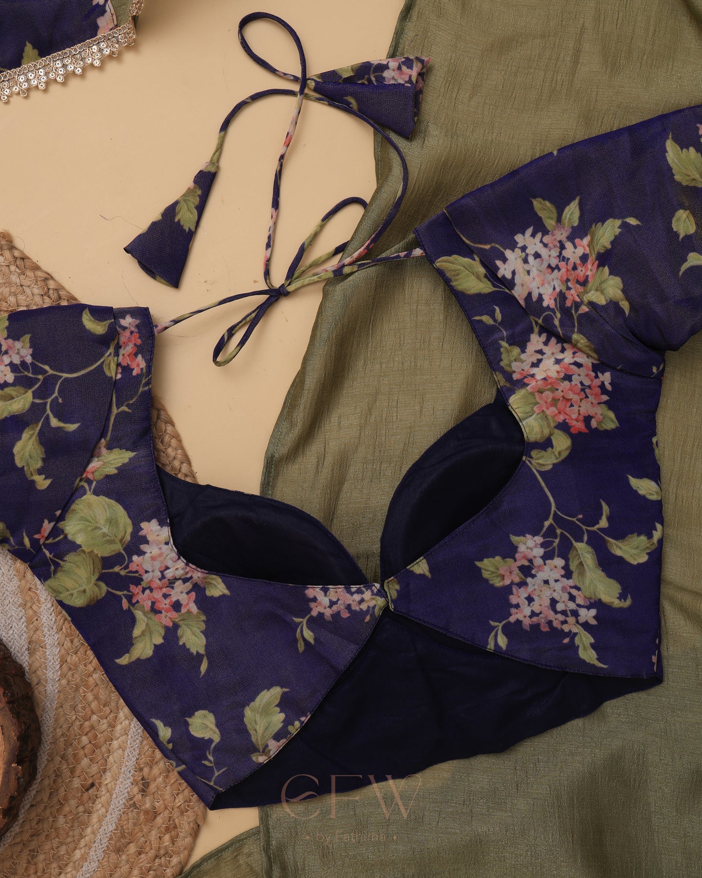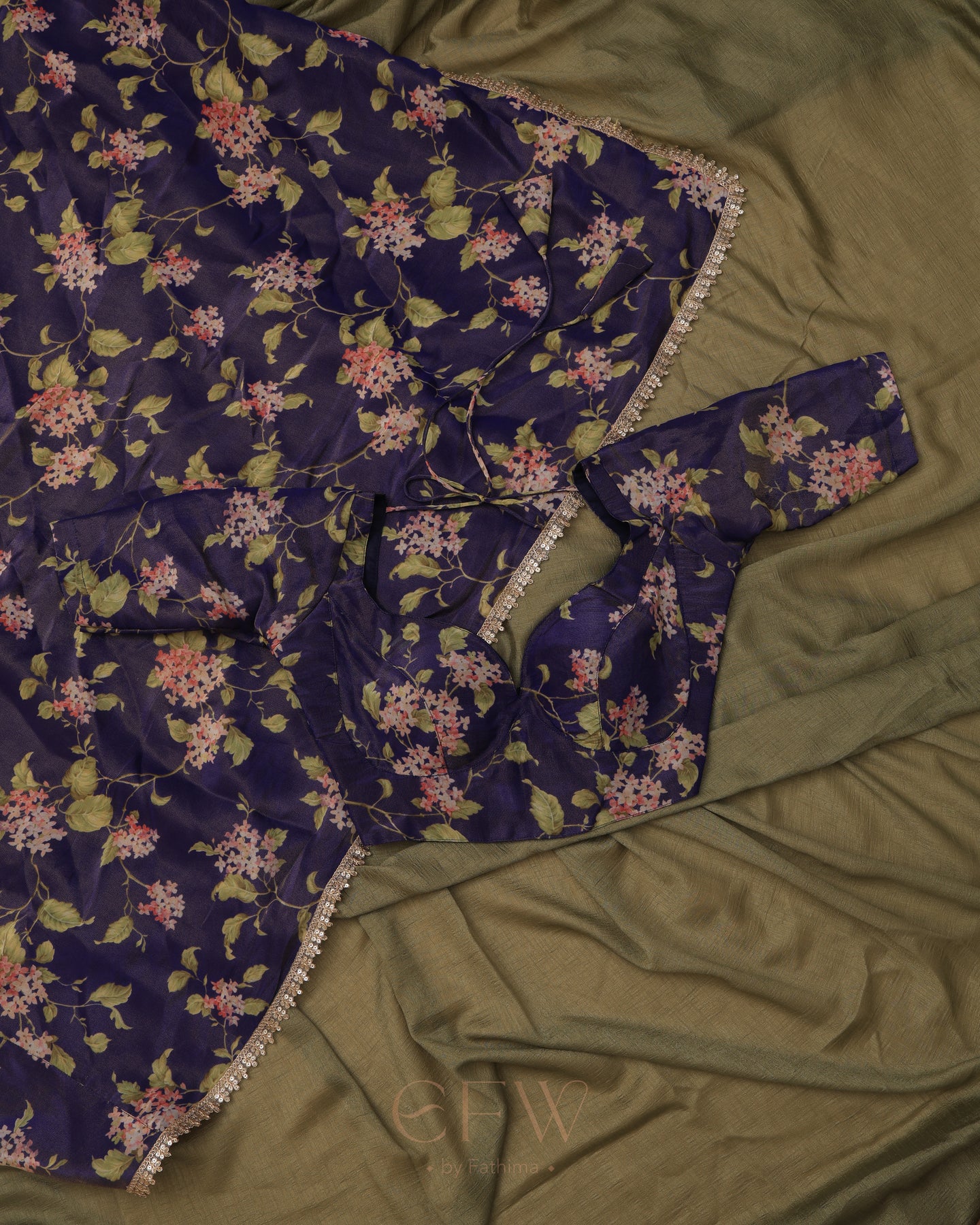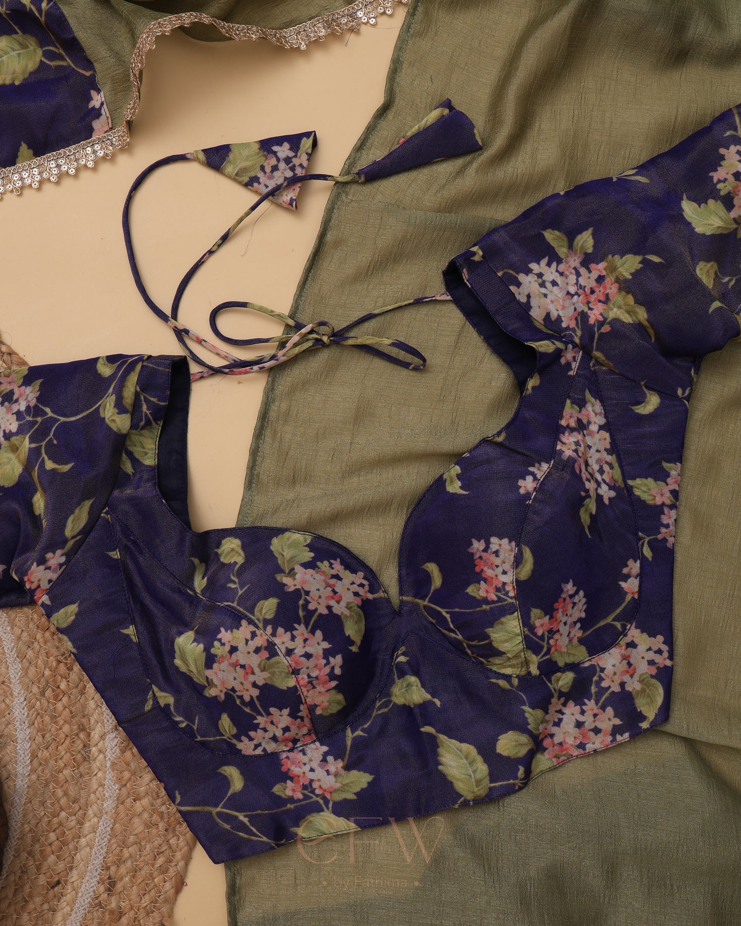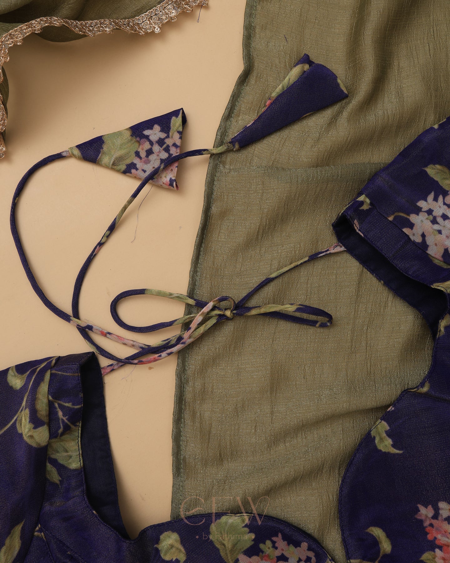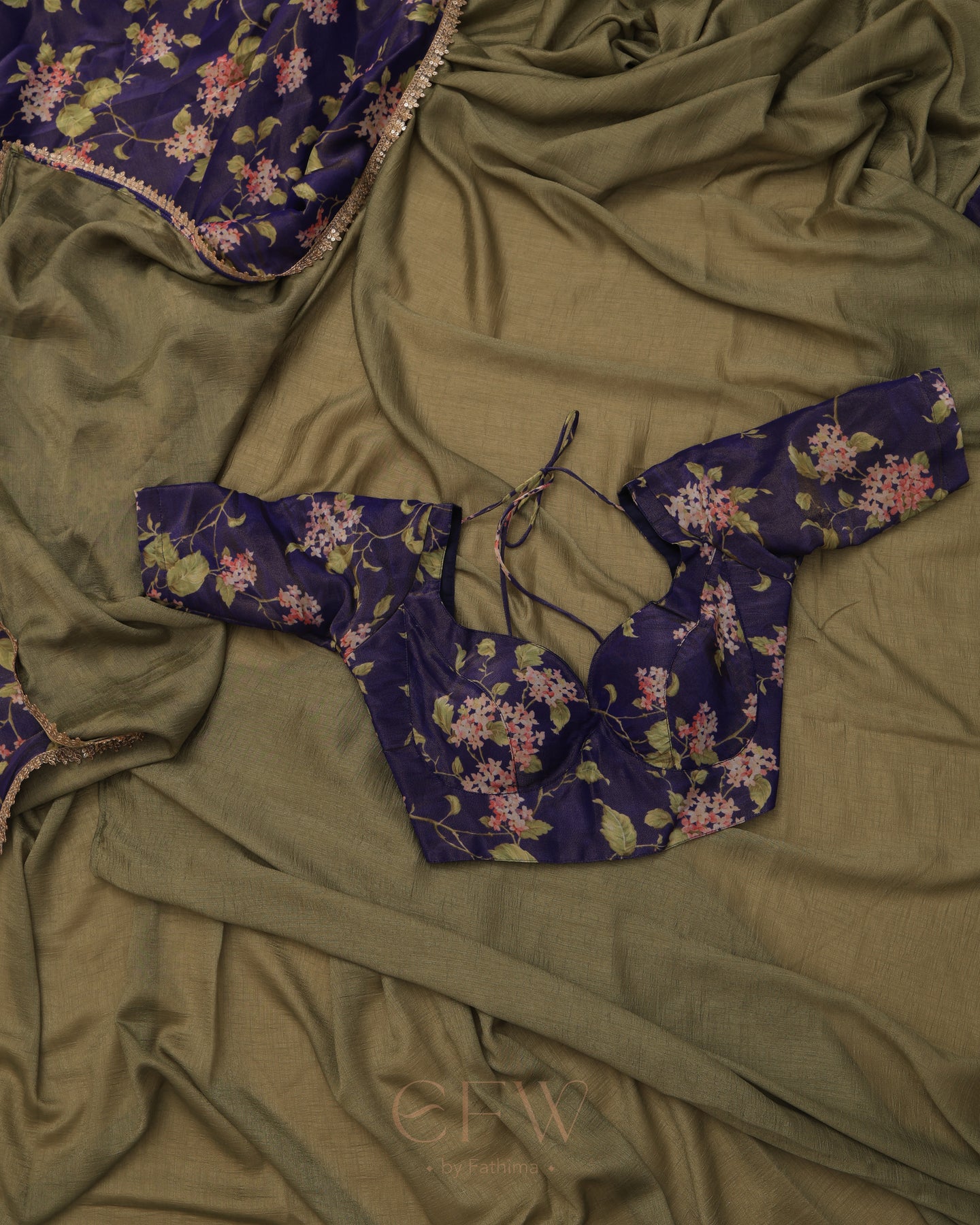 Step into a world where timeless charm meets contemporary elegance with Trishika, a curated ensemble that echoes grace in every fold. Crafted in a fluid moss green drape with a matte finish, the saree exudes quiet luxury, contrasted flawlessly by deep indigo floral panels that breathe life and romance into the piece.