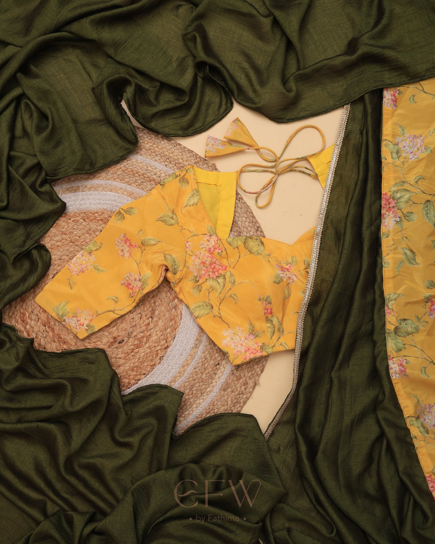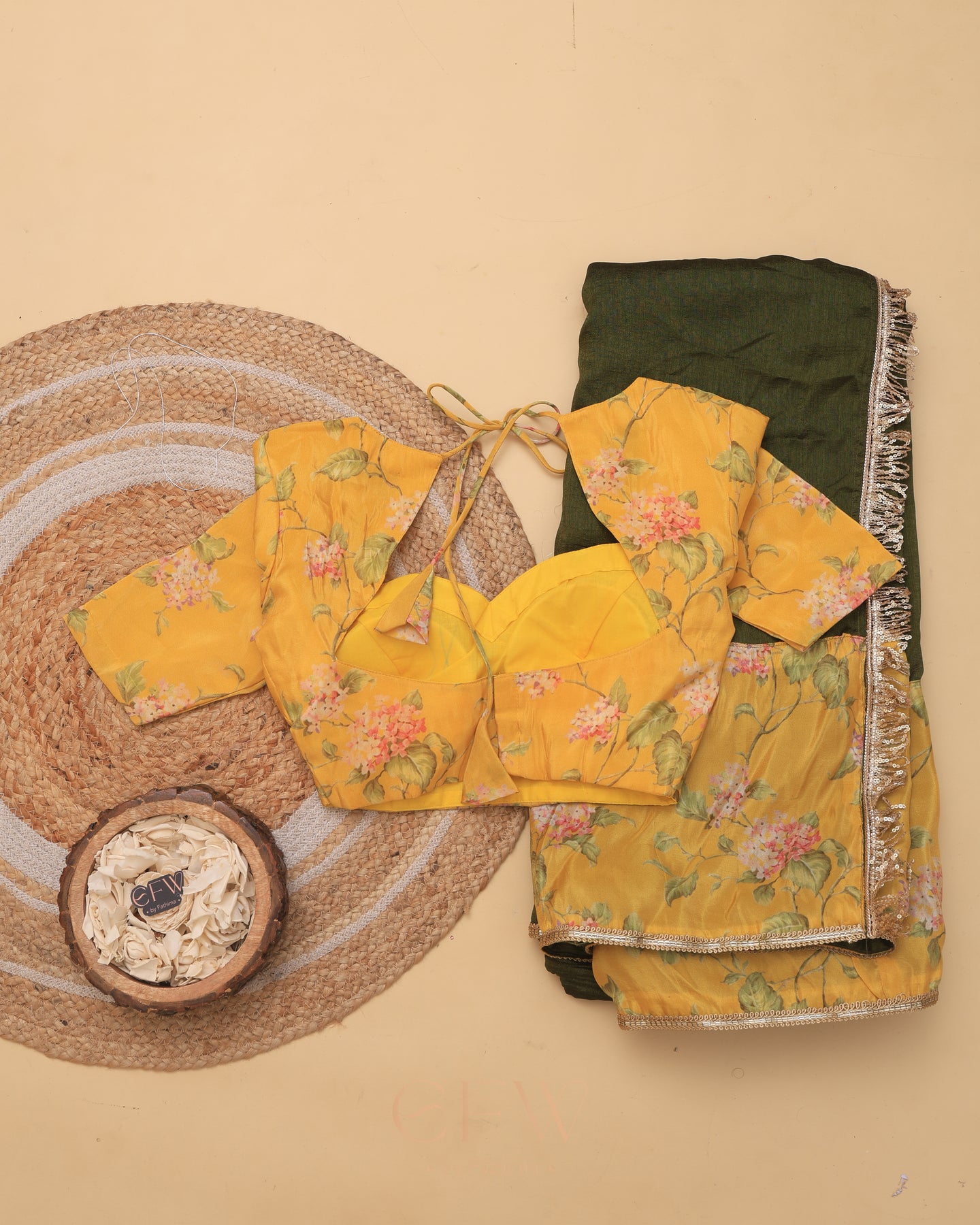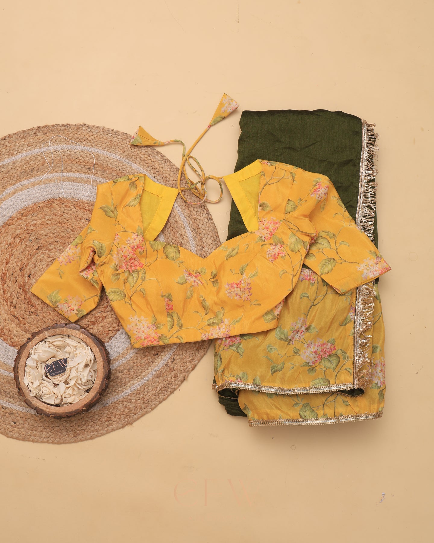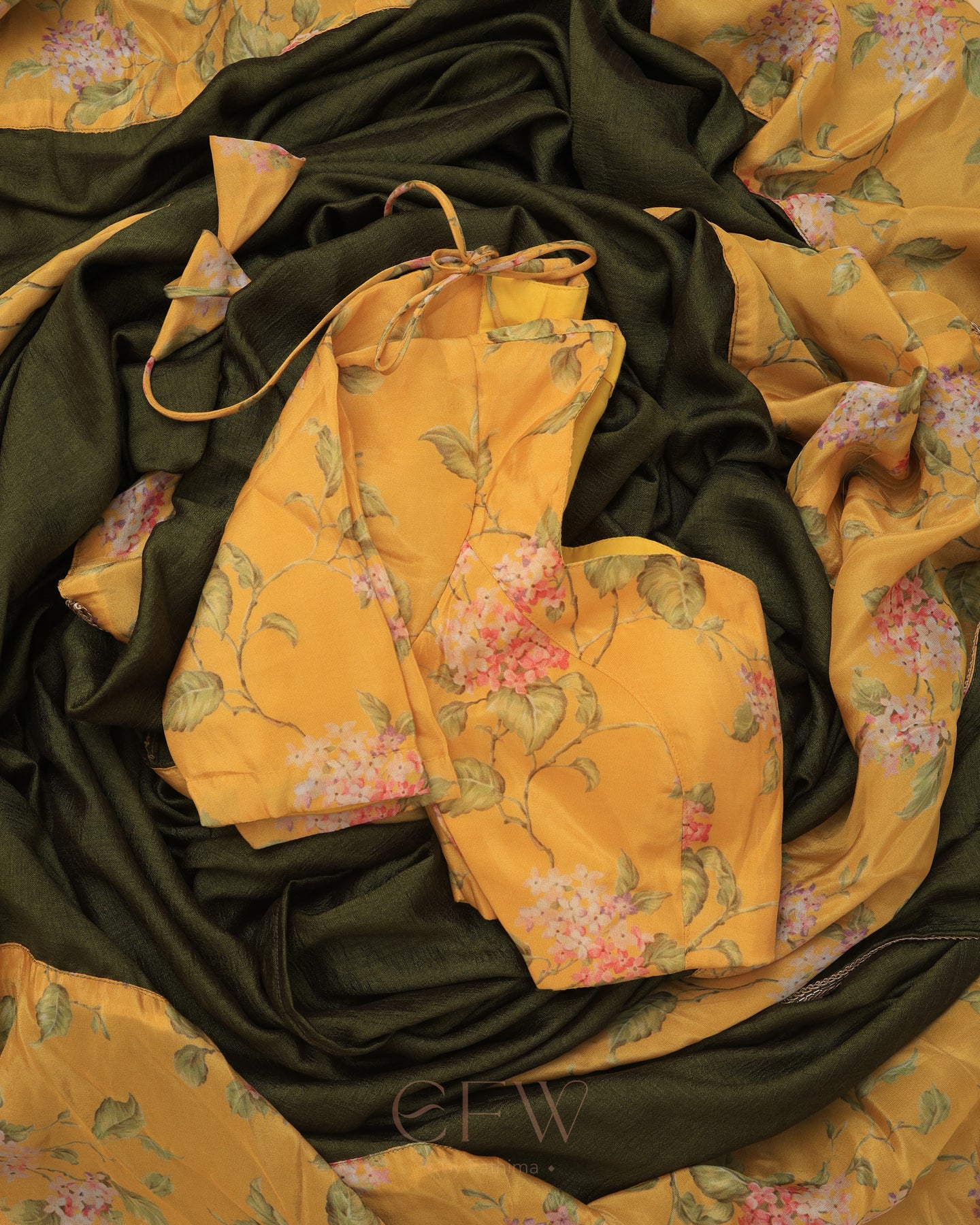 Immerse yourself in the effervescent charm of Vasa—a blouse and saree ensemble that captures the spirit of blooming gardens under golden sunlight. The ensemble opens with a rich mustard yellow base kissed with soft floral imprints in blush pink and leafy olive, set against a fluid drape of deep forest green that adds earthy grounding to the airy vibrance.