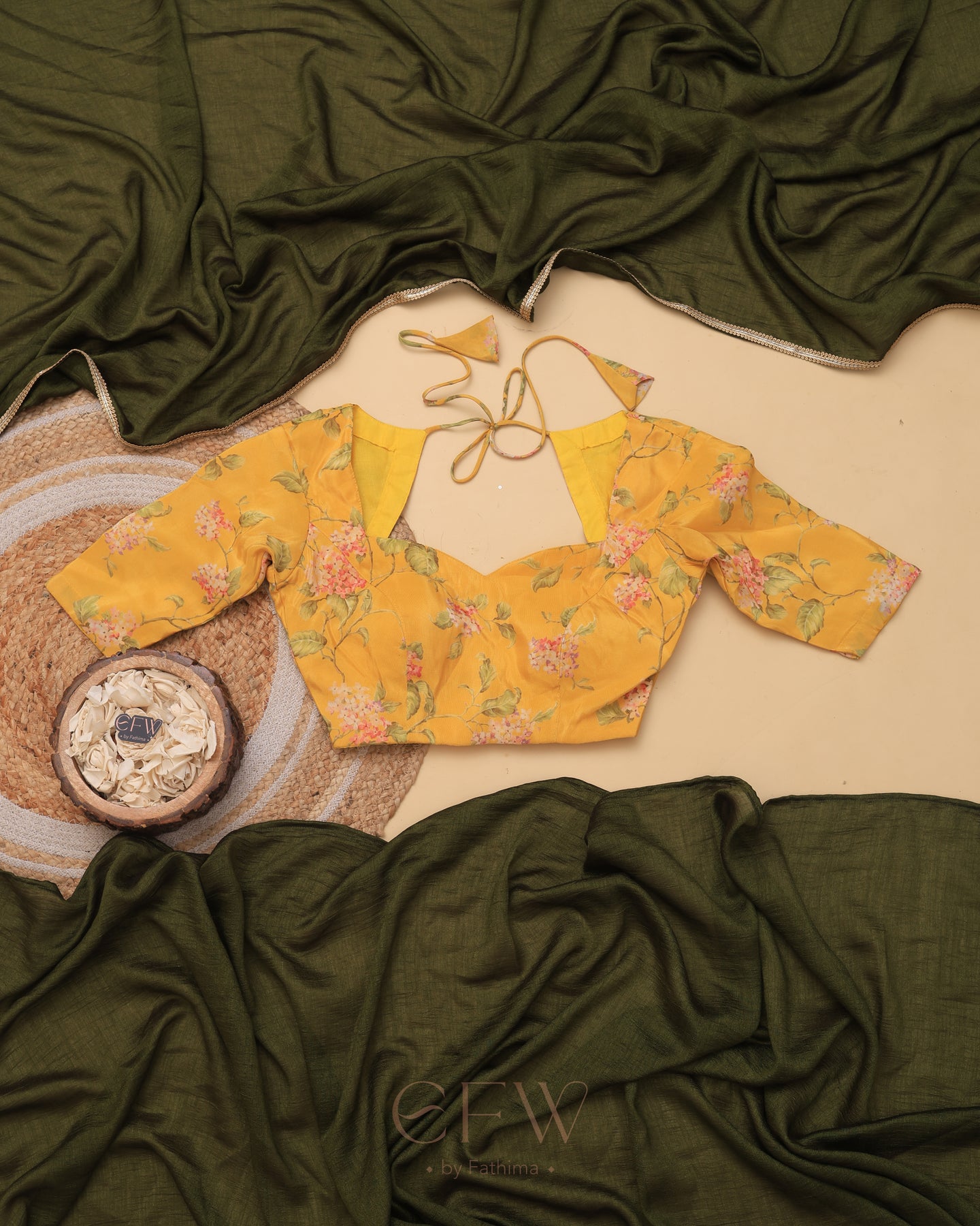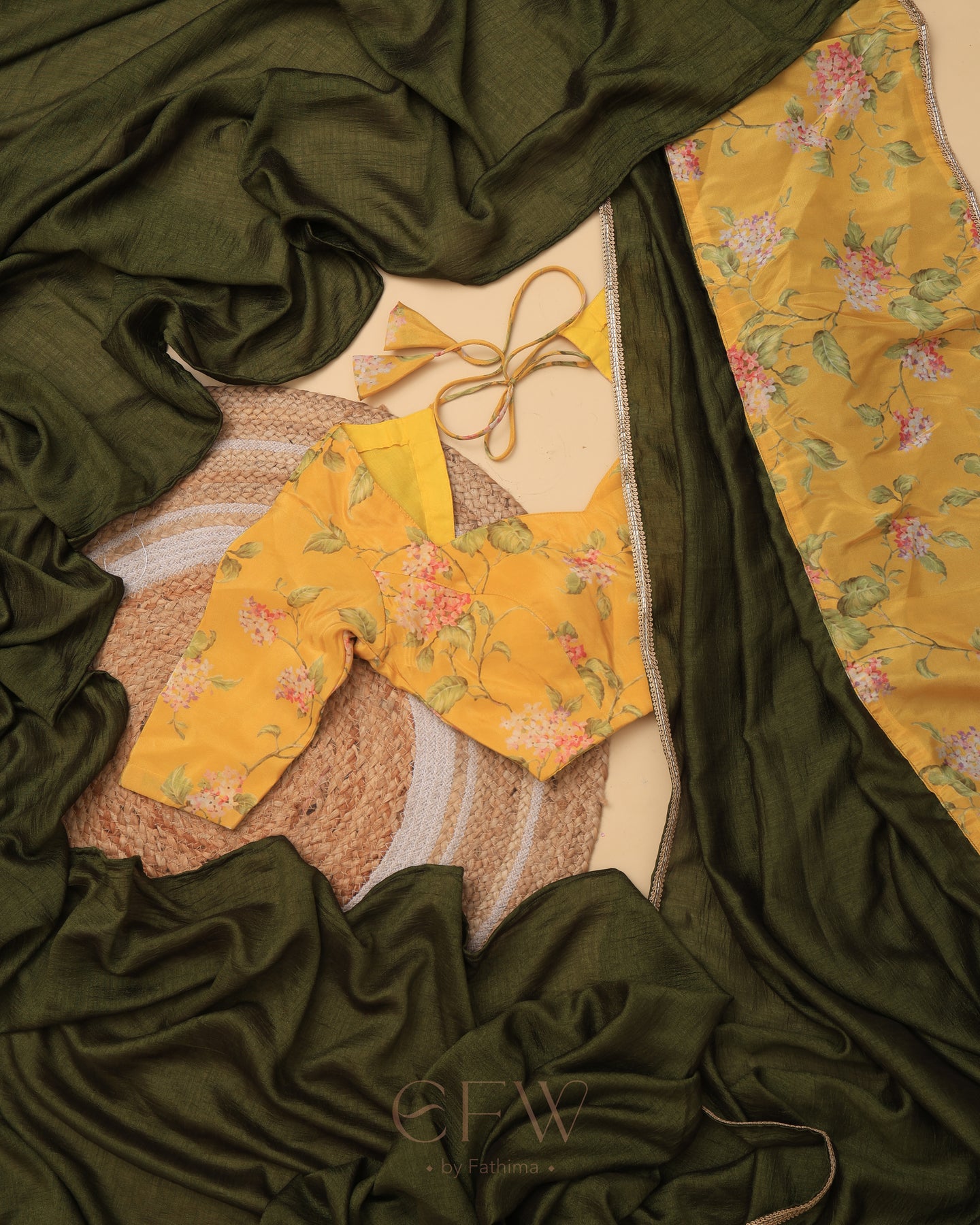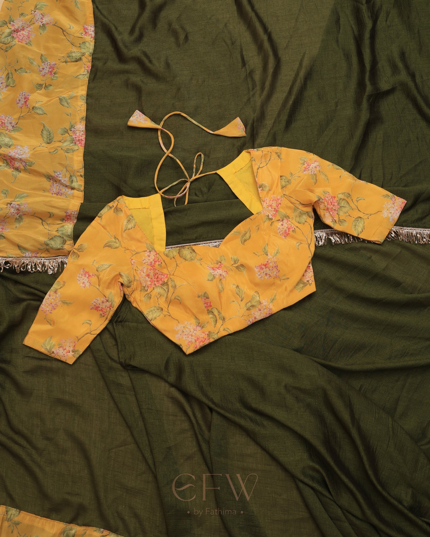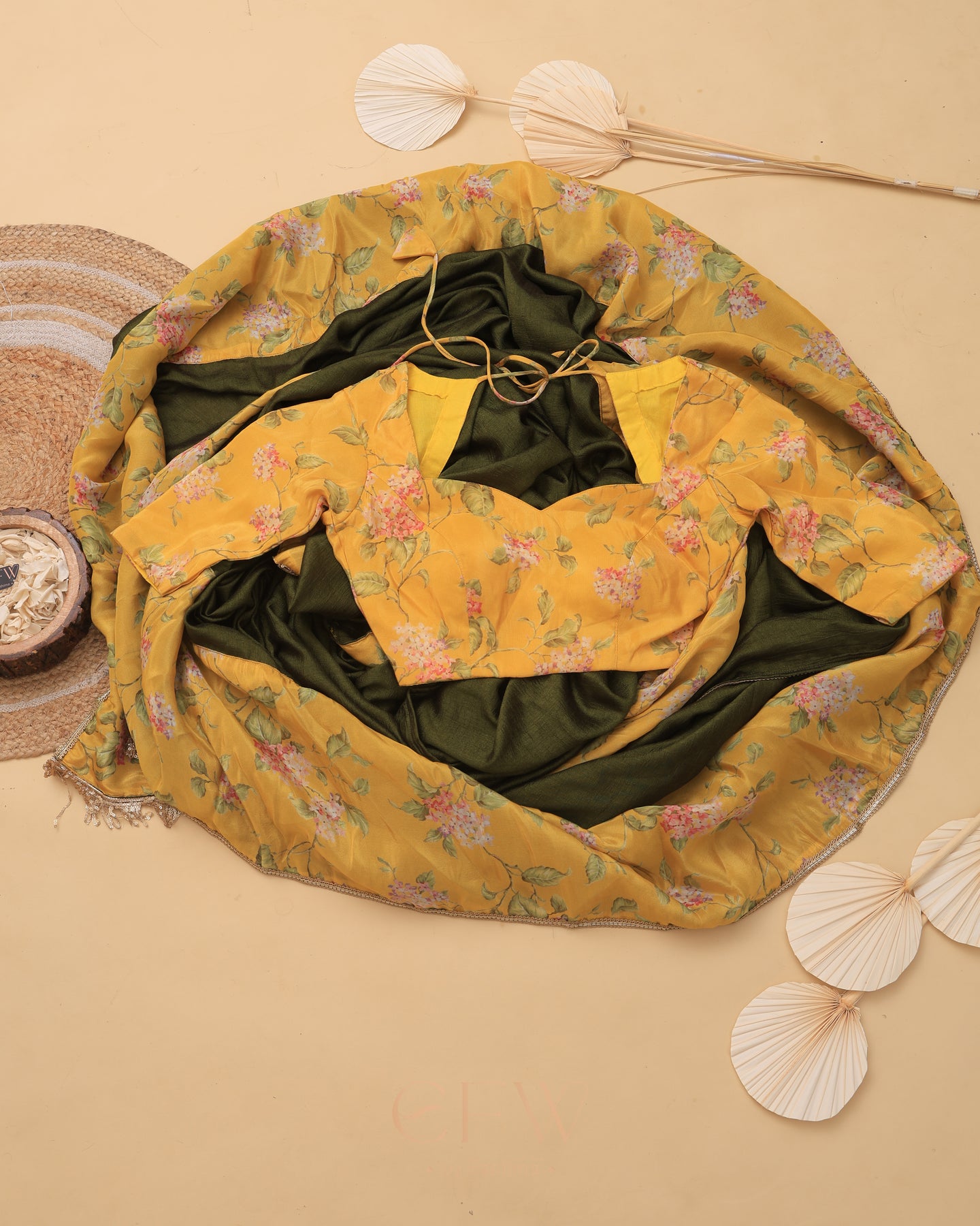 Immerse yourself in the effervescent charm of Vasa—a blouse and saree ensemble that captures the spirit of blooming gardens under golden sunlight. The ensemble opens with a rich mustard yellow base kissed with soft floral imprints in blush pink and leafy olive, set against a fluid drape of deep forest green that adds earthy grounding to the airy vibrance.
