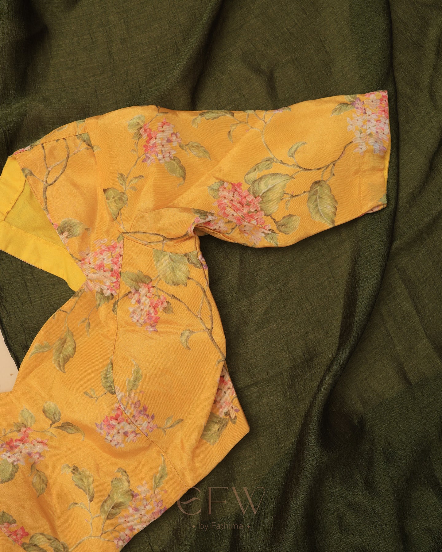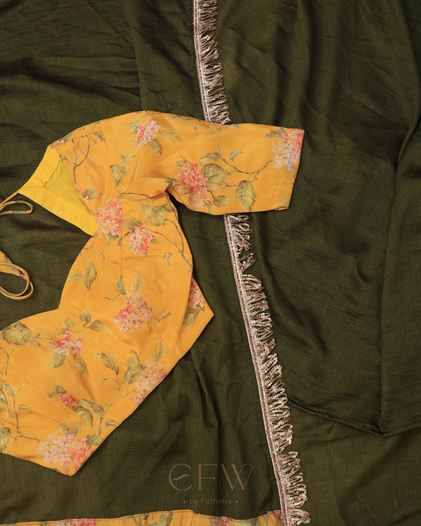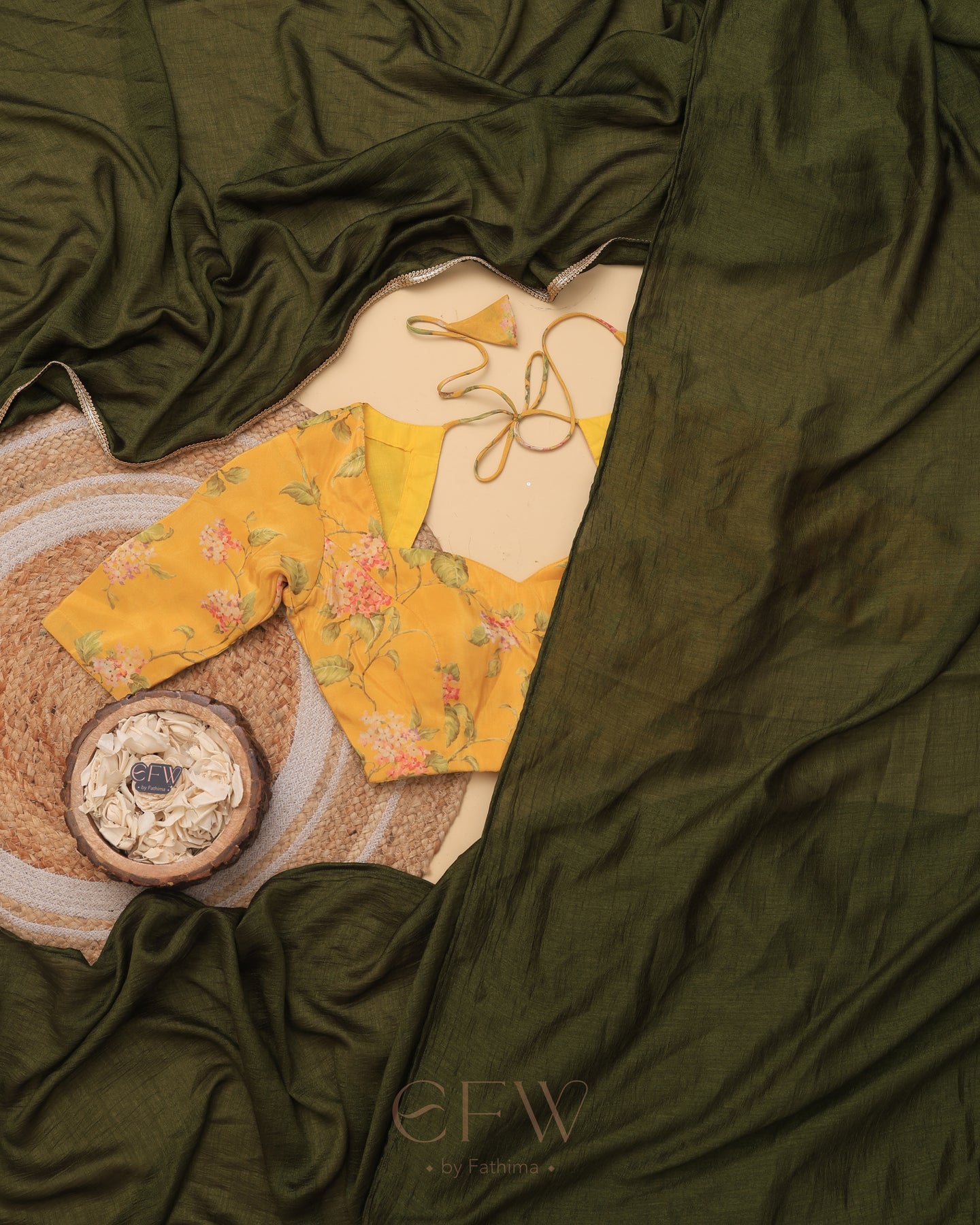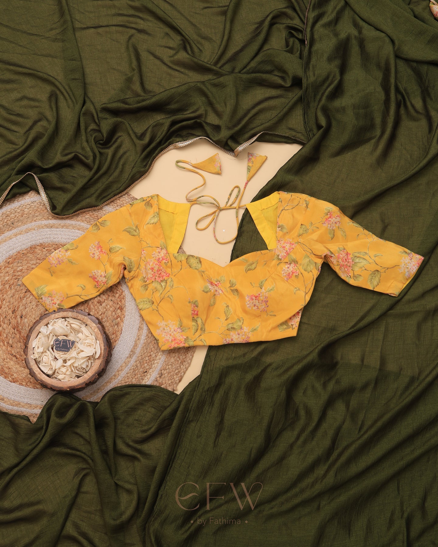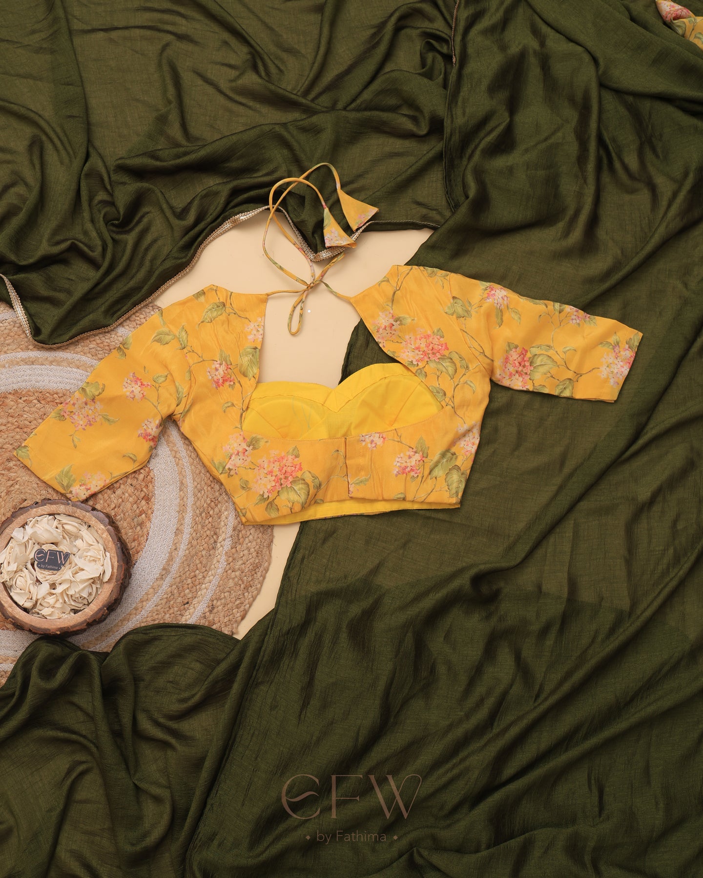 Immerse yourself in the effervescent charm of Vasa—a blouse and saree ensemble that captures the spirit of blooming gardens under golden sunlight. The ensemble opens with a rich mustard yellow base kissed with soft floral imprints in blush pink and leafy olive, set against a fluid drape of deep forest green that adds earthy grounding to the airy vibrance.