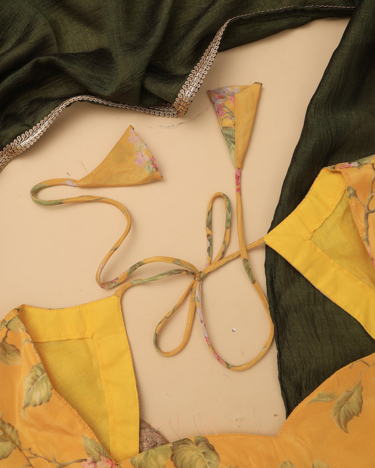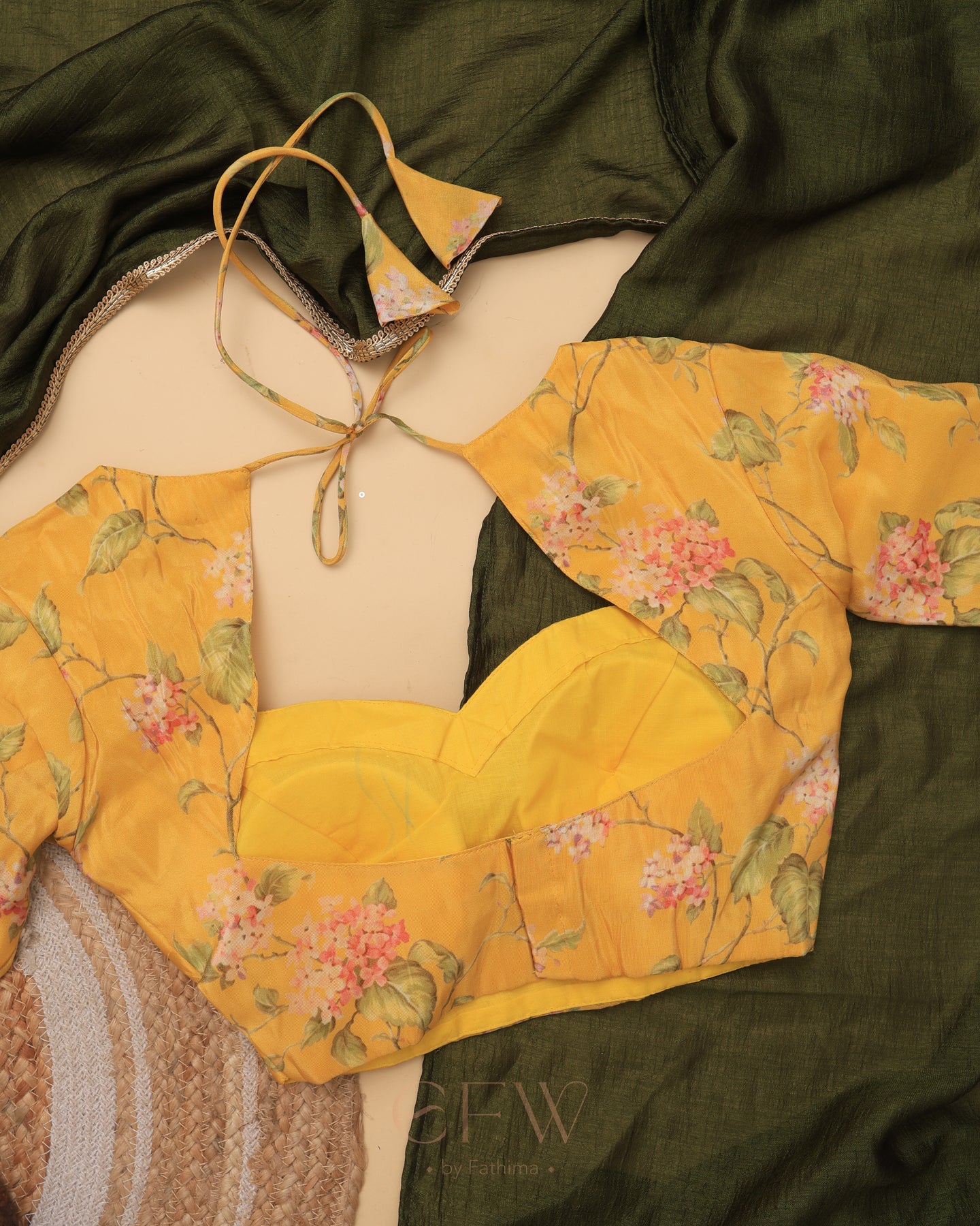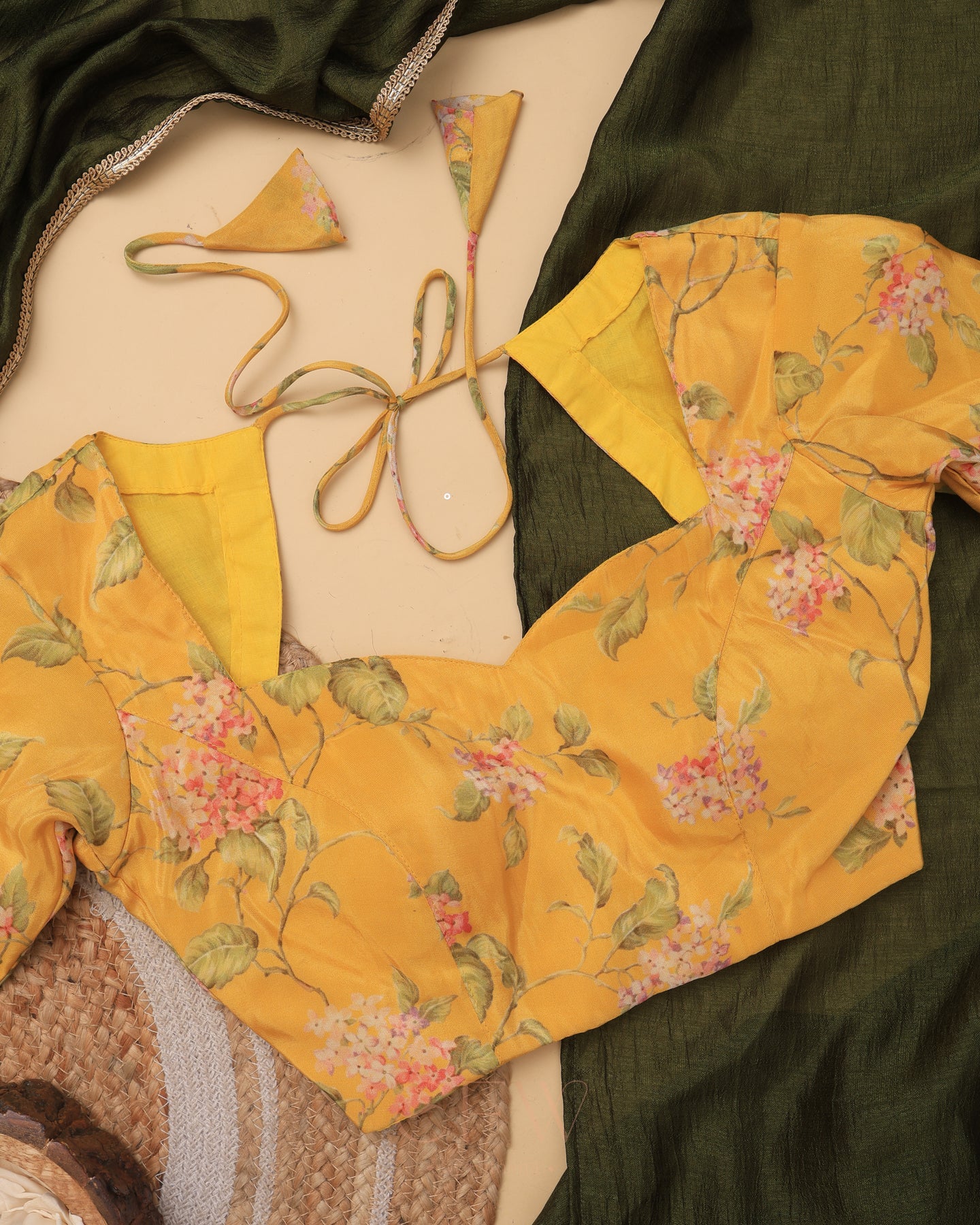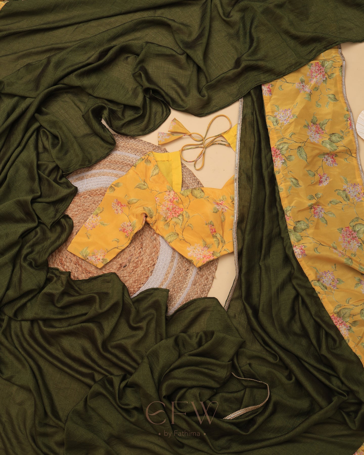 Immerse yourself in the effervescent charm of Vasa—a blouse and saree ensemble that captures the spirit of blooming gardens under golden sunlight. The ensemble opens with a rich mustard yellow base kissed with soft floral imprints in blush pink and leafy olive, set against a fluid drape of deep forest green that adds earthy grounding to the airy vibrance.