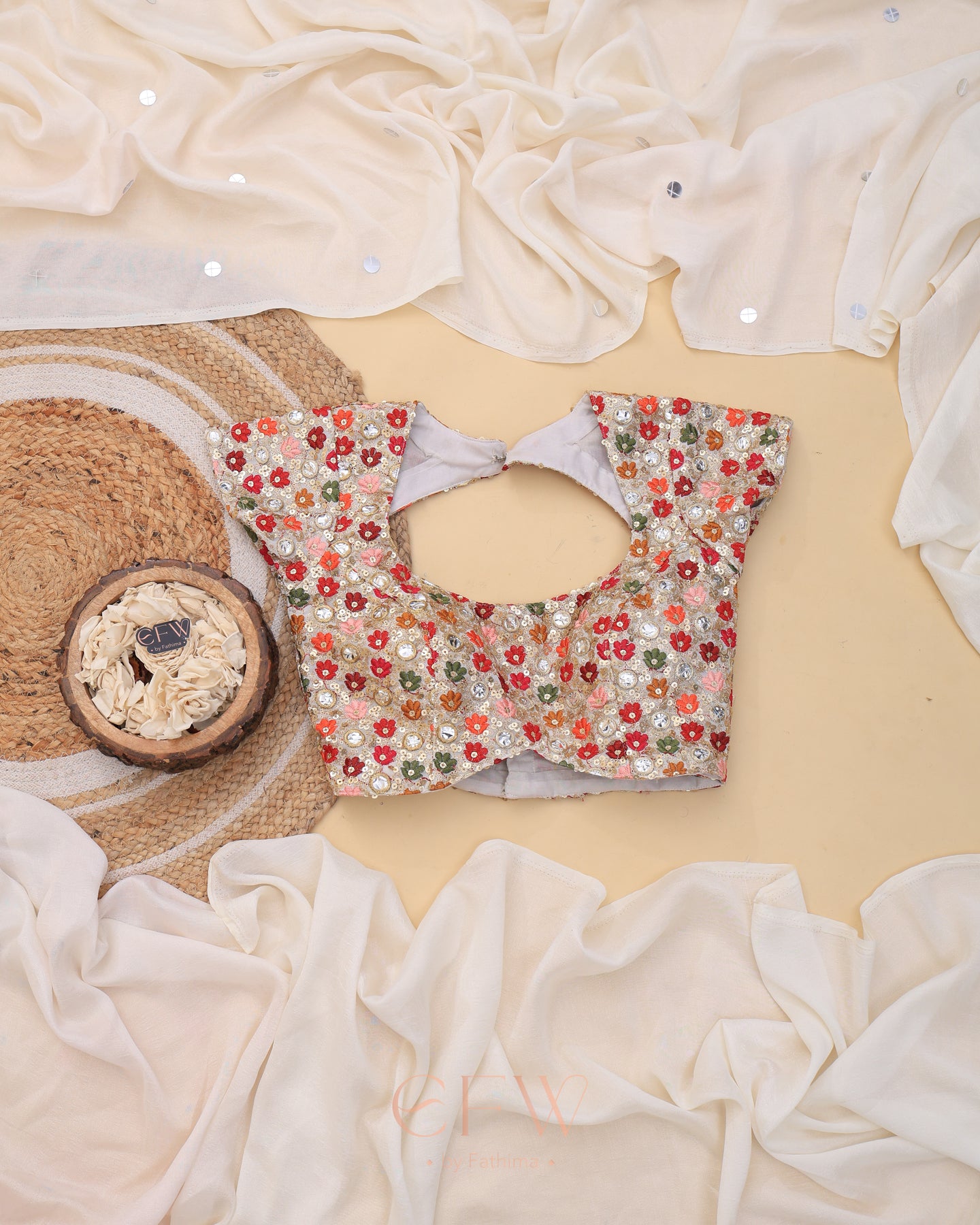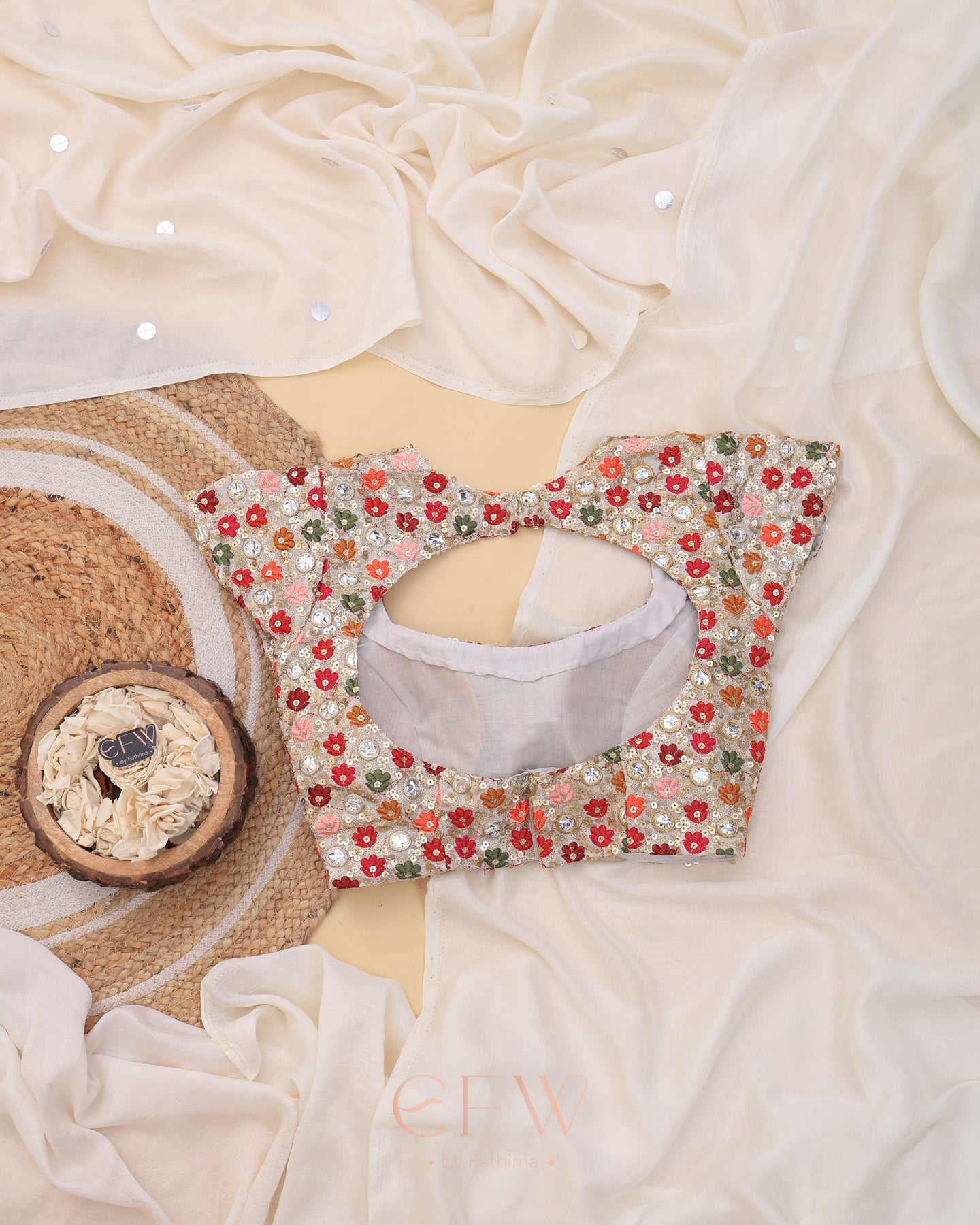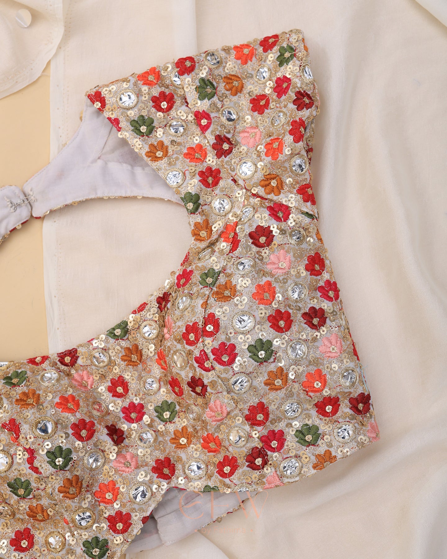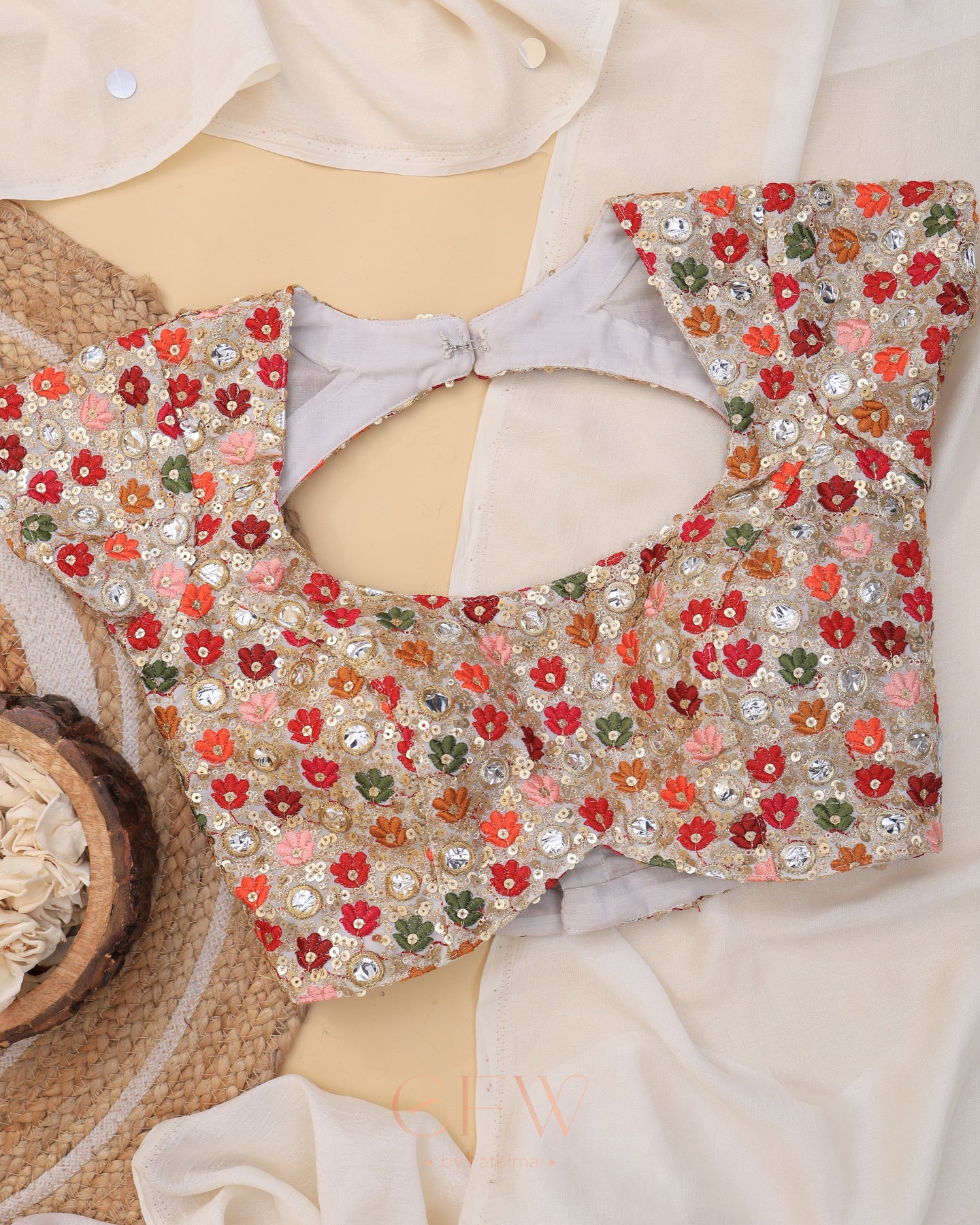 A work of art in itself, the blouse is intricately hand-embroidered with multicolor floral motifs in vibrant reds, oranges, greens, and pinks. Each flower is accented with sequins and mirror embellishments, creating a rich texture that sparkles with movement. The contemporary round front neckline is complemented by a stylish cut-out back, adding a playful yet elegant touch. Short sleeves ensure comfort while maintaining the festive vibe.