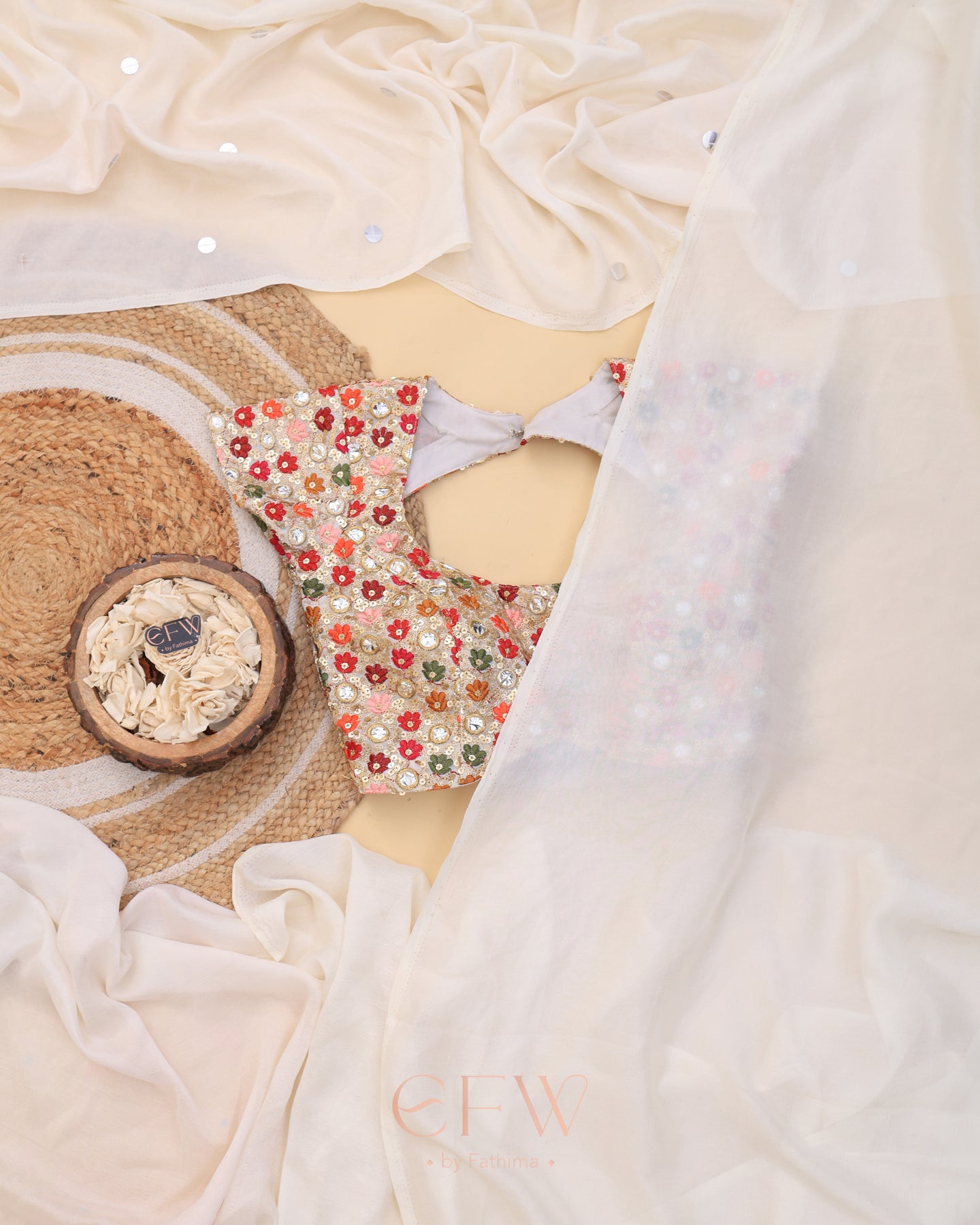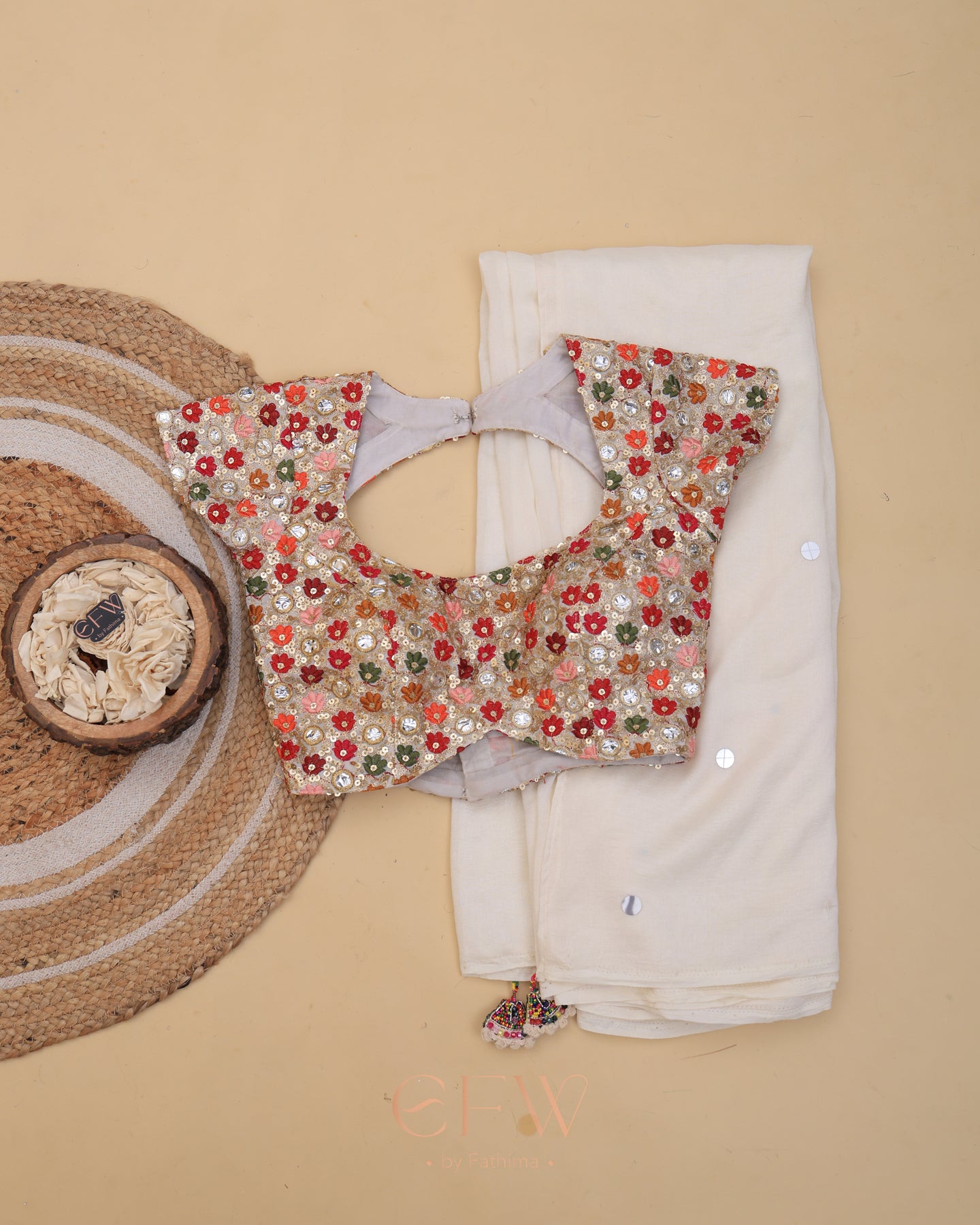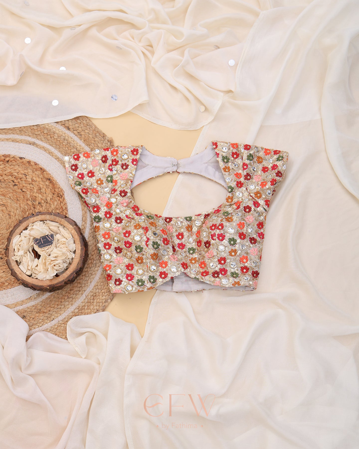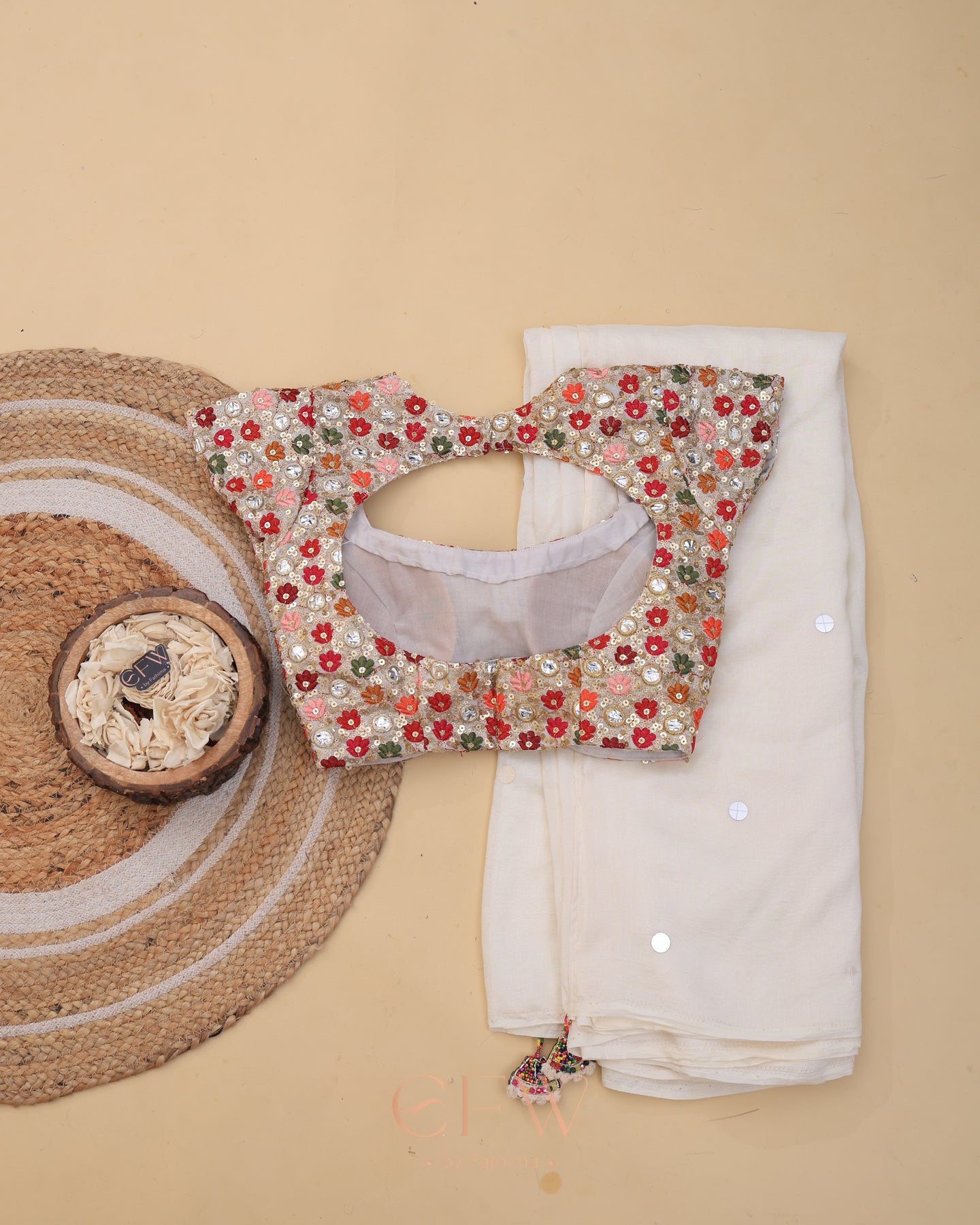 A work of art in itself, the blouse is intricately hand-embroidered with multicolor floral motifs in vibrant reds, oranges, greens, and pinks. Each flower is accented with sequins and mirror embellishments, creating a rich texture that sparkles with movement. The contemporary round front neckline is complemented by a stylish cut-out back, adding a playful yet elegant touch. Short sleeves ensure comfort while maintaining the festive vibe.