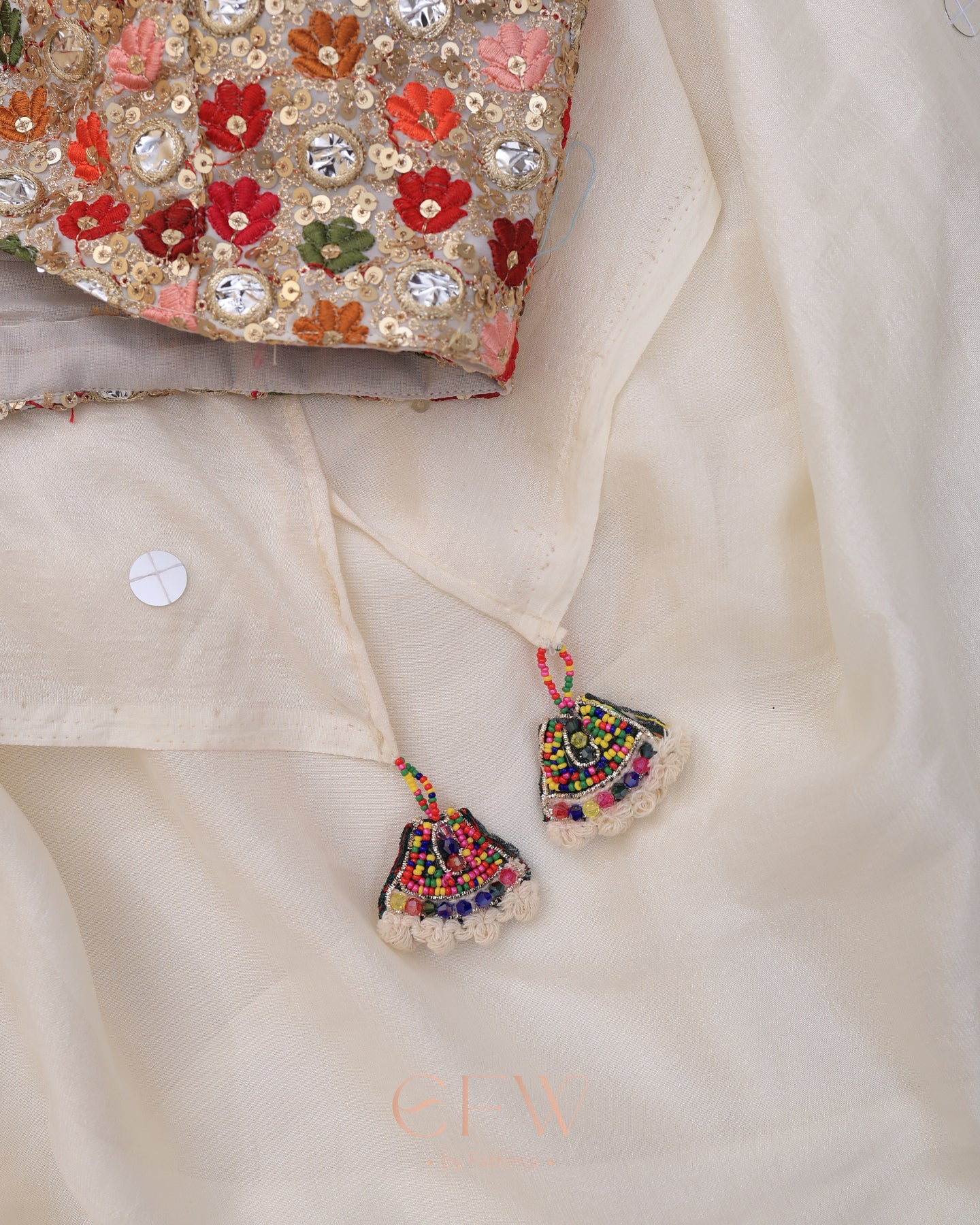 The pallu is adorned with artisanal multicolor beaded tassels featuring intricate threadwork and miniature bead clusters. These tassels sway gracefully, tying together the blouse’s color palette and adding a bohemian twist to the refined ivory saree.