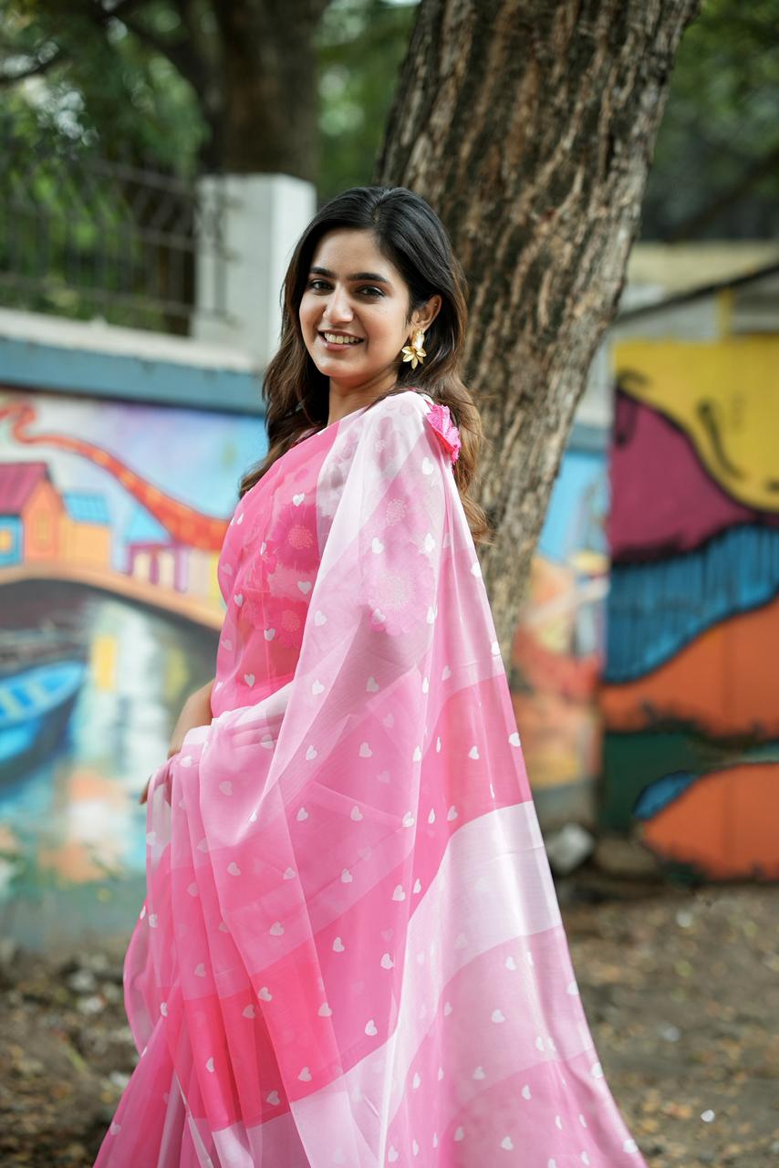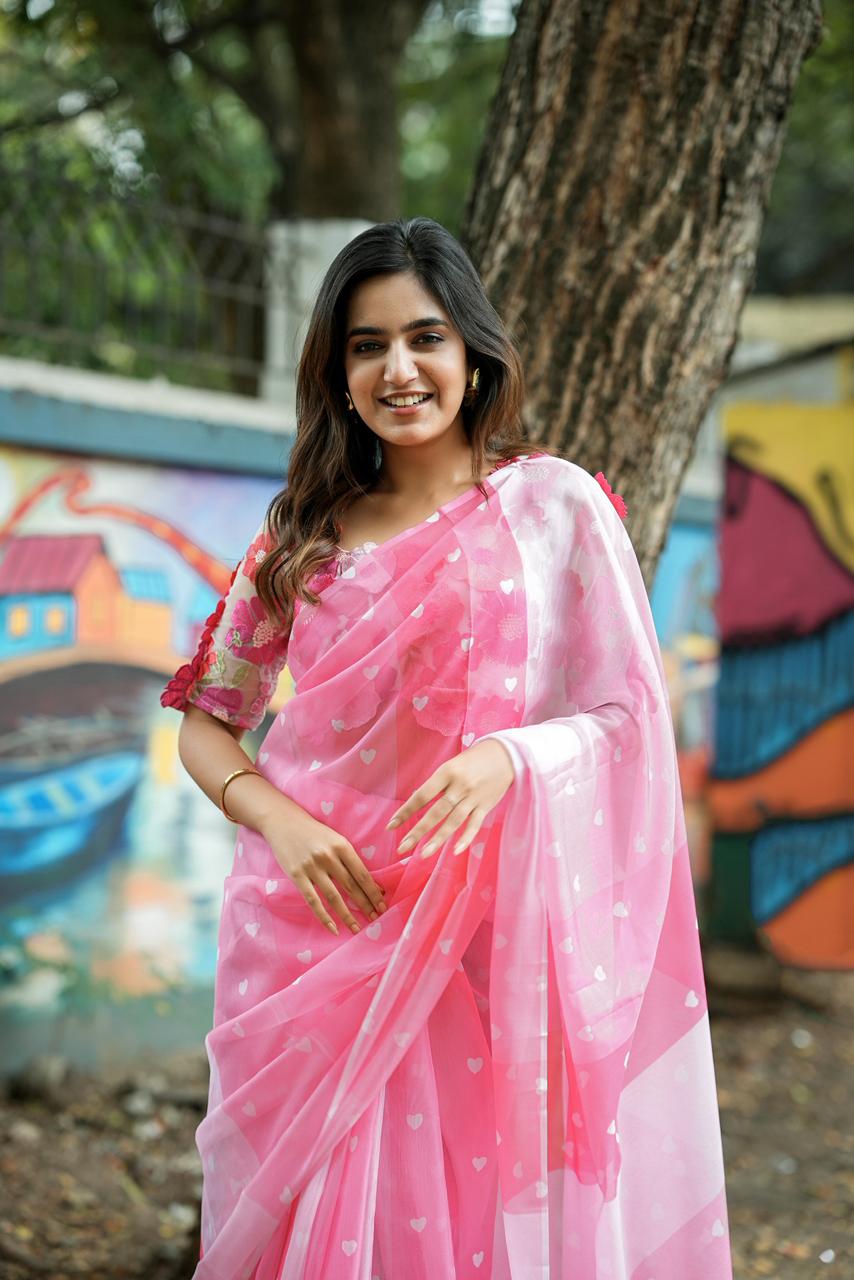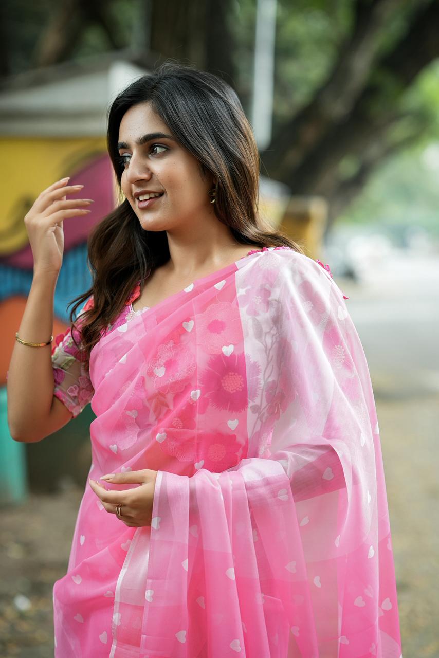 The Blossomia Heartbloom Saree Set is a dreamy celebration of romance, colour, and feminine charm. Crafted in a refreshing shade of bubblegum pink, the saree flows gently with soft translucent layers patterned with delicate white heart motifs — adding a playful, youthful touch to its drape. Lightweight and airy, it creates a whimsical silhouette that feels perfect for daytime festivities or cheerful celebrations.