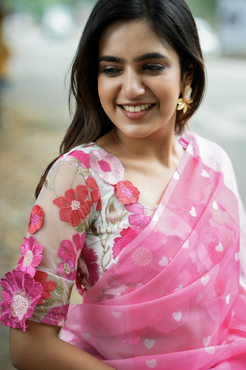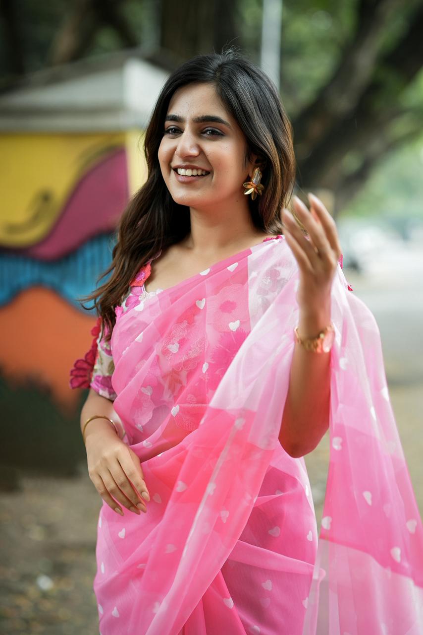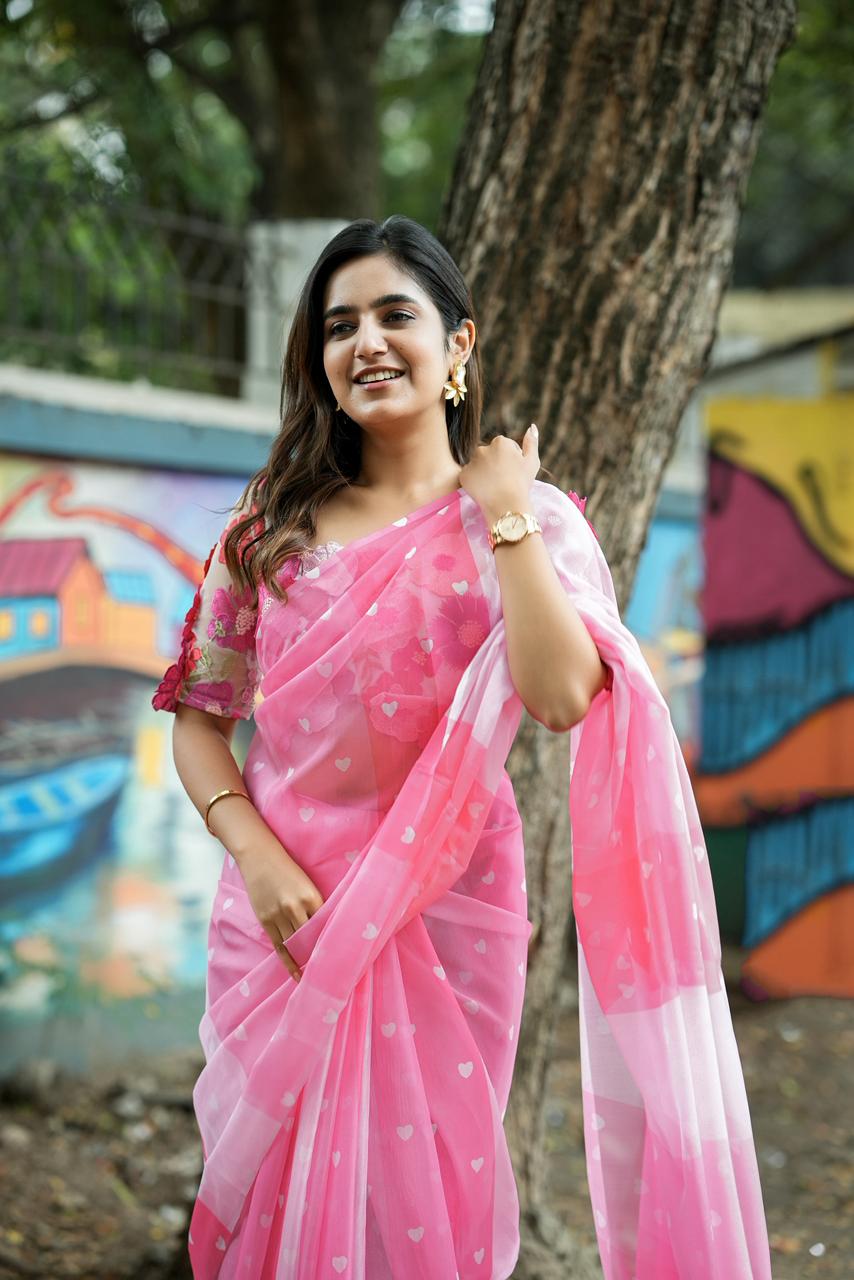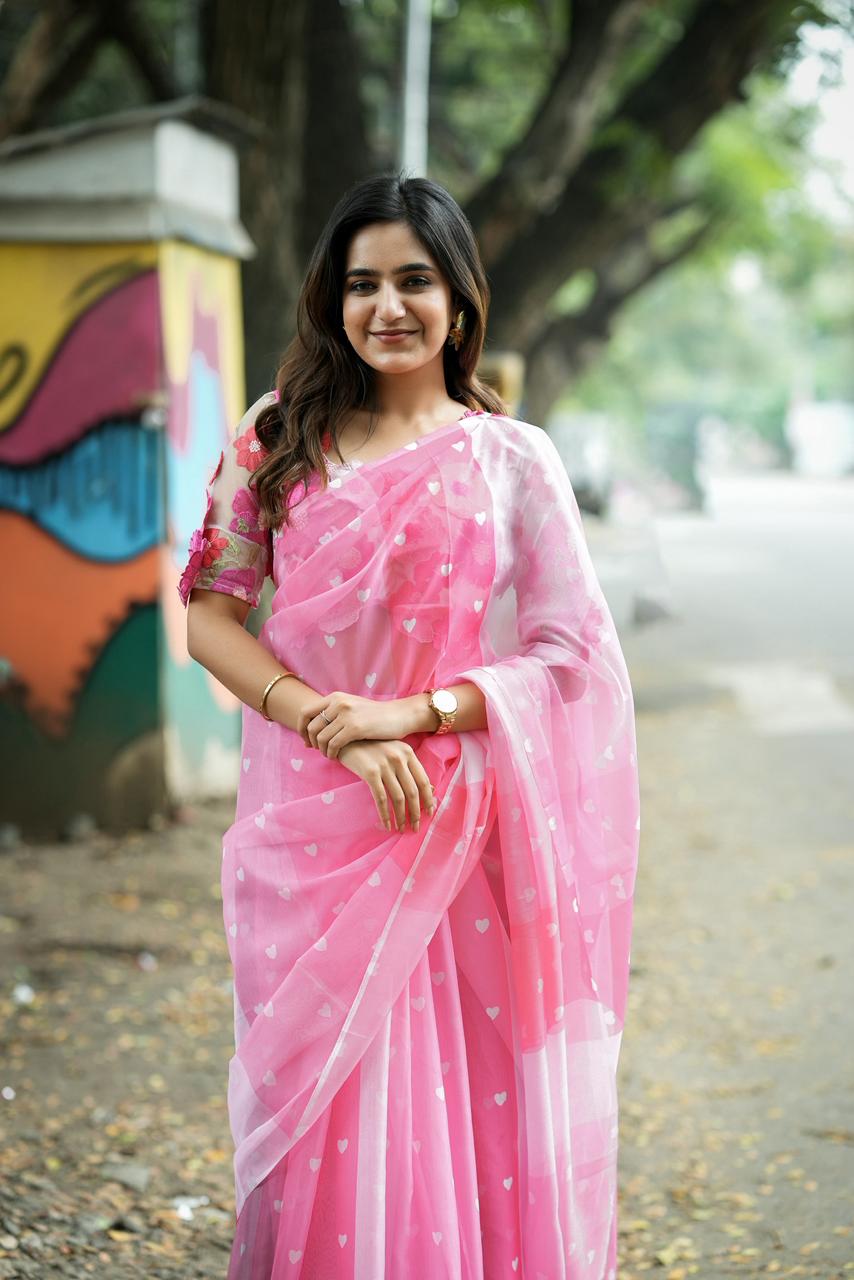 The Blossomia Heartbloom Saree Set is a dreamy celebration of romance, colour, and feminine charm. Crafted in a refreshing shade of bubblegum pink, the saree flows gently with soft translucent layers patterned with delicate white heart motifs — adding a playful, youthful touch to its drape. Lightweight and airy, it creates a whimsical silhouette that feels perfect for daytime festivities or cheerful celebrations.