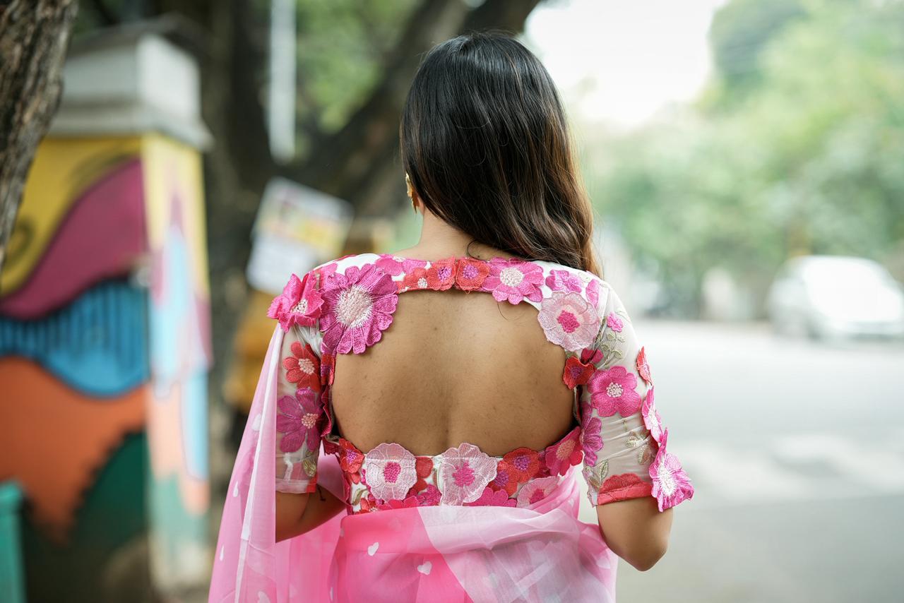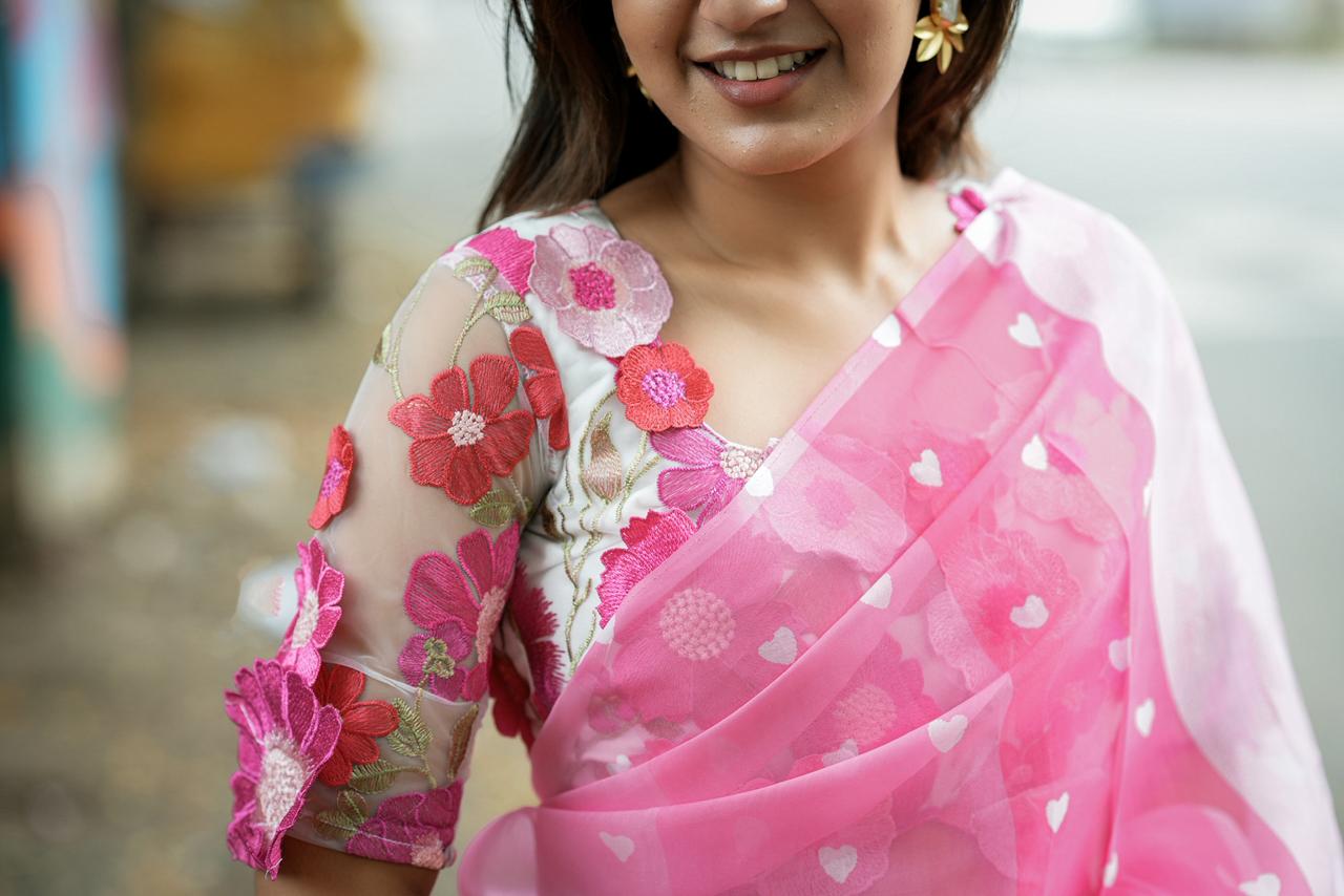 The show-stealer is the stunning 3D floral blouse adorned with exquisite embroidered blossoms in shades of fuchsia, rose pink, blush, and magenta. Each flower is delicately layered, creating a dimensional, handcrafted garden effect that instantly elevates the ensemble. The sheer shoulders and sculpted neckline enhance its romantic elegance.