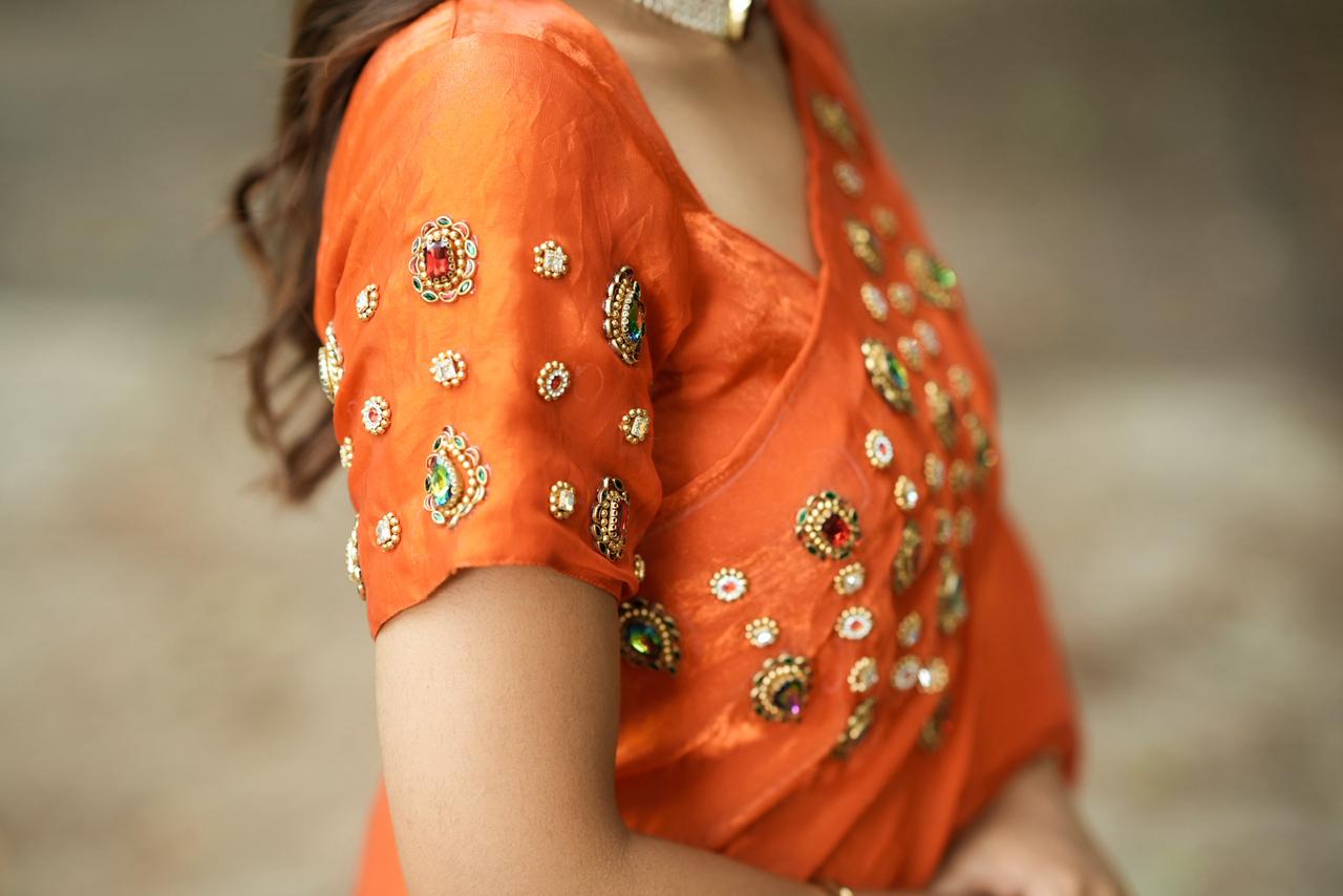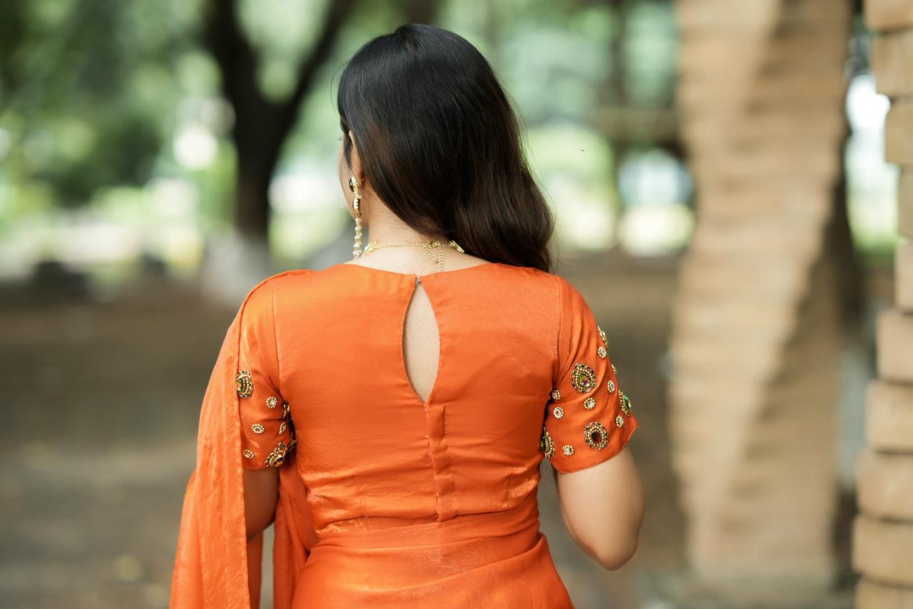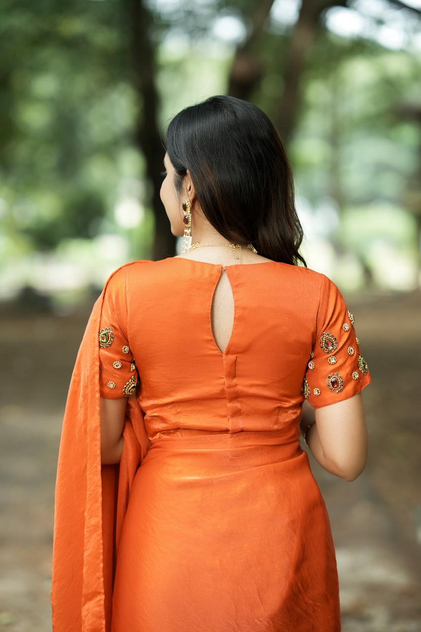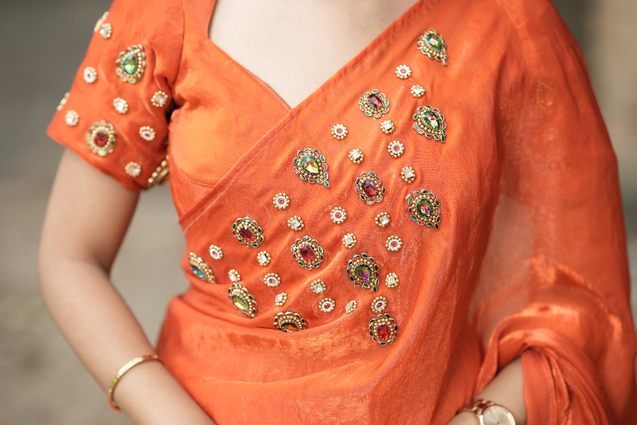 The Citrine Glow Saree Set captures the radiance of the golden hour, beautifully woven into fabric form. Drenched in a vivid, glowing shade of citrine orange, the saree drapes with a natural, fluid grace that makes every movement shimmer softly. Its rich yet lightweight texture creates a silhouette that is both festive and effortlessly refined. The highlight of the saree and blouse is the intricately embellished blouse, adorned with stunning multi-stone kundan-style motifs in shades of ruby, emerald, and pearl. Each stone is meticulously set in ornate gold detailing, creating a captivating jeweled effect that elevates the entire look. The placement of the embellishments across the blouse and pallu adds depth, texture, and a regal touch, making the outfit truly stand out.