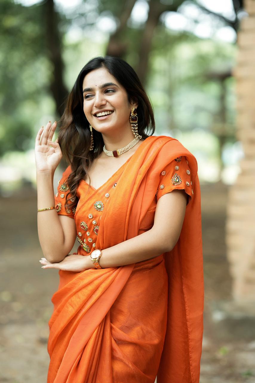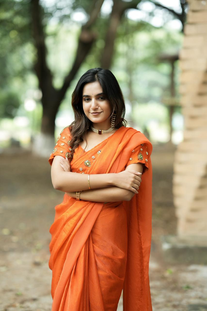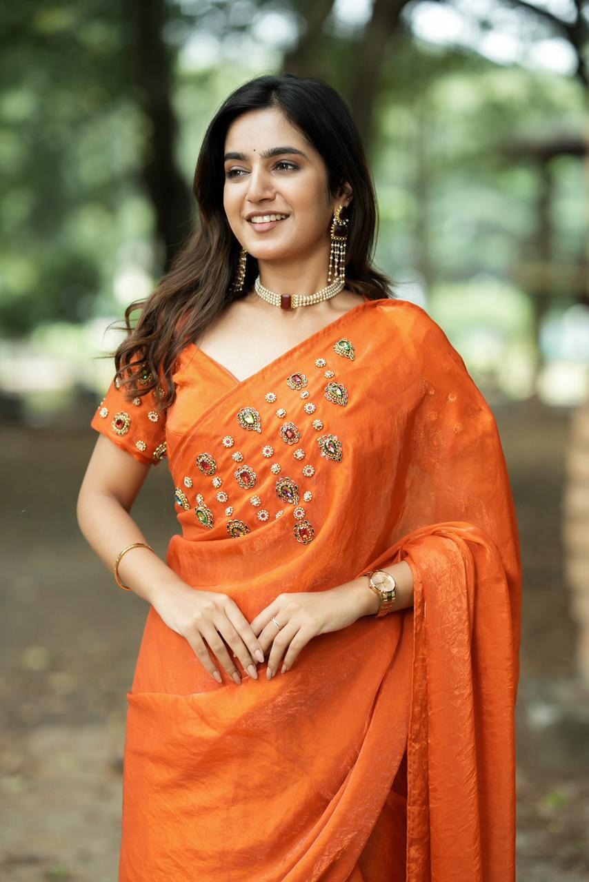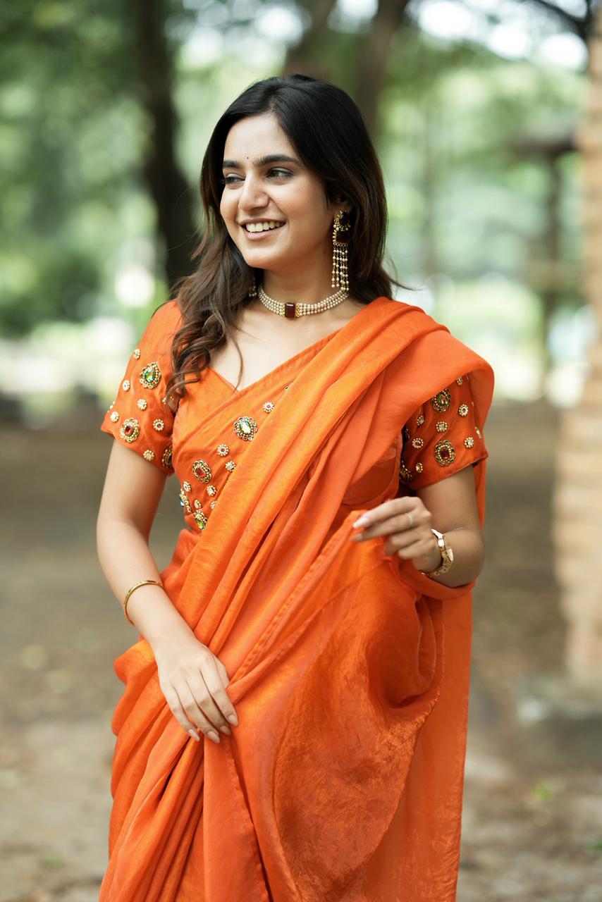 The Citrine Glow Saree Set captures the radiance of the golden hour, beautifully woven into fabric form. Drenched in a vivid, glowing shade of citrine orange, the saree drapes with a natural, fluid grace that makes every movement shimmer softly. Its rich yet lightweight texture creates a silhouette that is both festive and effortlessly refined. The highlight of the saree and blouse is the intricately embellished blouse, adorned with stunning multi-stone kundan-style motifs in shades of ruby, emerald, and pearl. Each stone is meticulously set in ornate gold detailing, creating a captivating jeweled effect that elevates the entire look. The placement of the embellishments across the blouse and pallu adds depth, texture, and a regal touch, making the outfit truly stand out.