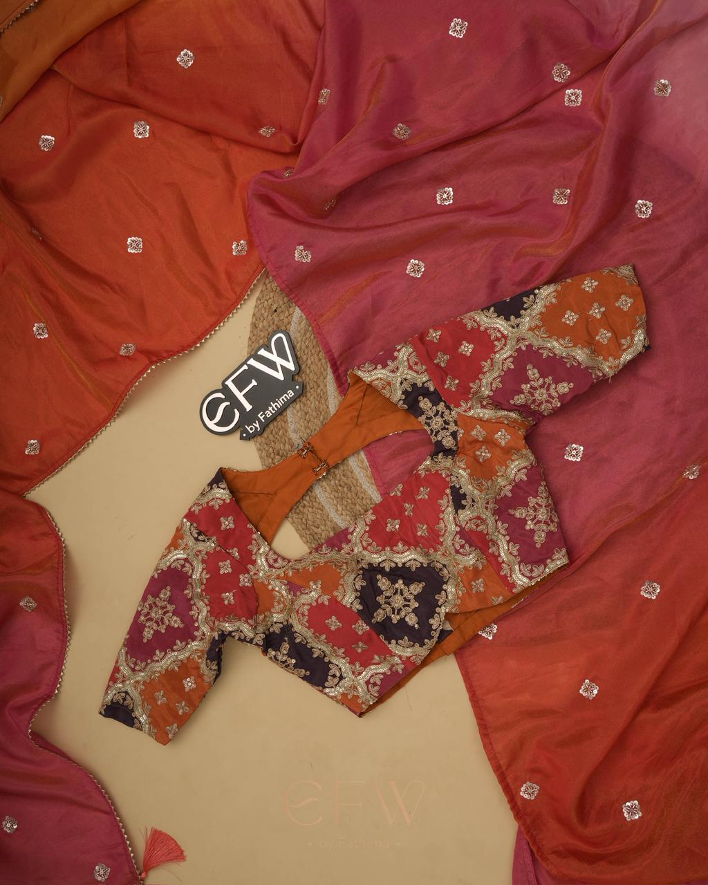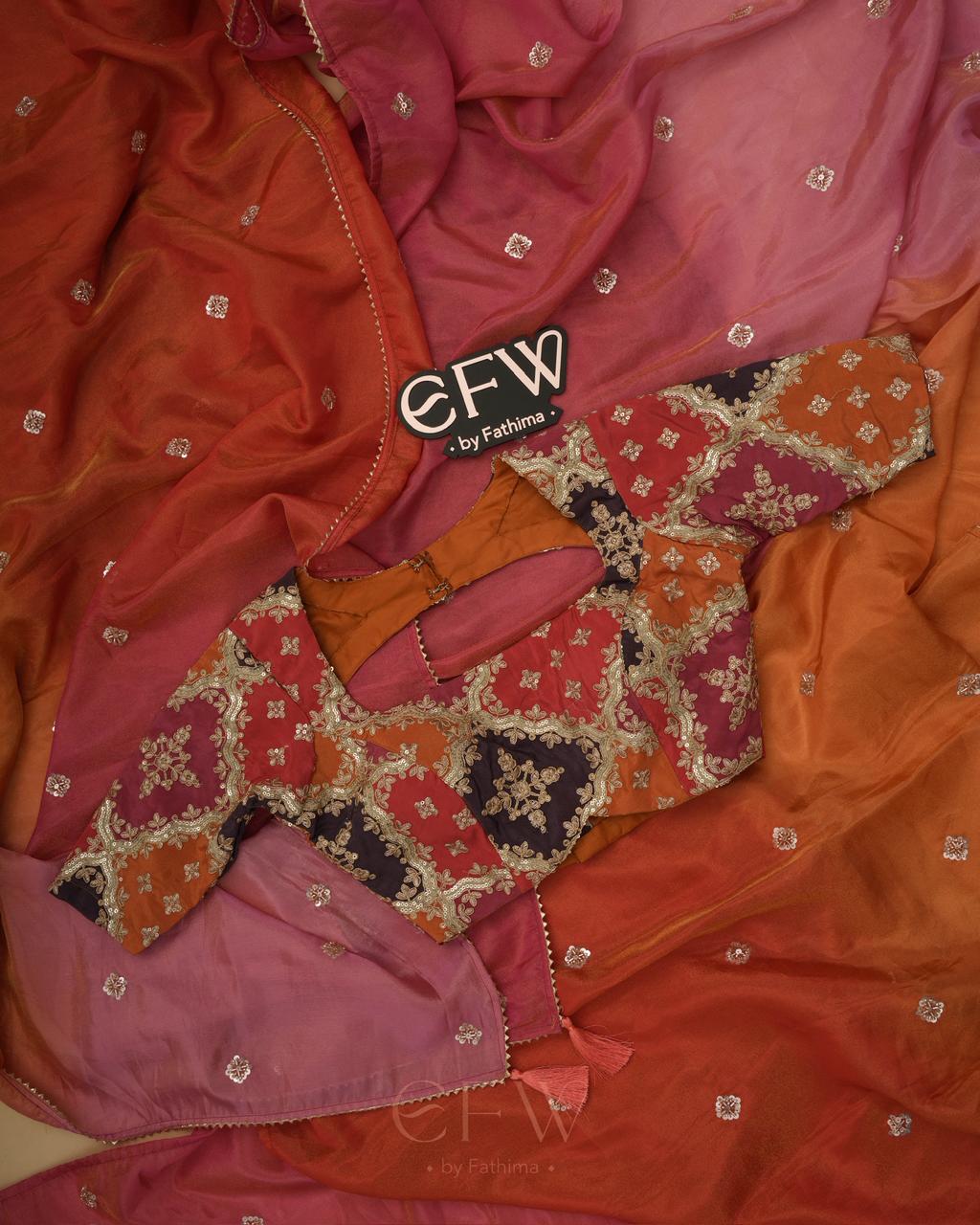 This pure tissue saree is dyed into a stunning pink orange ombré, creating a seamless flow of shades that feel light, calming, and oh-so-luxurious. The natural sheen of tissue adds a gentle glow, making the colours come alive with every movement.