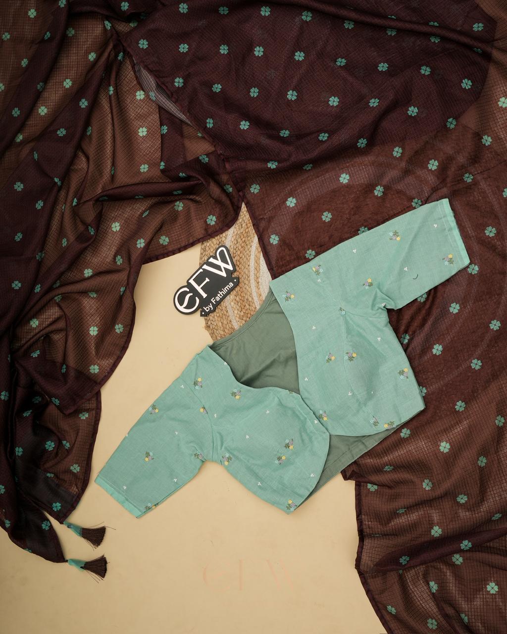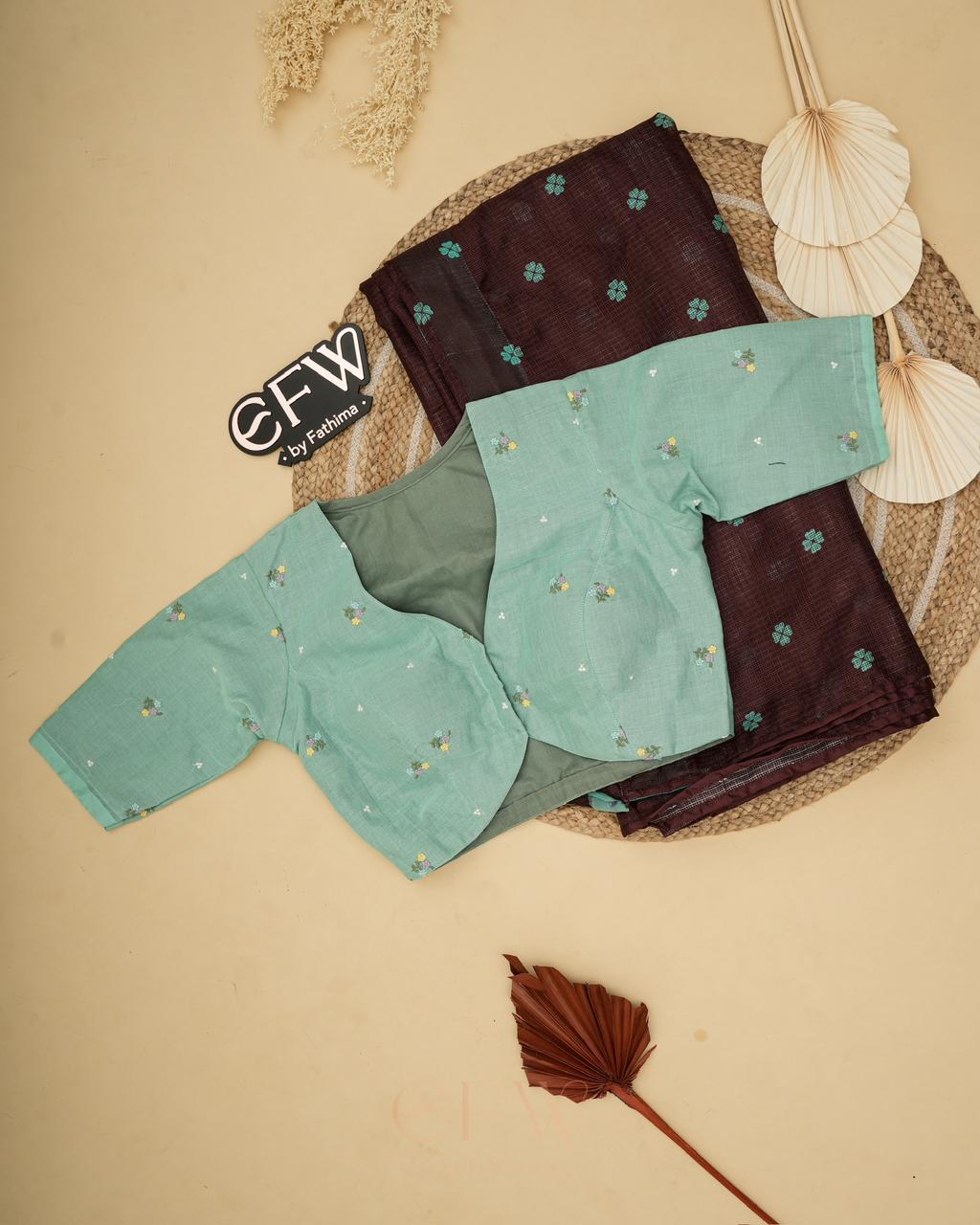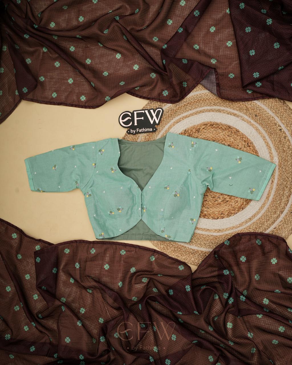 Paired with a Mul cottom chandheri blouse, the look softens beautifully. The blouse features gentle floral embroidery scattered across a soothing pastel base, finished with a clean, sculpted silhouette that balances tradition and modern finesse. Light on the skin and refined in structure, it elevates the entire ensemble with subtle charm.