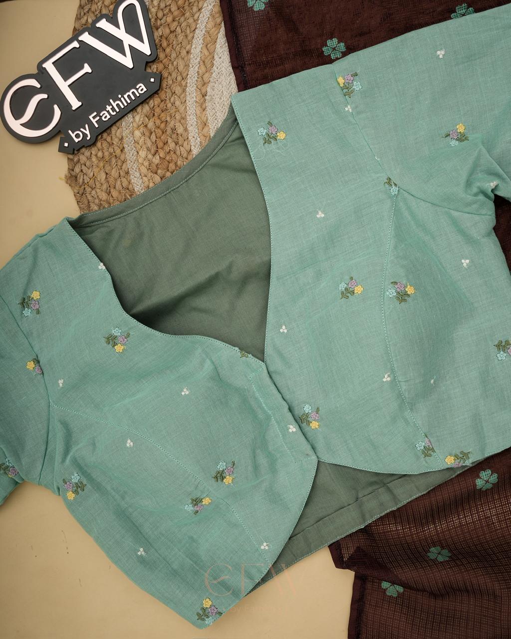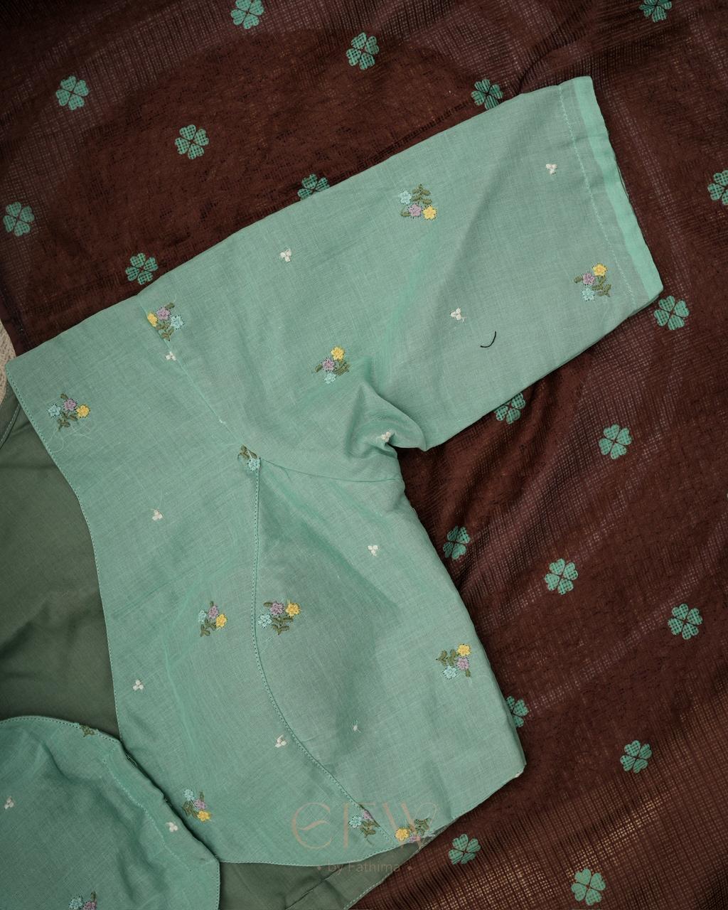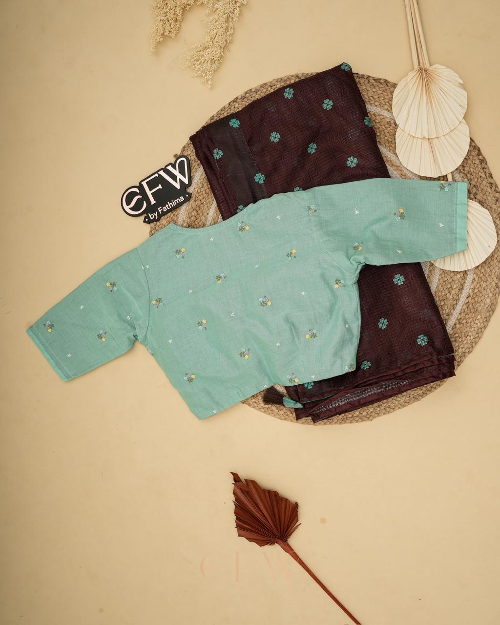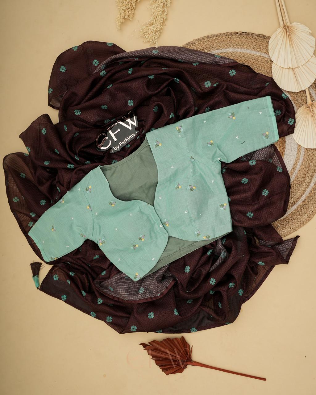 Paired with a Mul cottom chandheri blouse, the look softens beautifully. The blouse features gentle floral embroidery scattered across a soothing pastel base, finished with a clean, sculpted silhouette that balances tradition and modern finesse. Light on the skin and refined in structure, it elevates the entire ensemble with subtle charm.