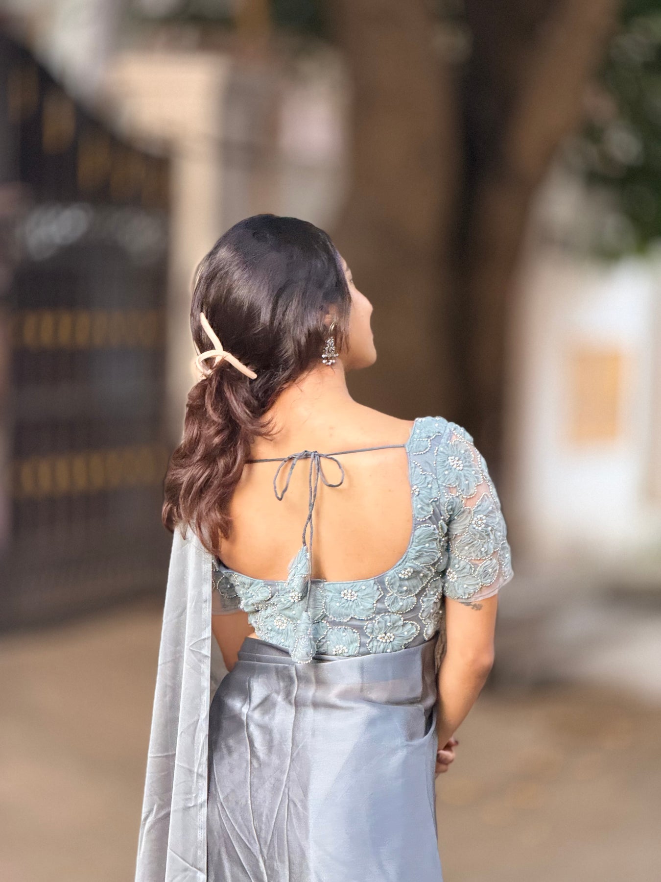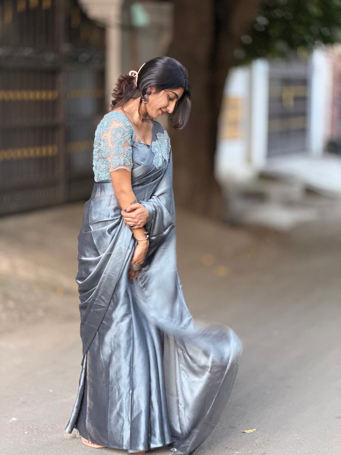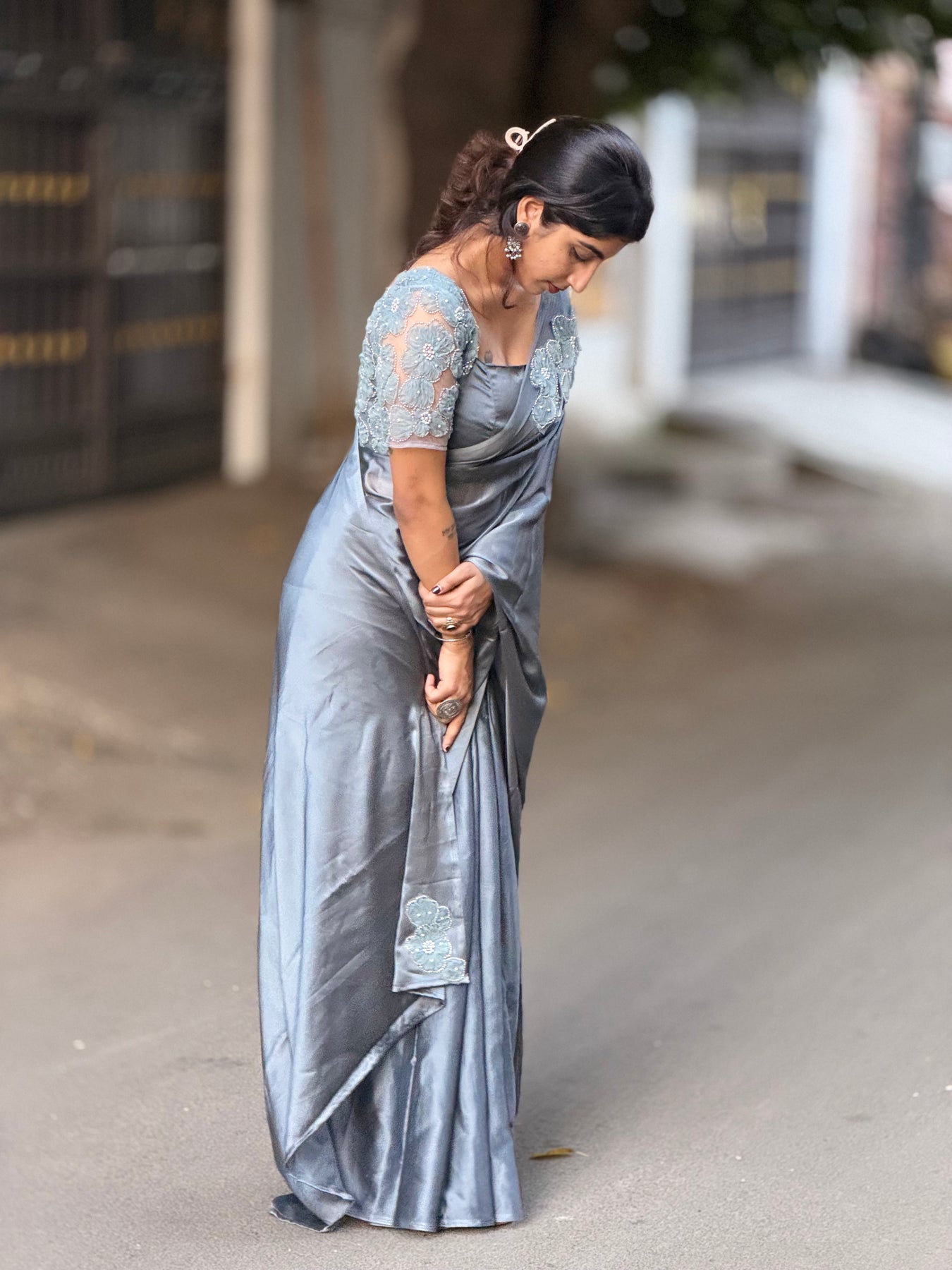 Crafted in a calm mist-grey hue, Ishara exudes timeless grace with a contemporary touch. The saree drapes in smooth satin, catching light in all the right ways to create an ethereal, liquid sheen.