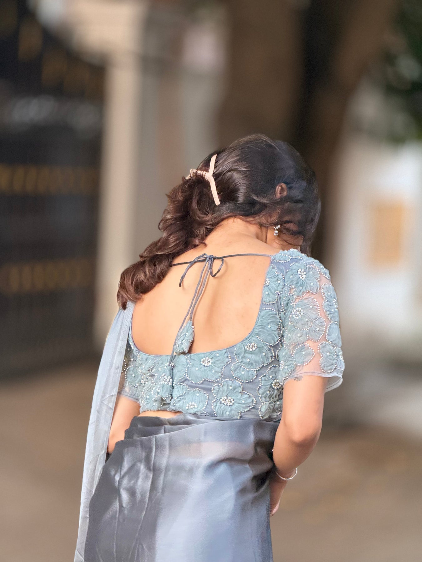 The elbow-sleeve blouse steals the spotlight — adorned with hand-appliquéd floral motifs in sheer organza, each bloom highlighted with delicate pearls and shimmering beadwork. The intricate embroidery adds depth and texture, turning simplicity into understated luxury.