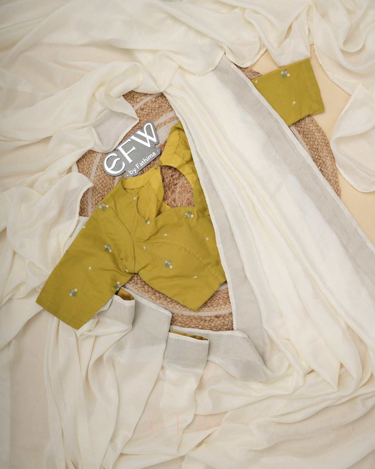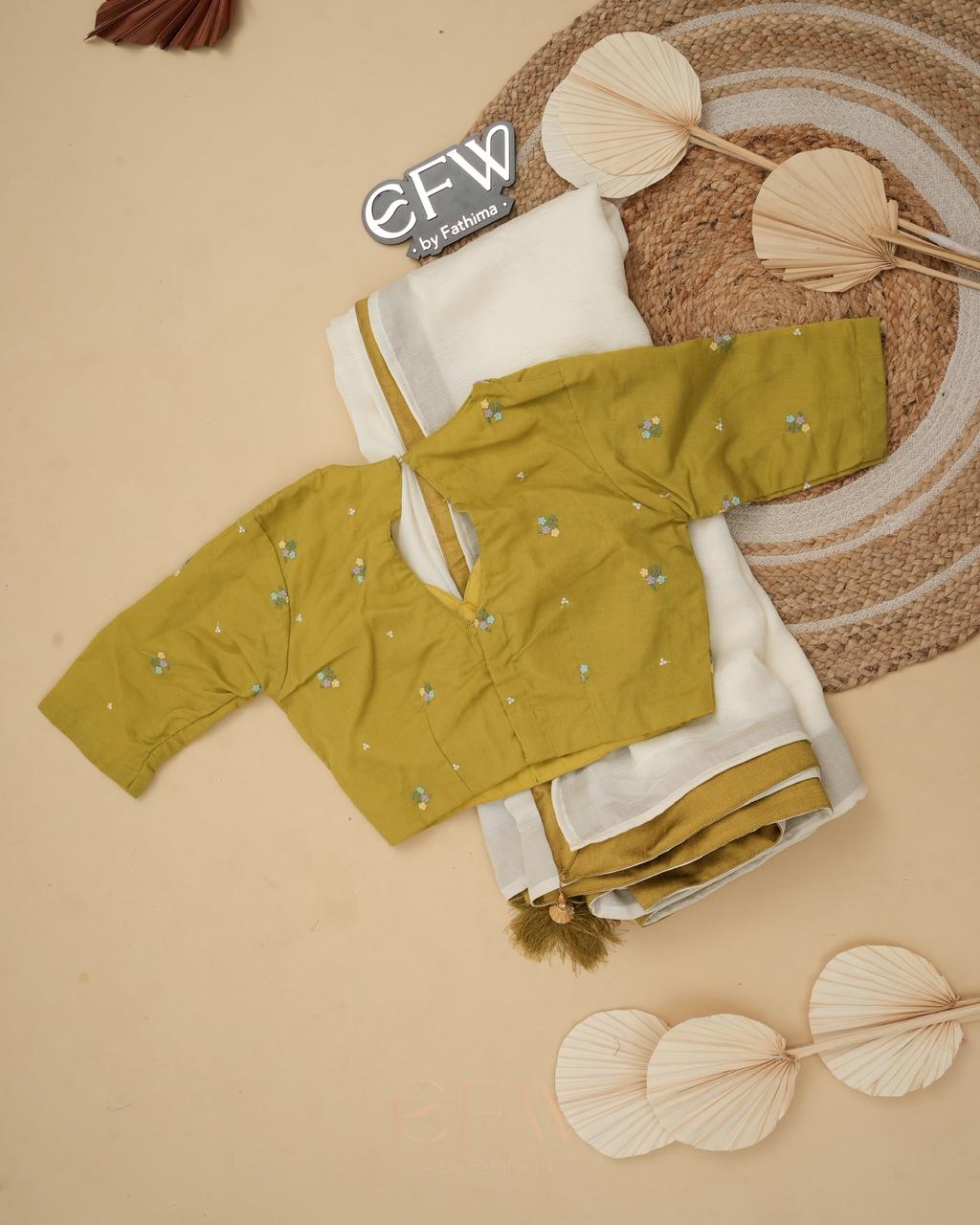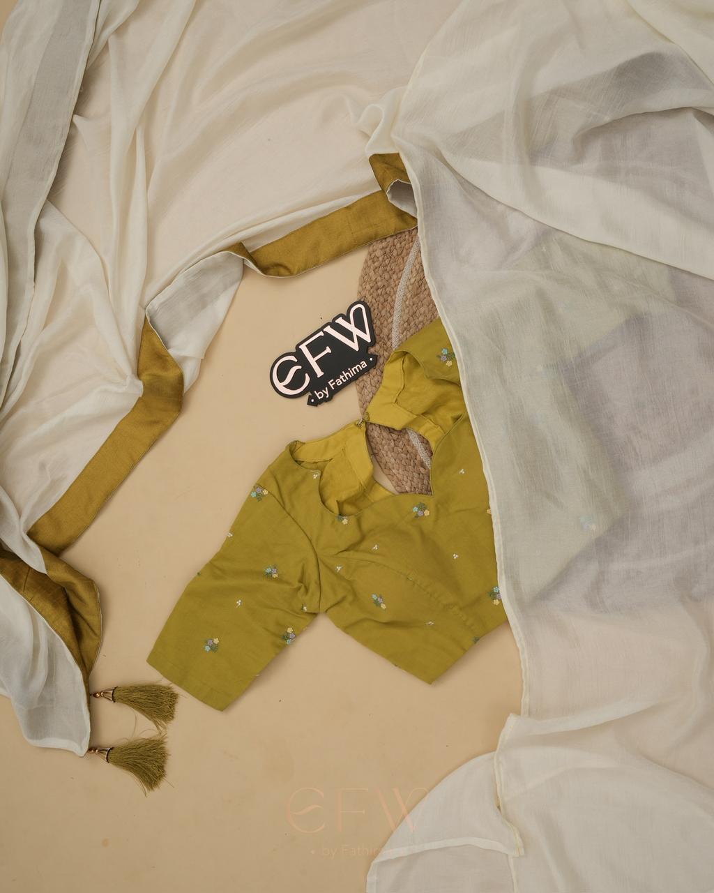 Paired with this is a beautifully tailored olive green mul cotton blouse, delicately embroidered with tiny floral motifs scattered across the fabric. The blouse features a soft curved neckline with a modest cut-out detail at the back, lending a refined yet contemporary charm. Designed with a comfortable structure and elbow-length sleeves, it complements the saree seamlessly while standing strong as a statement piece on its own.