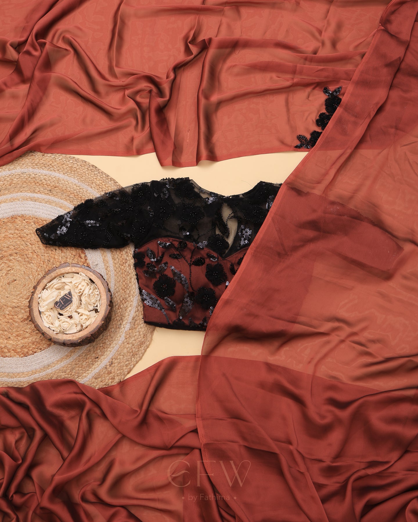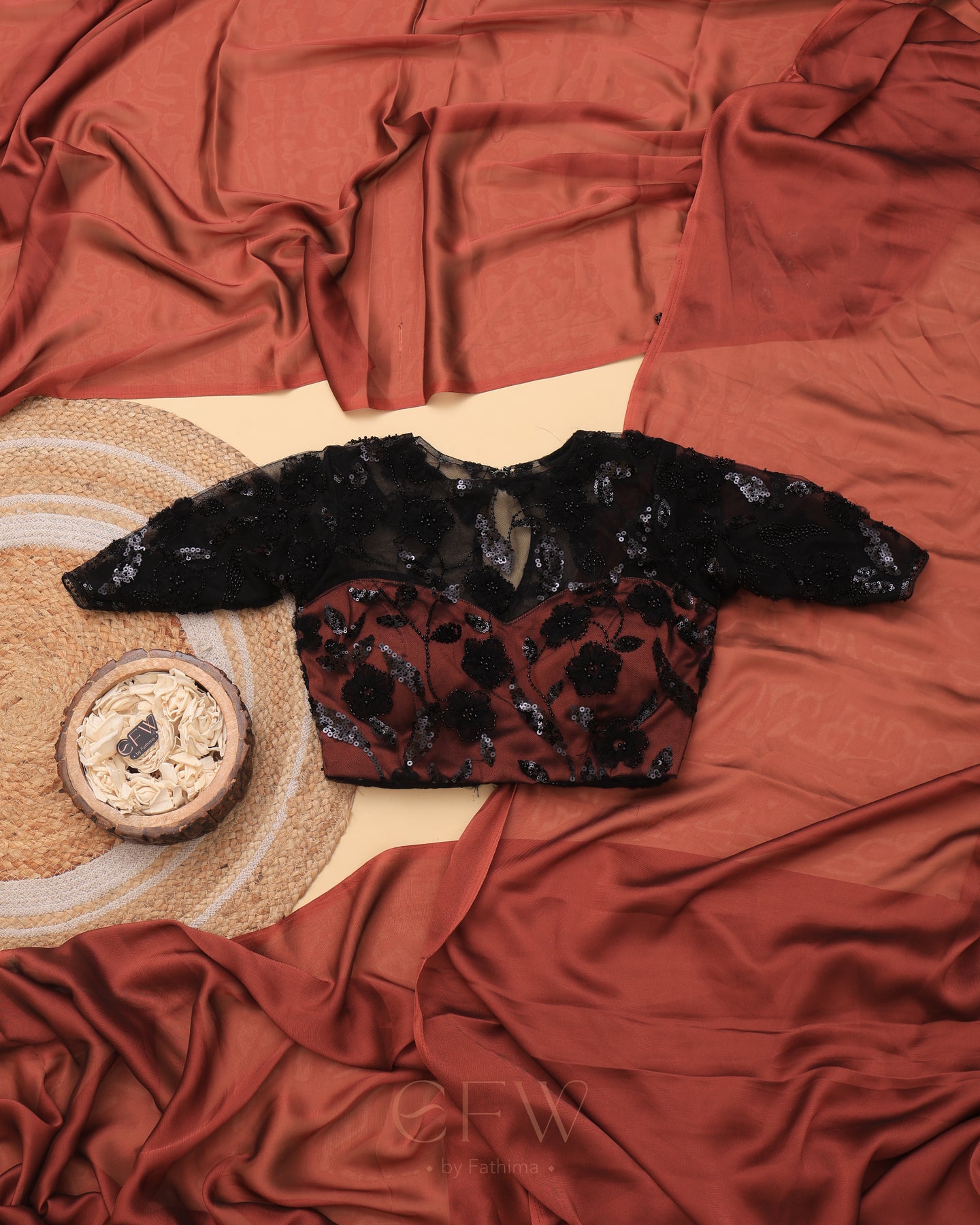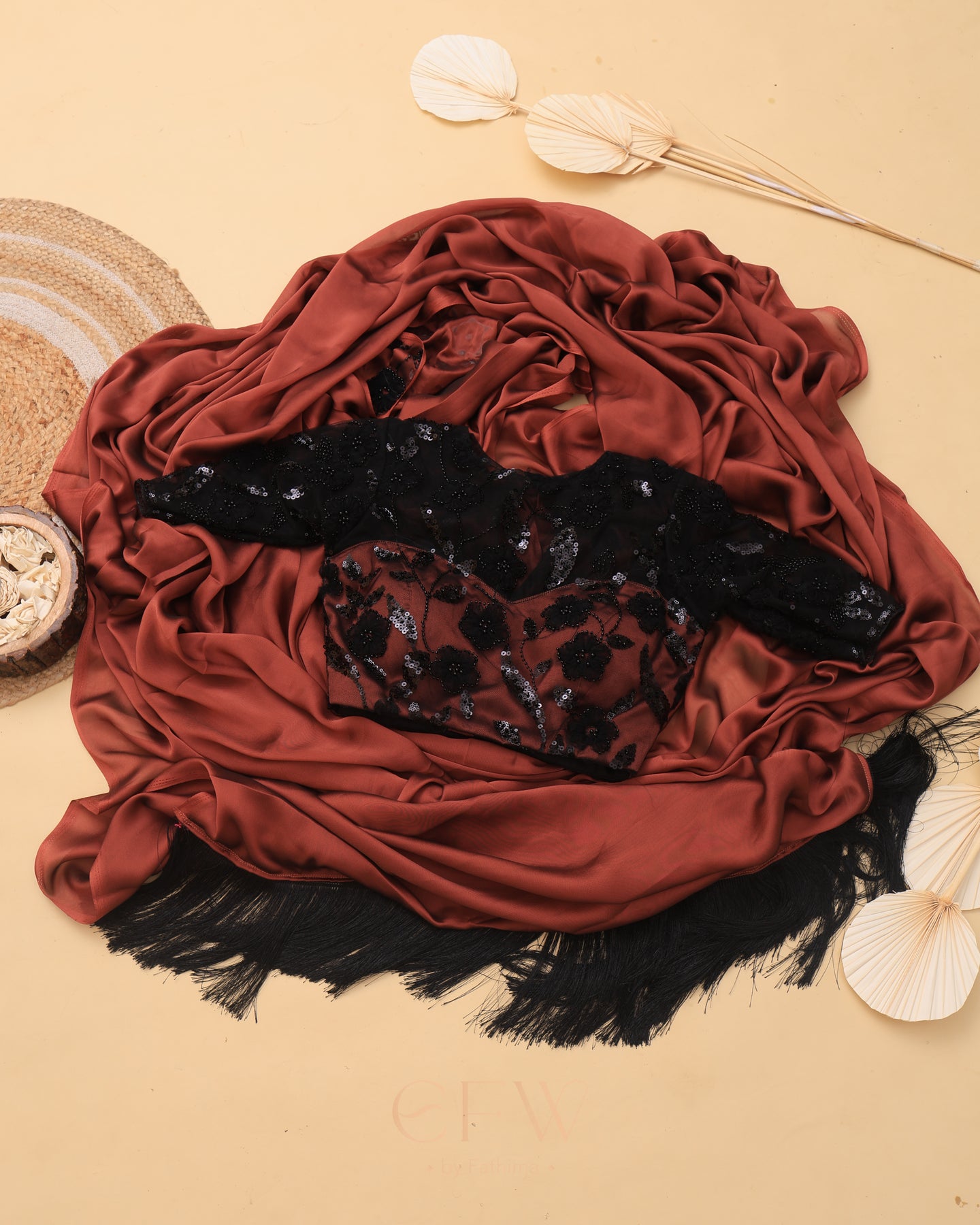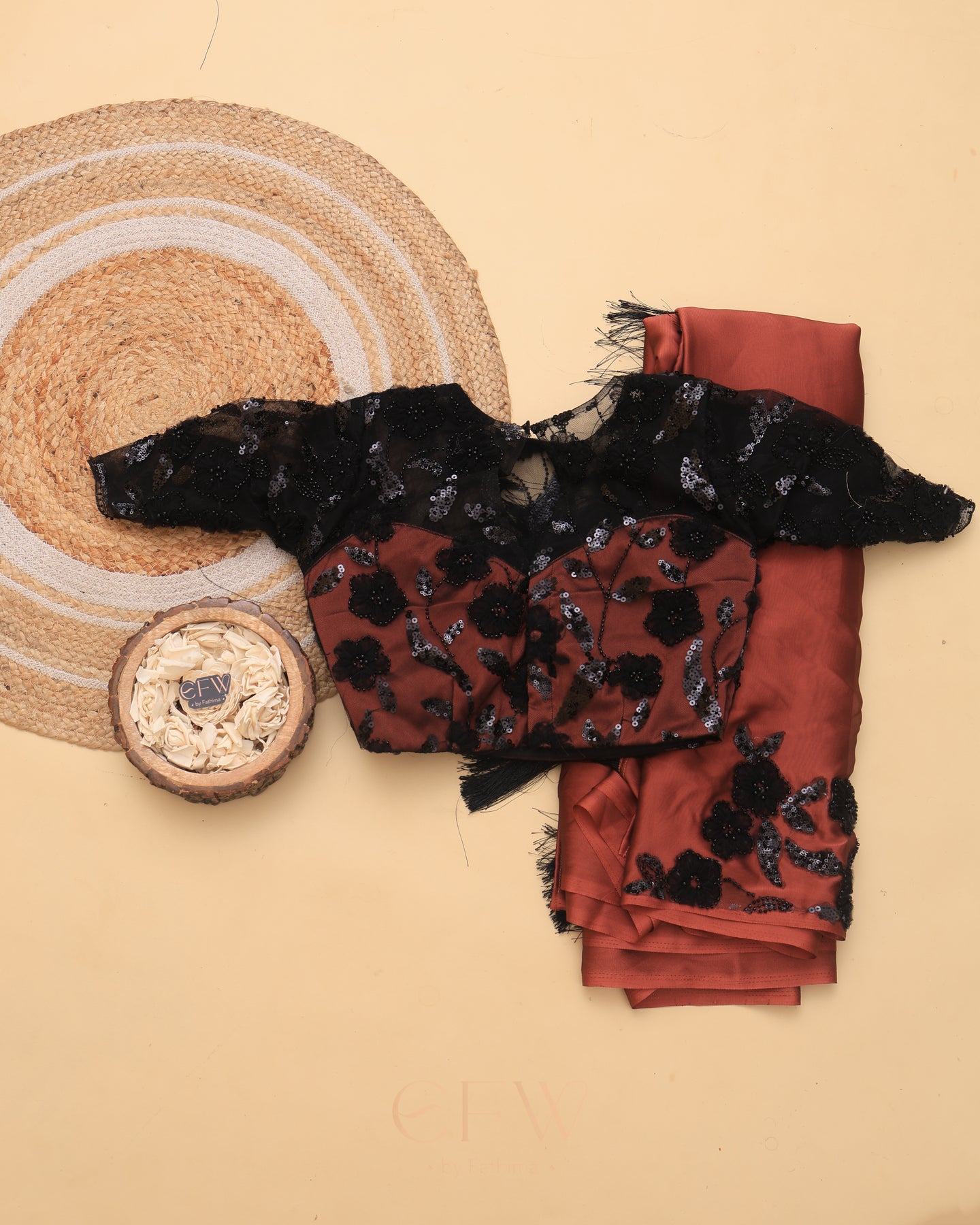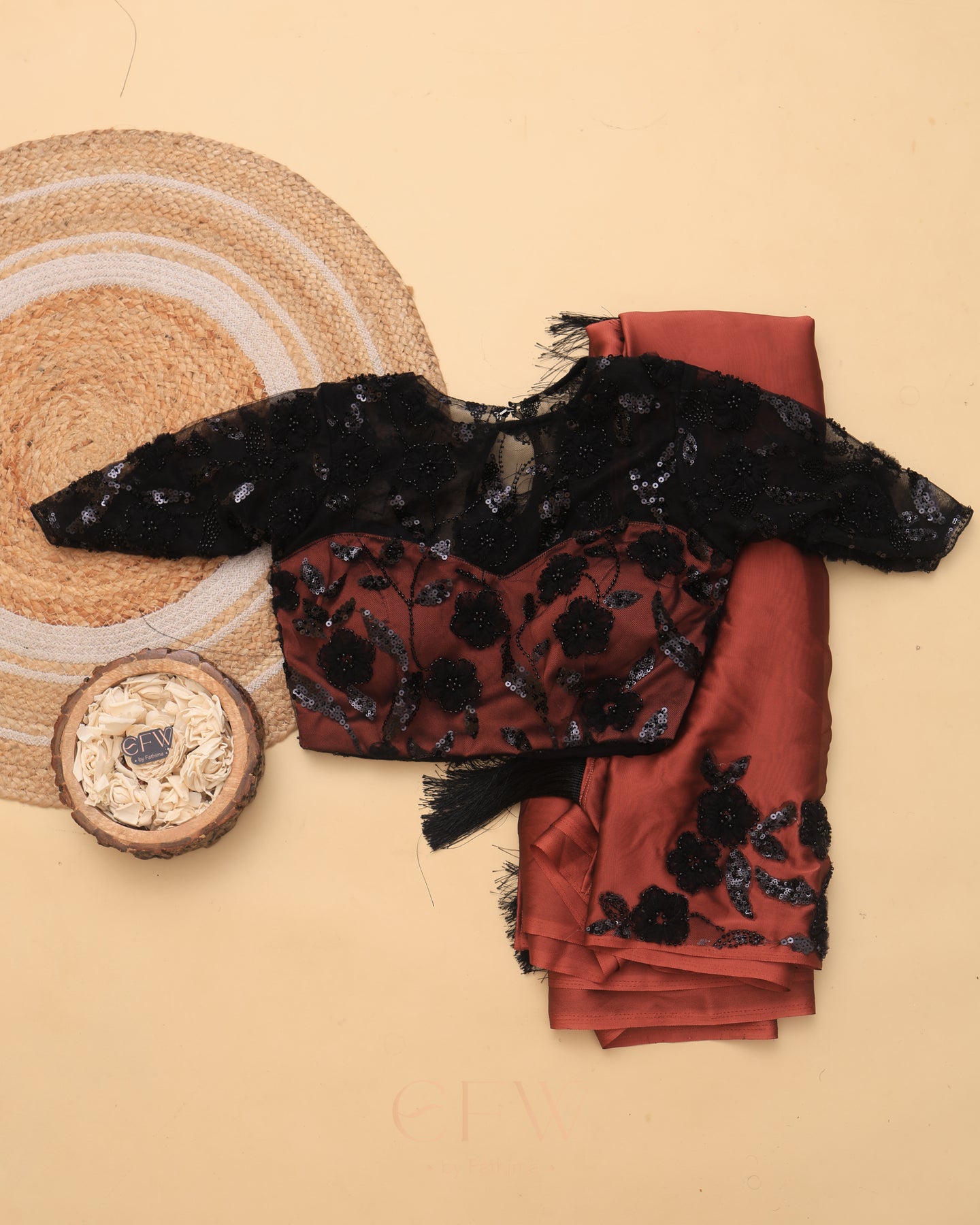 Introducing the Naima Noir Ensemble—a celebration of dark romance and bold sophistication. Drenched in a sultry brick-rust hue, the saree cascades in soft satin georgette with a natural, fluid drape that whispers luxury in motion. Lightweight yet arresting, the fabric glows with an earthy depth that effortlessly frames the centerpiece blouse.