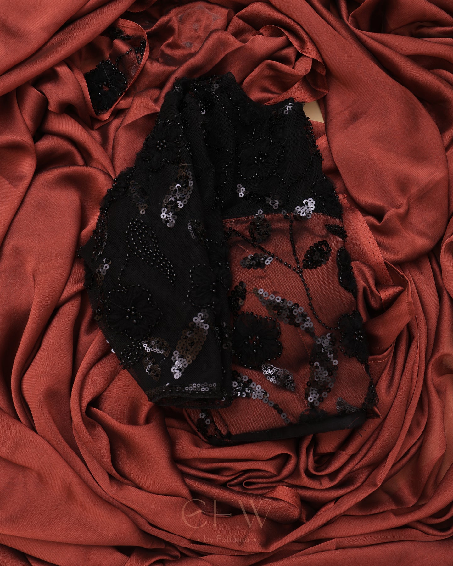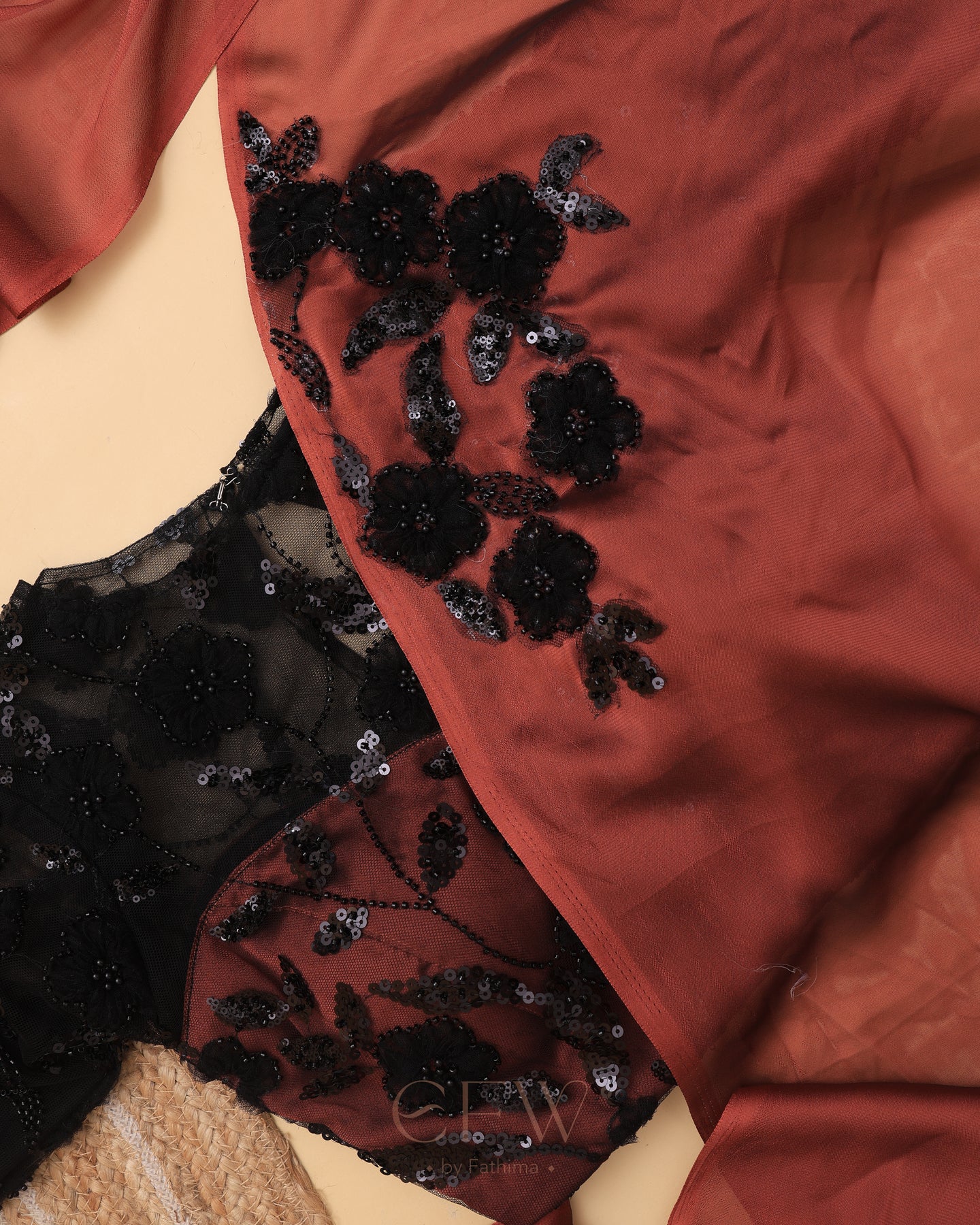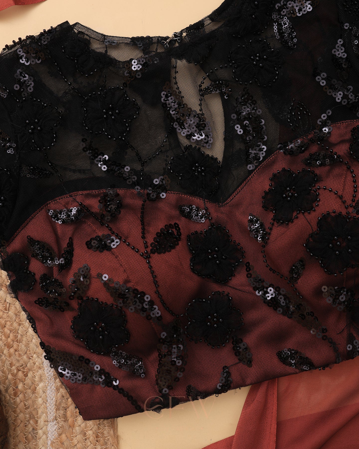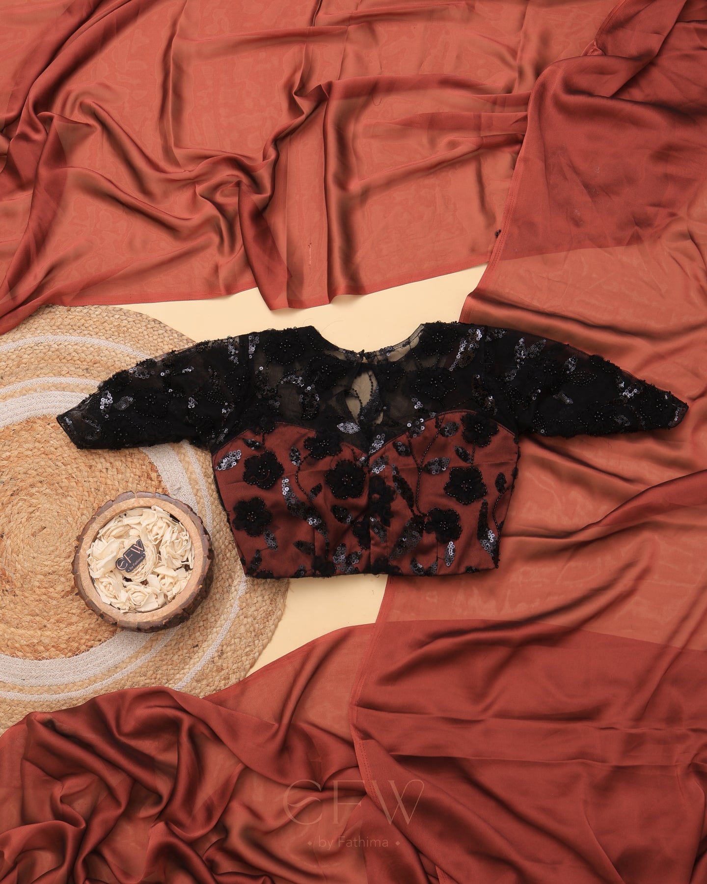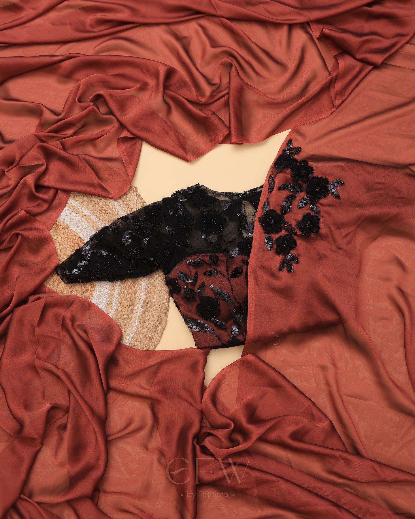 Introducing the Naima Noir Ensemble—a celebration of dark romance and bold sophistication. Drenched in a sultry brick-rust hue, the saree cascades in soft satin georgette with a natural, fluid drape that whispers luxury in motion. Lightweight yet arresting, the fabric glows with an earthy depth that effortlessly frames the centerpiece blouse.