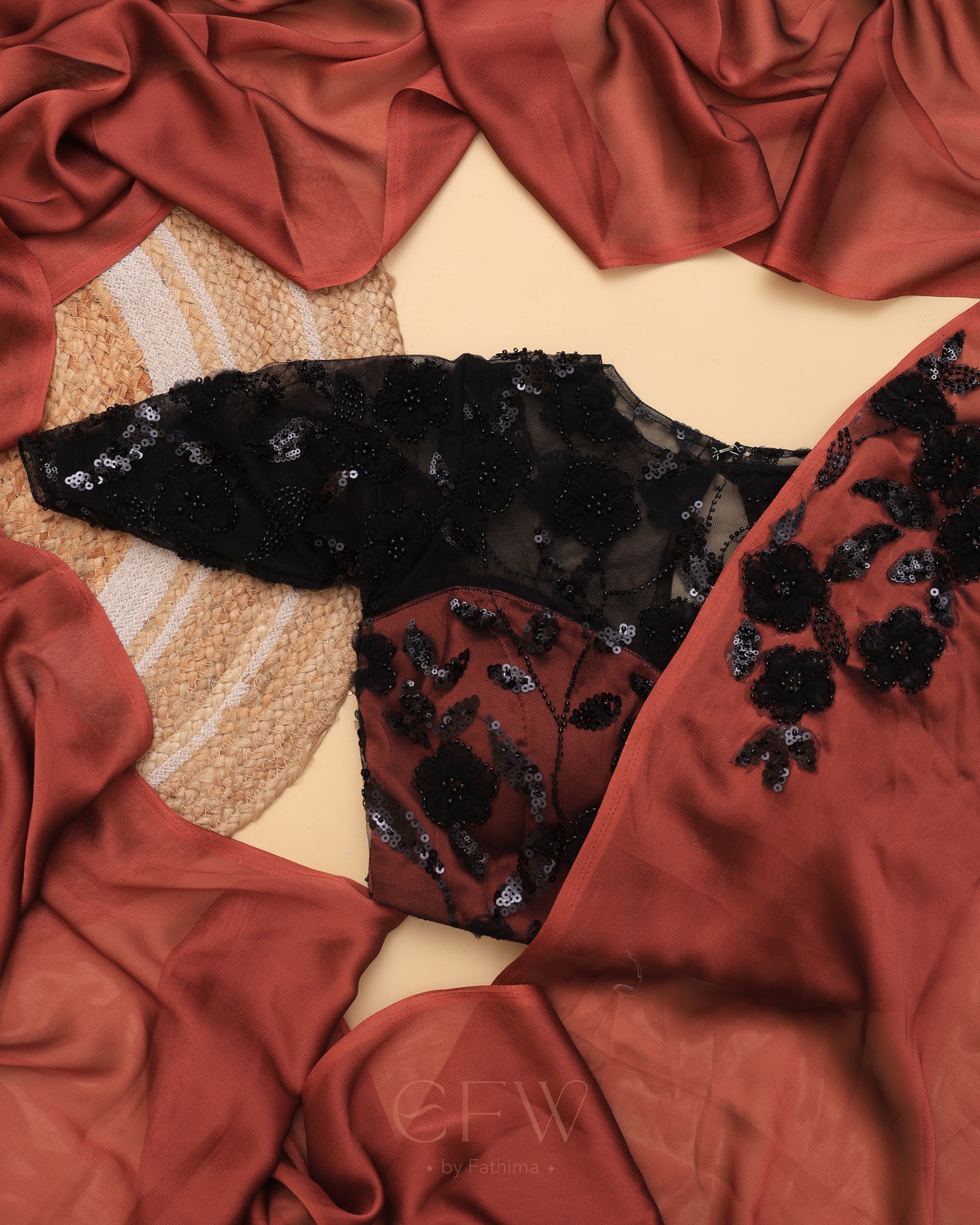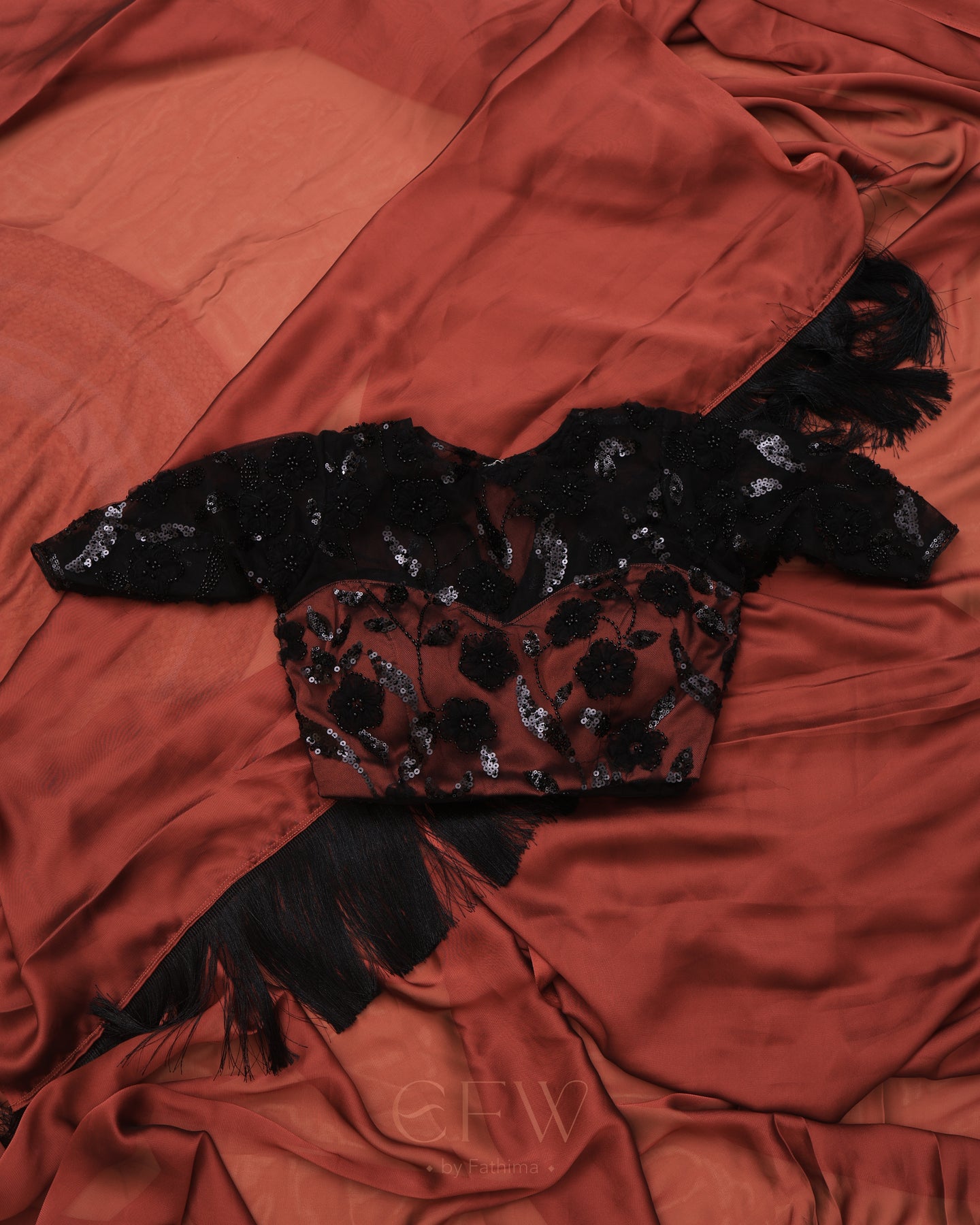 The blouse—structured, semi-sheer, and unapologetically statement-making—features intricate black floral embroidery, each motif hand-embellished with tonal sequins and micro-bead detailing. The illusion neckline and sleeves are rendered in delicate net, creating a layered interplay of transparency and texture. The floral vines seem to dance over the skin, adding both mystique and modern glamour.