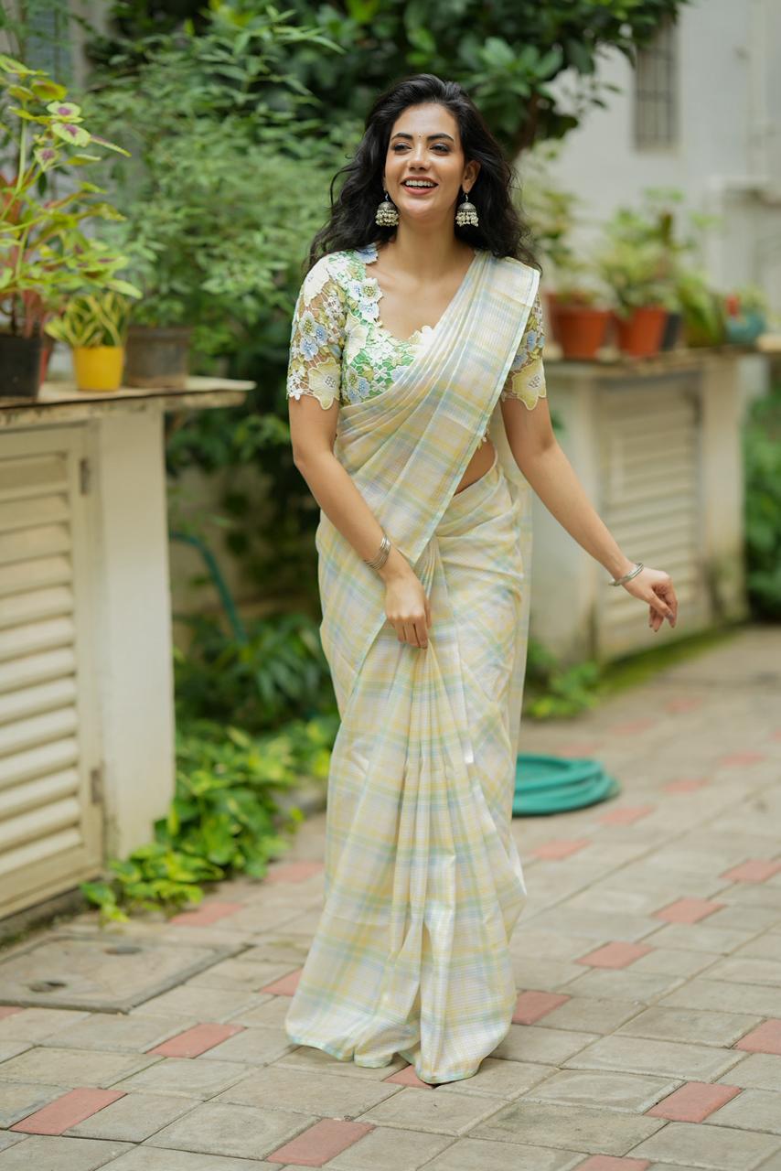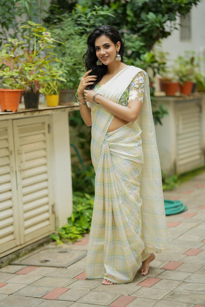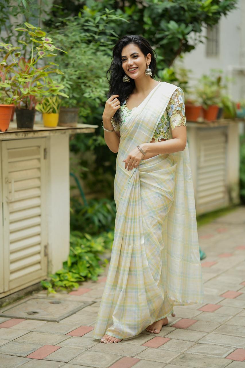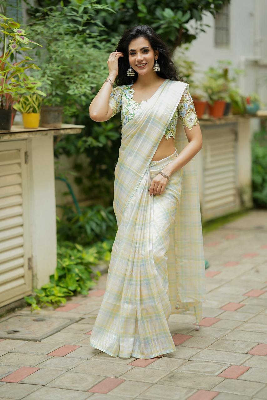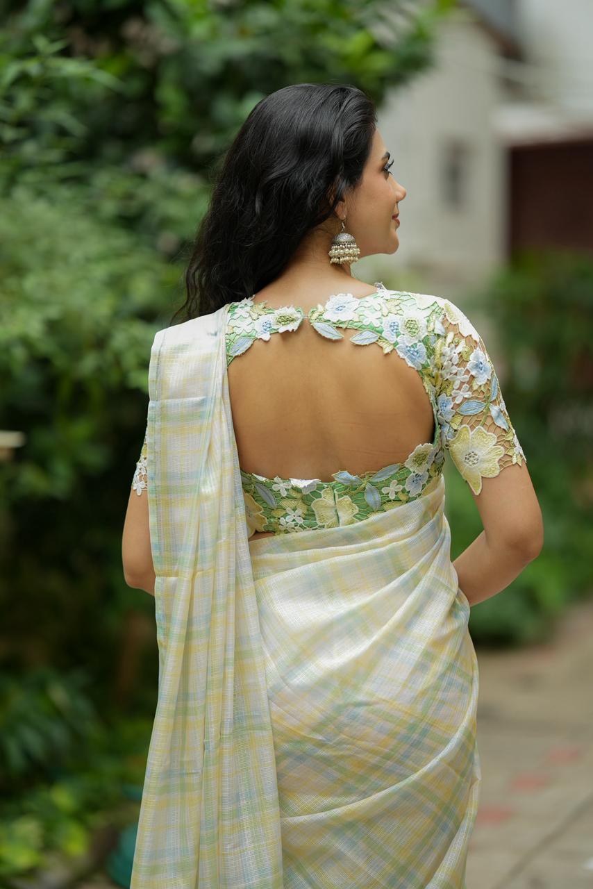 A creation that carries the warmth of morning light — this scratch-built Kota saree is woven in pastel yellow, soft green, and sky-blue checks, each shade flowing seamlessly into the next like sunlight across a courtyard. Feathery in texture and effortless in drape, it offers a rare balance of ease and elegance.
