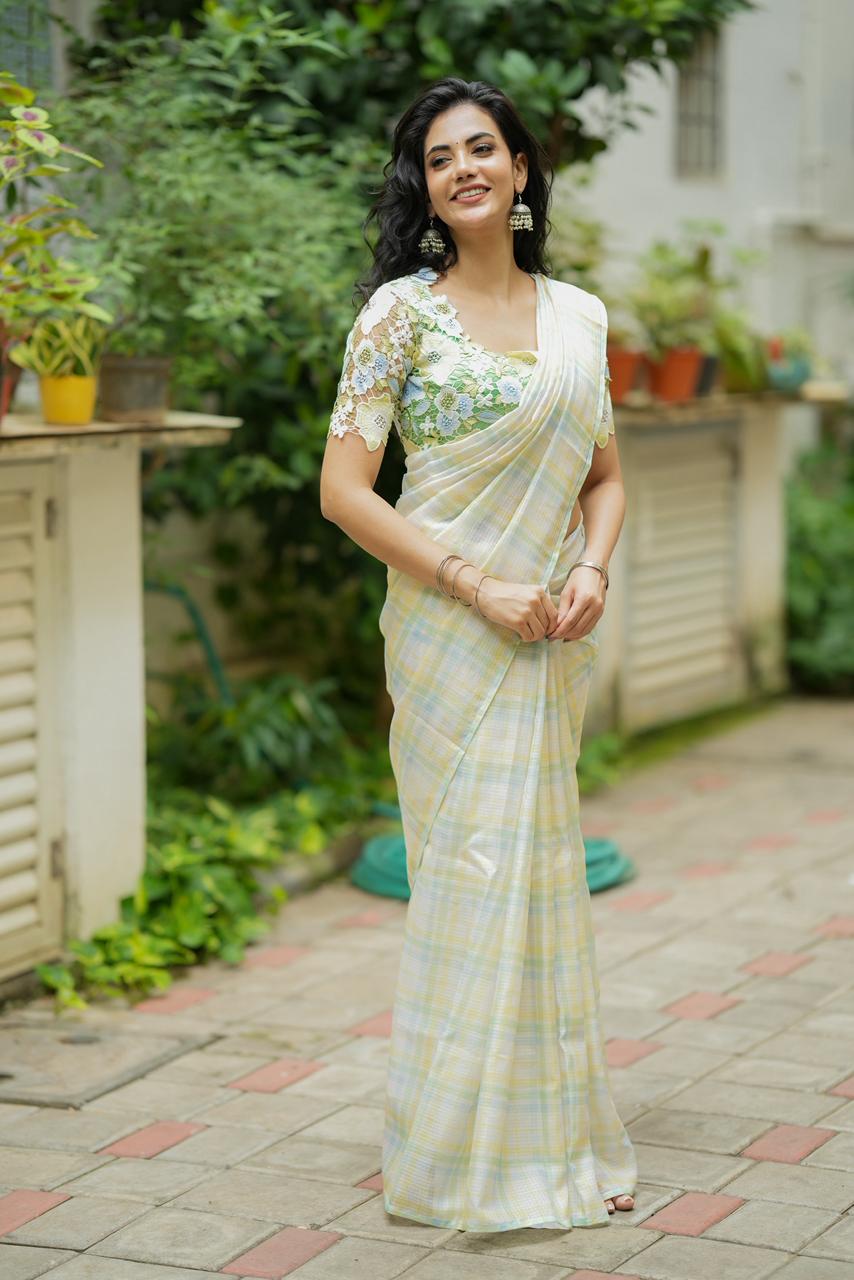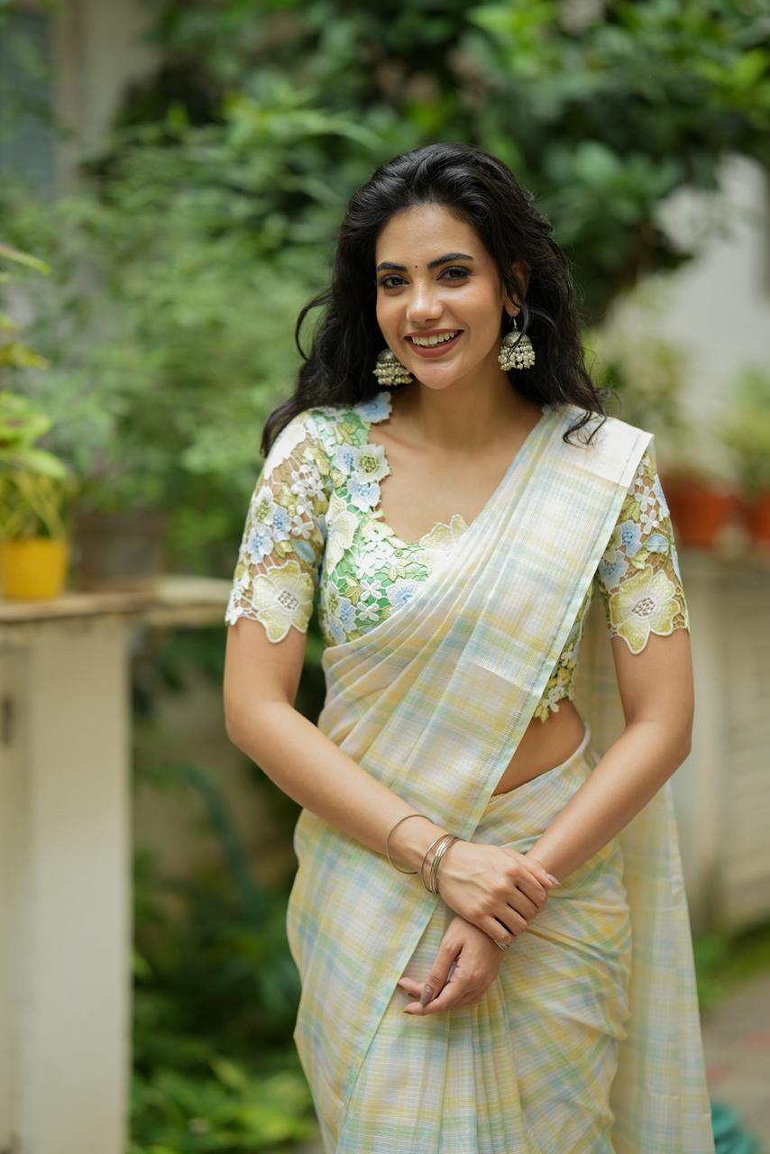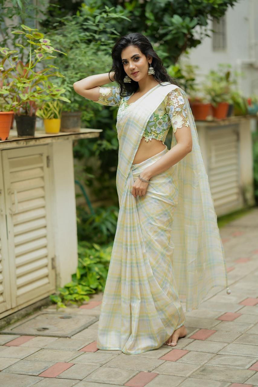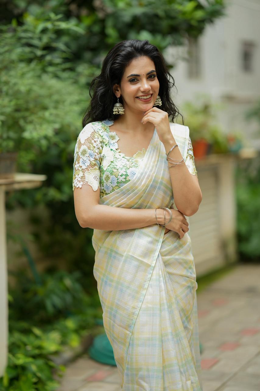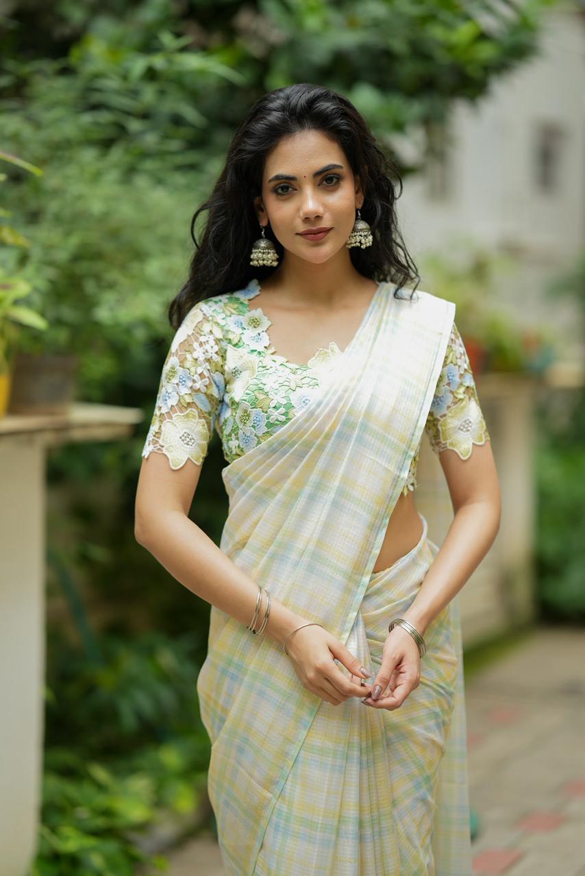 A creation that carries the warmth of morning light — this scratch-built Kota saree is woven in pastel yellow, soft green, and sky-blue checks, each shade flowing seamlessly into the next like sunlight across a courtyard. Feathery in texture and effortless in drape, it offers a rare balance of ease and elegance.