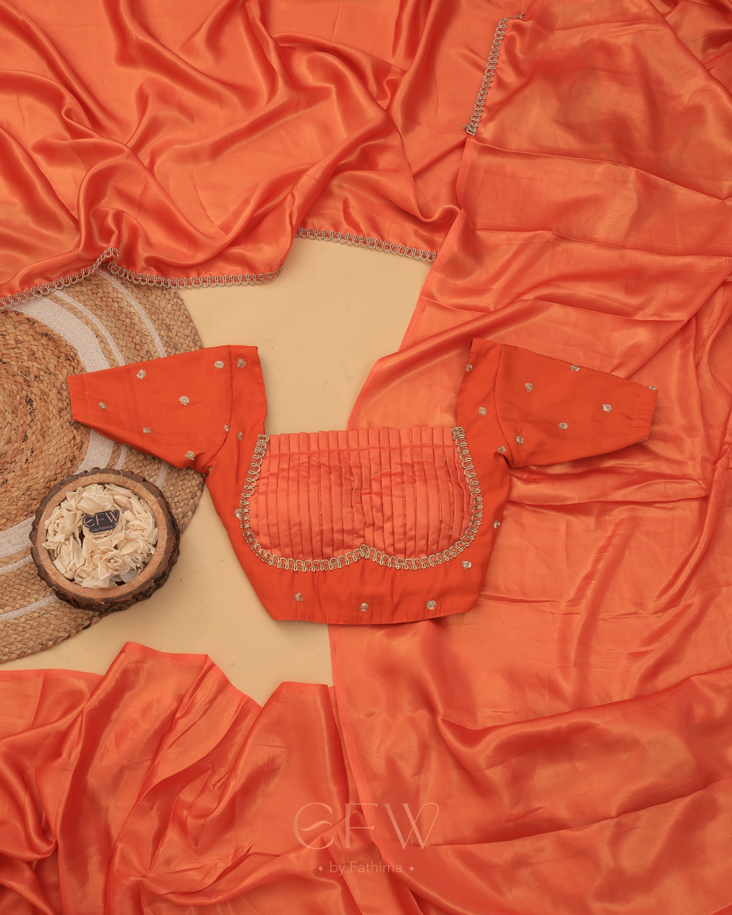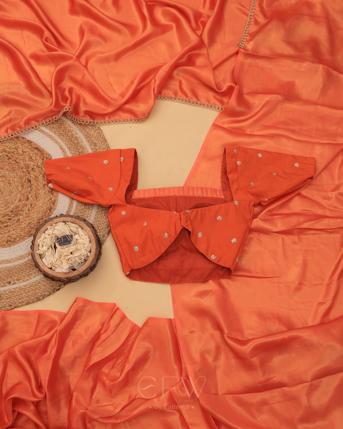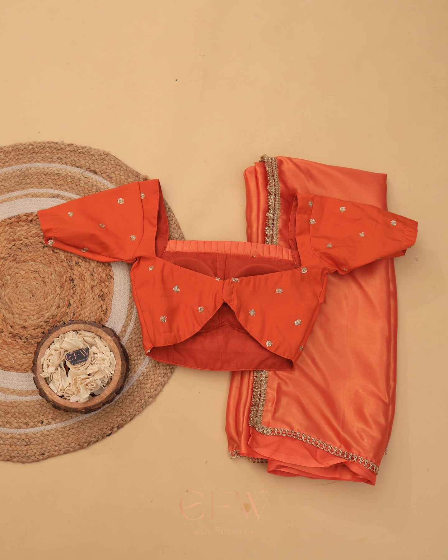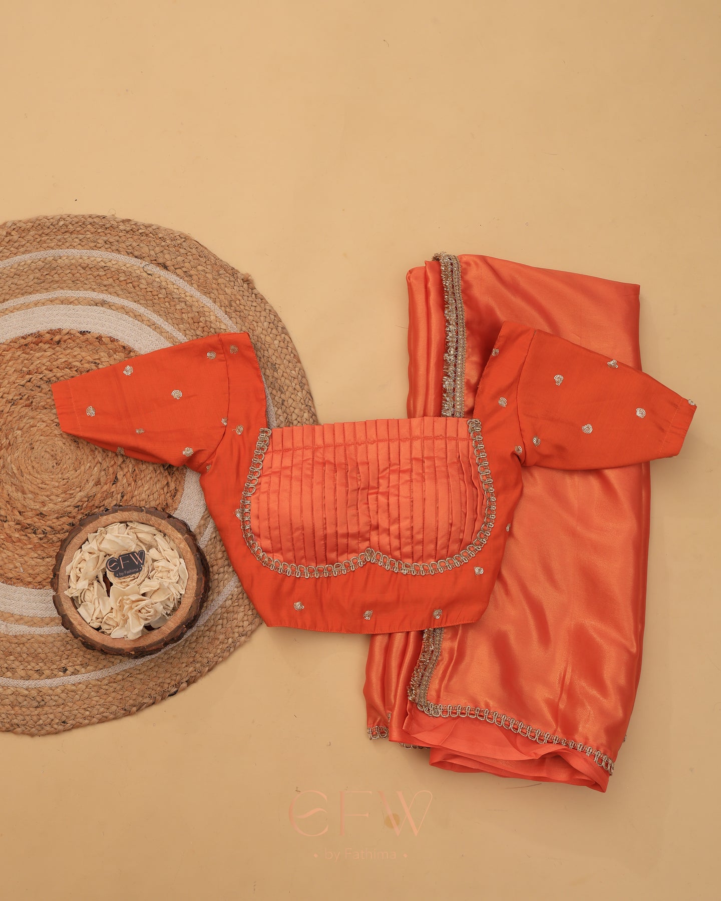 The Tangerise saree and blouse set is a radiant expression of bold elegance, inspired by the vibrant warmth of ripe tangerines and the sophistication of handcrafted detailing.