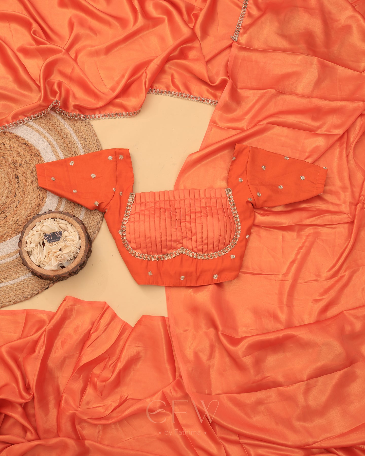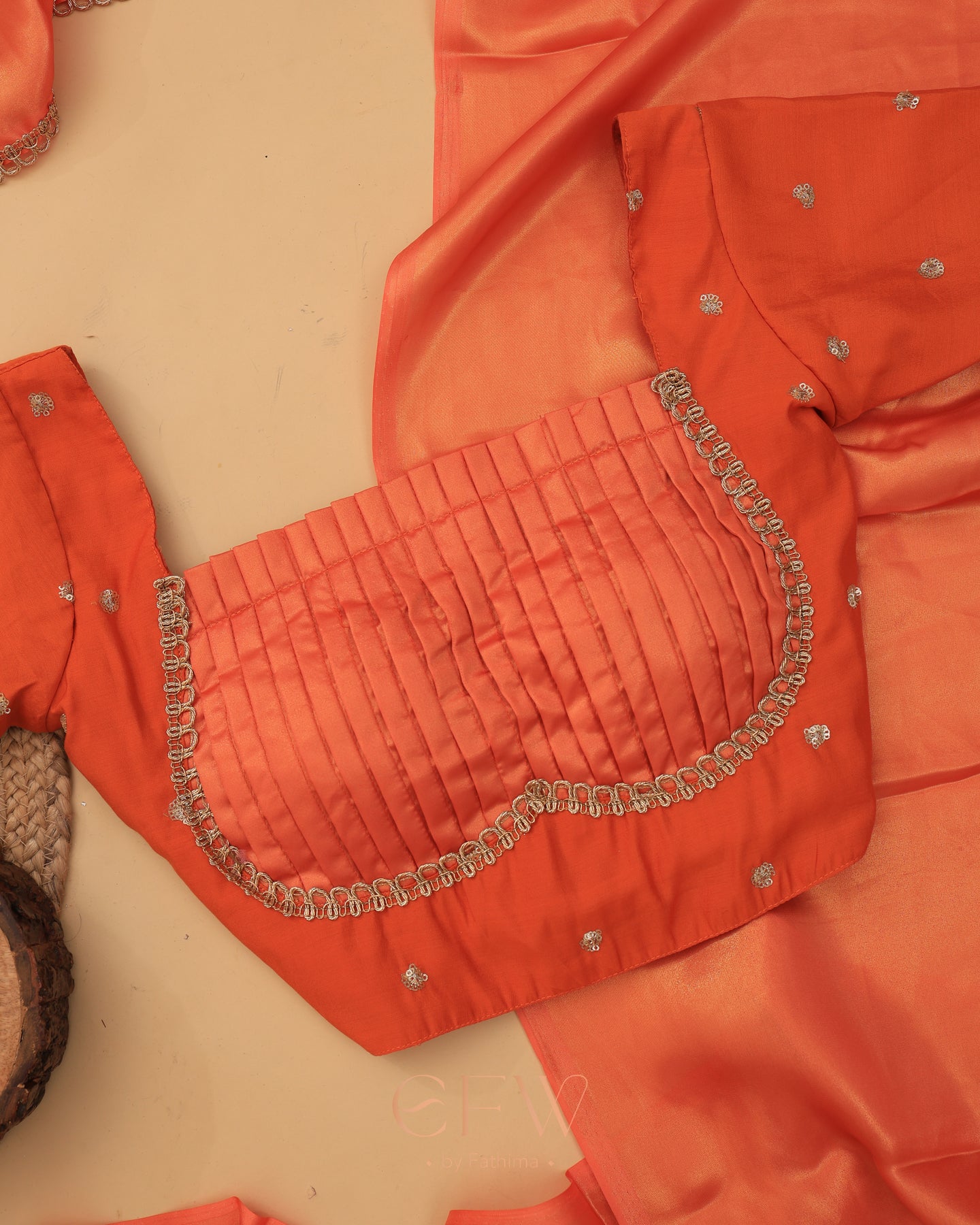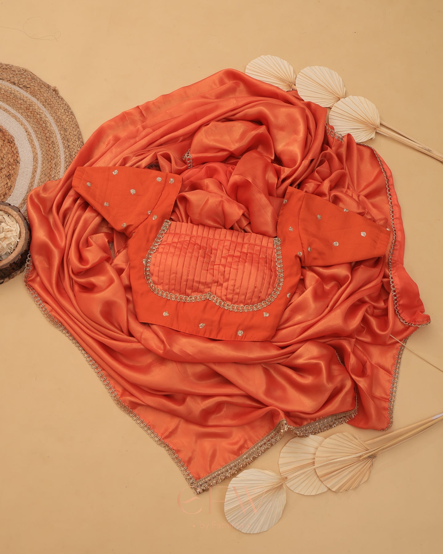 The Tangerise saree and blouse set is a radiant expression of bold elegance, inspired by the vibrant warmth of ripe tangerines and the sophistication of handcrafted detailing.