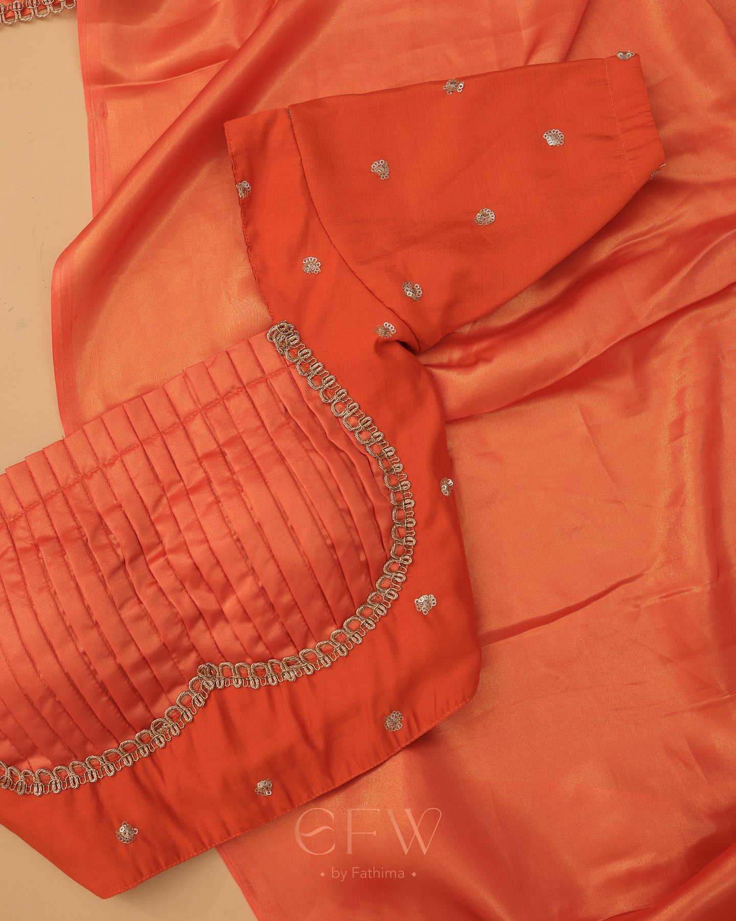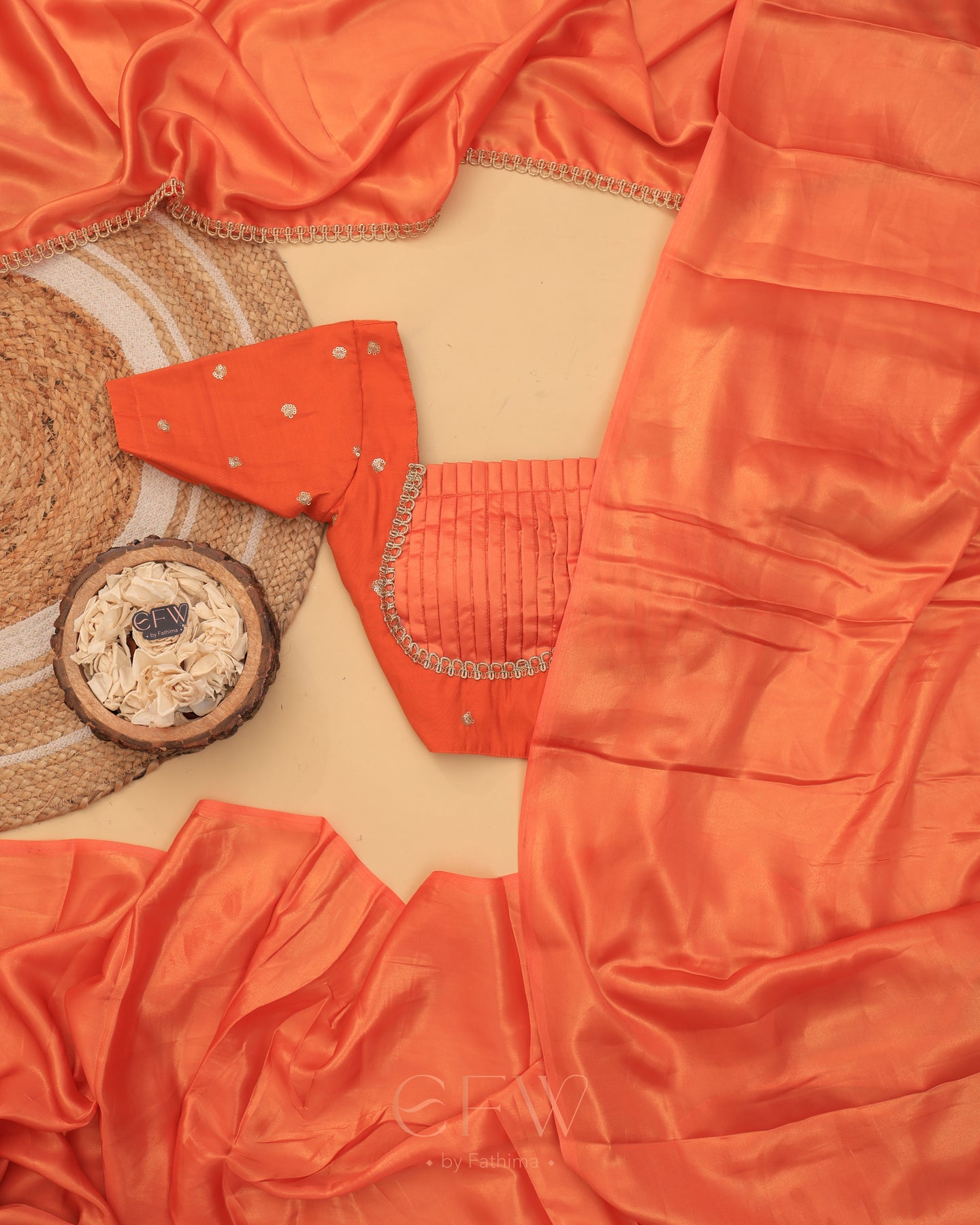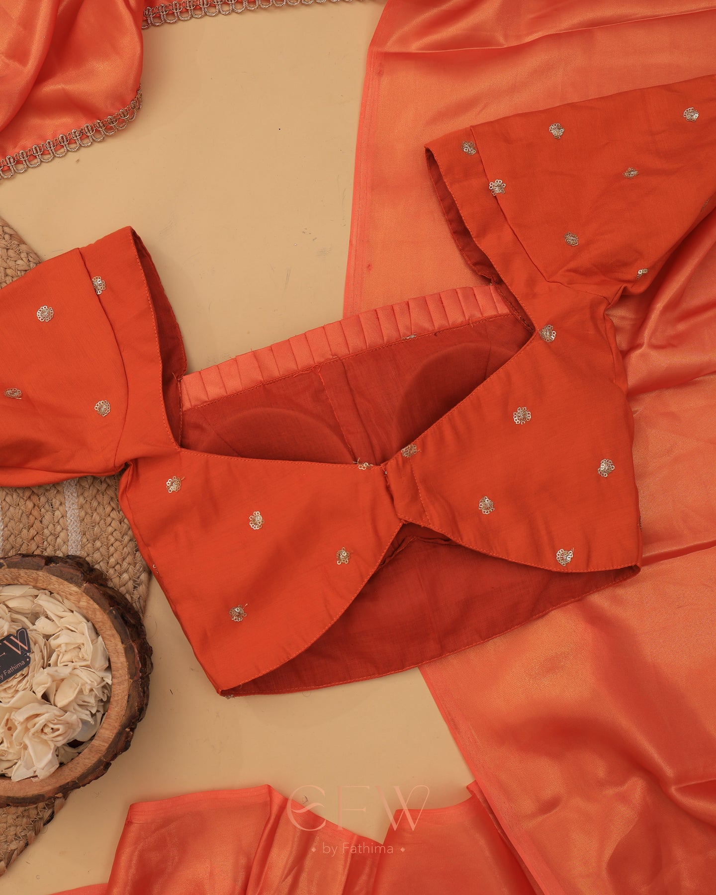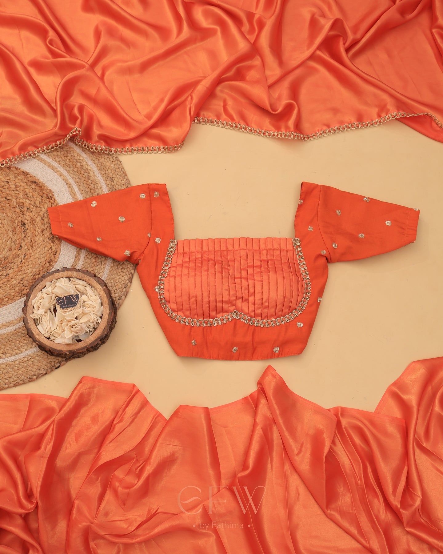 The Tangerise saree and blouse set is a radiant expression of bold elegance, inspired by the vibrant warmth of ripe tangerines and the sophistication of handcrafted detailing.