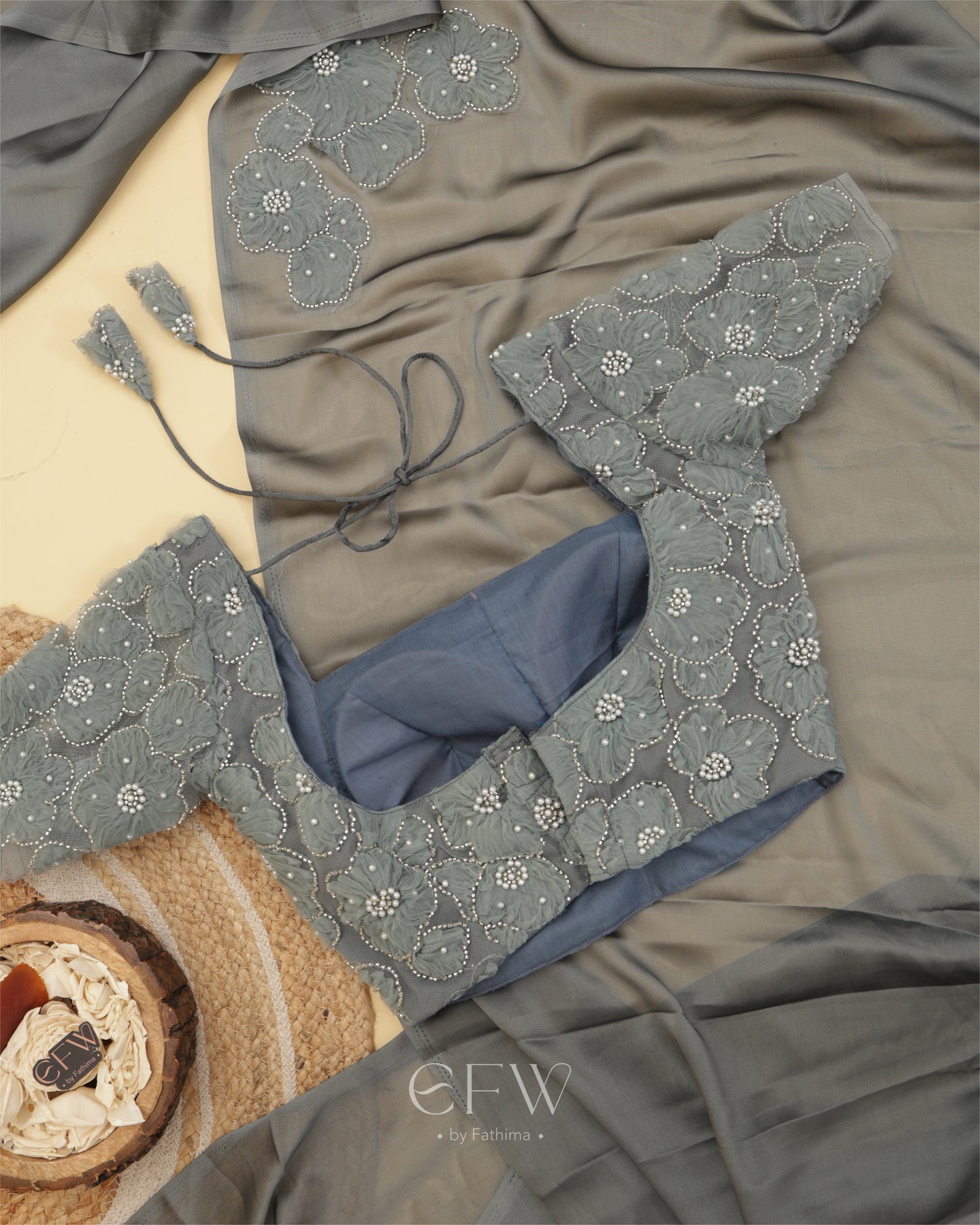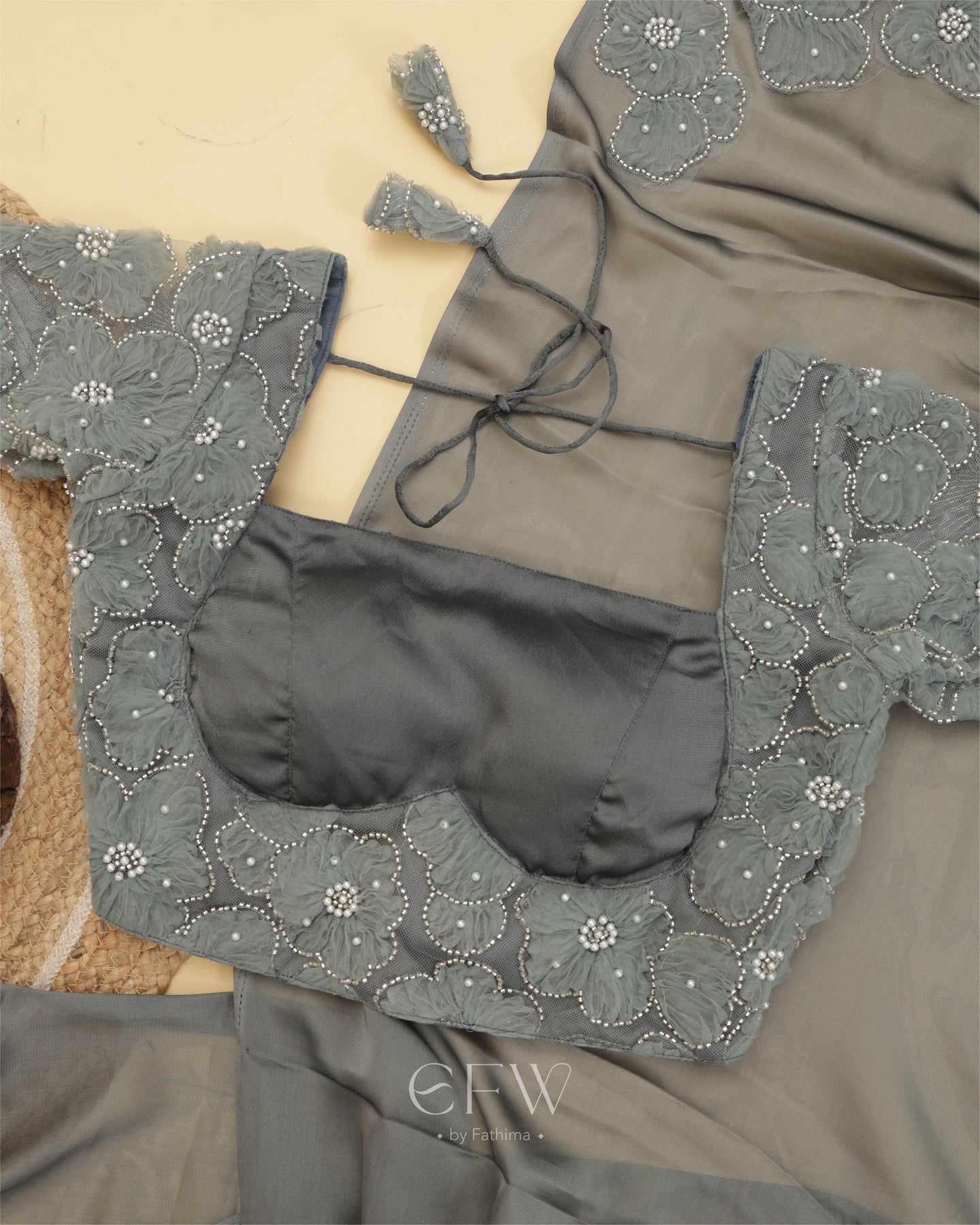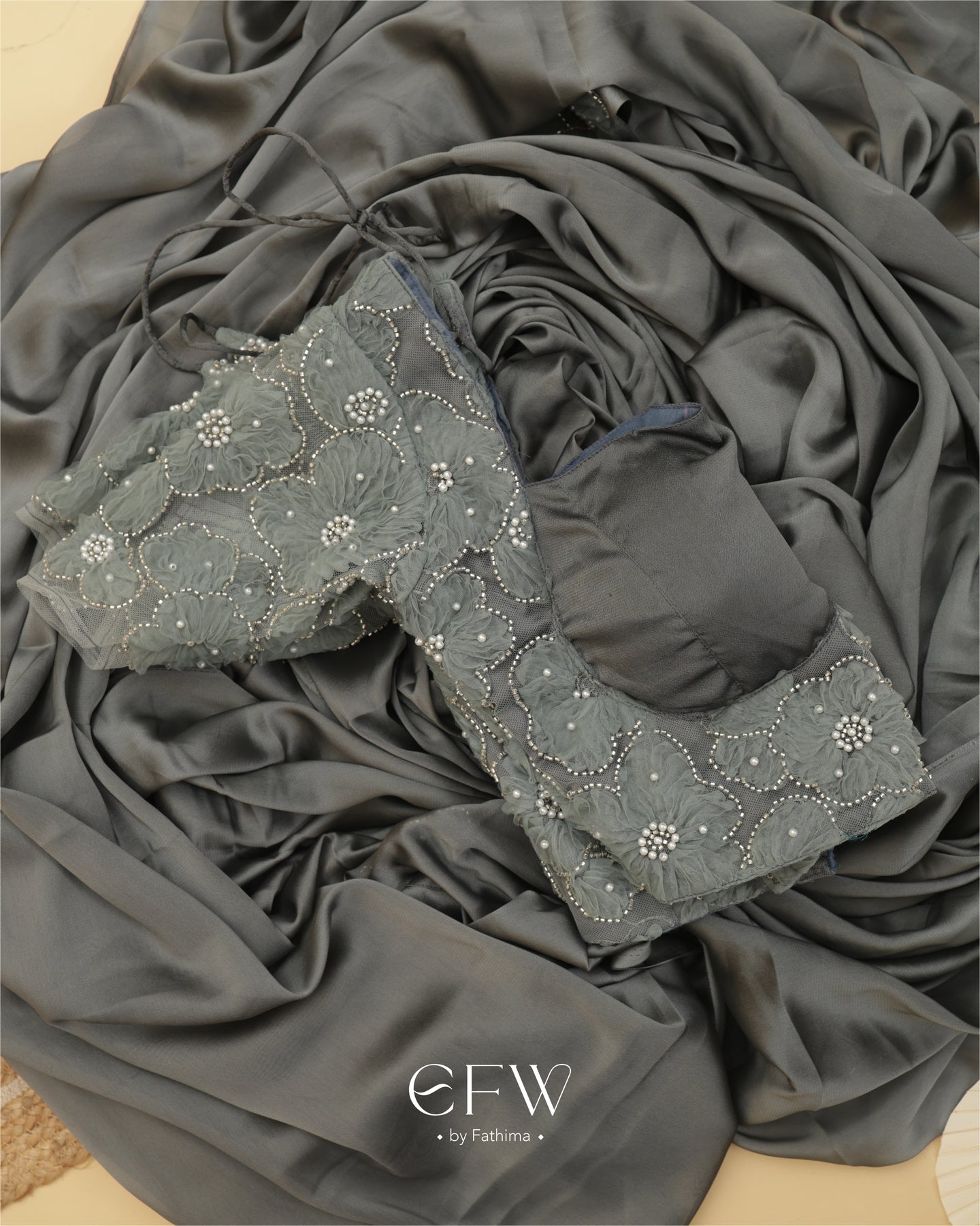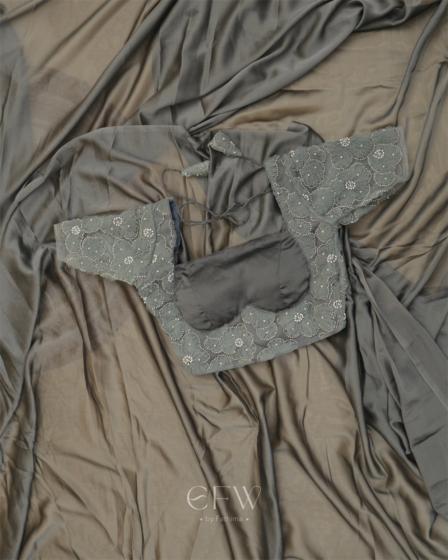 The saree flows in a rich weave that catches the light with every step. A soft shimmer elevates the fabric while floral hand-appliqué work in tonal shades adds dimension. Each flower is meticulously embroidered with pearls and sequins, subtly placed along the drape for understated glamour.
