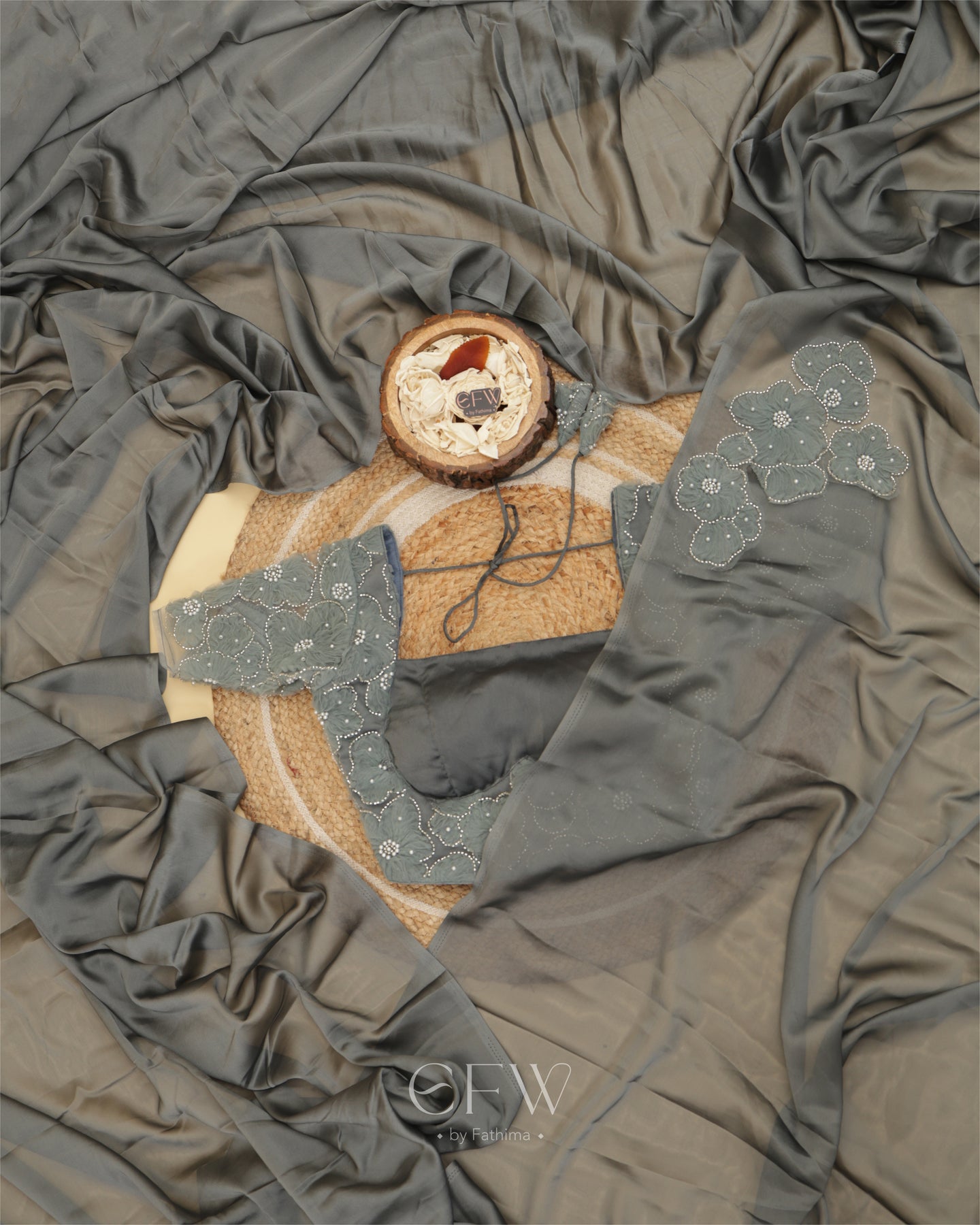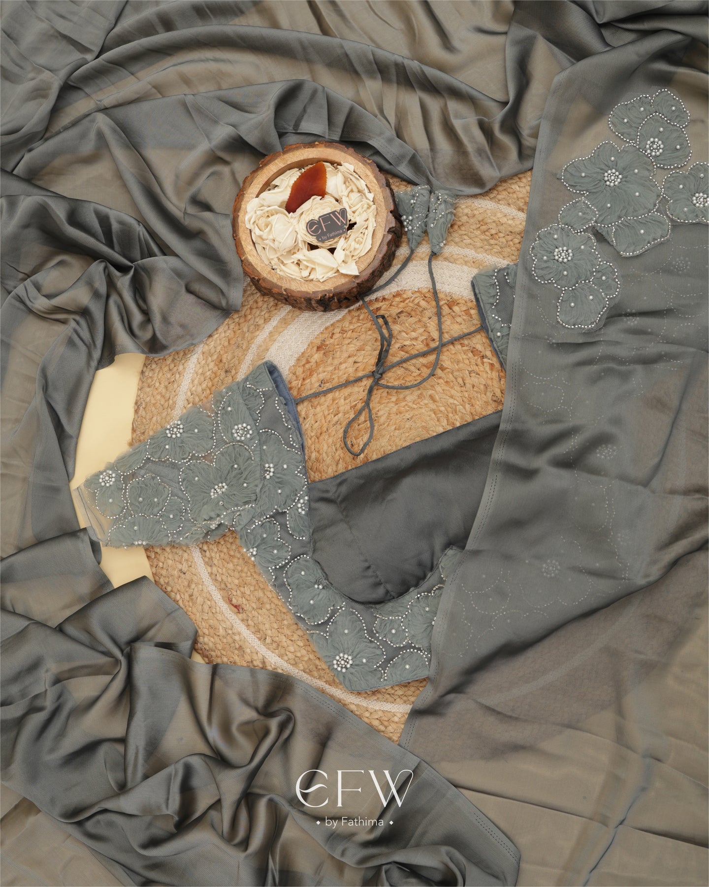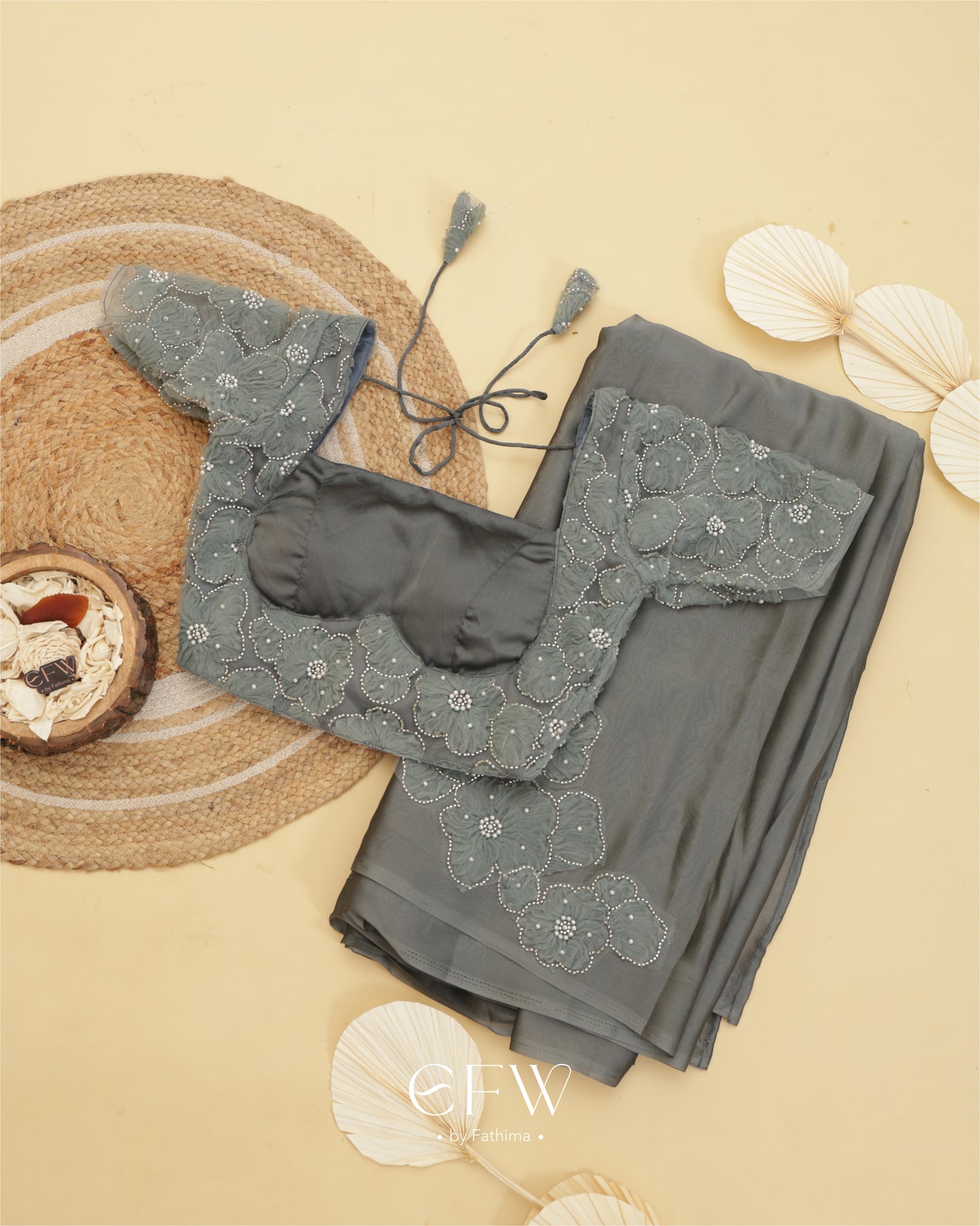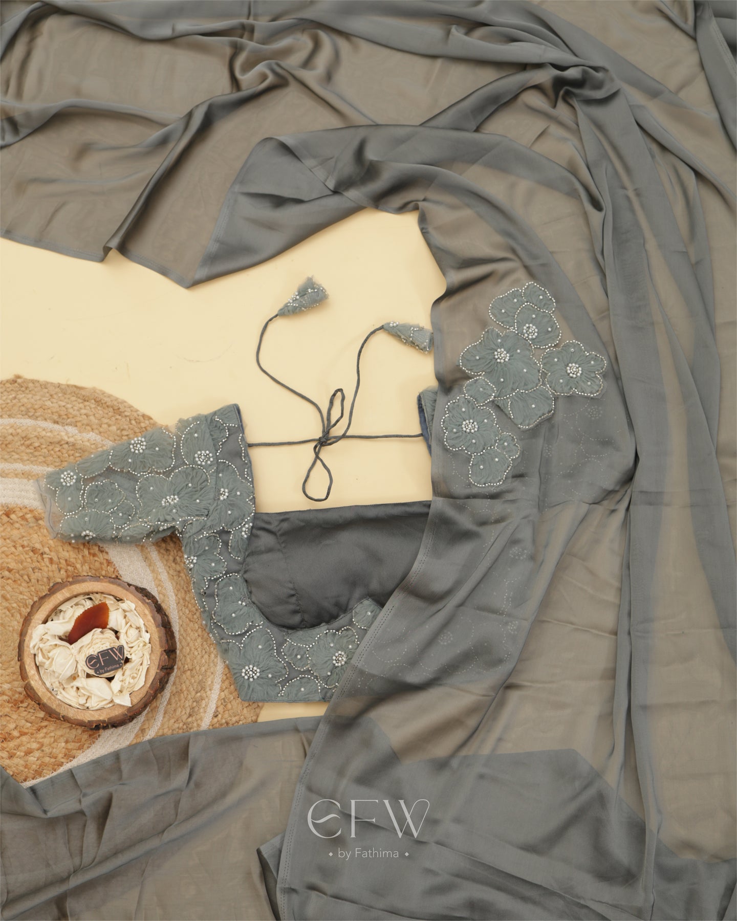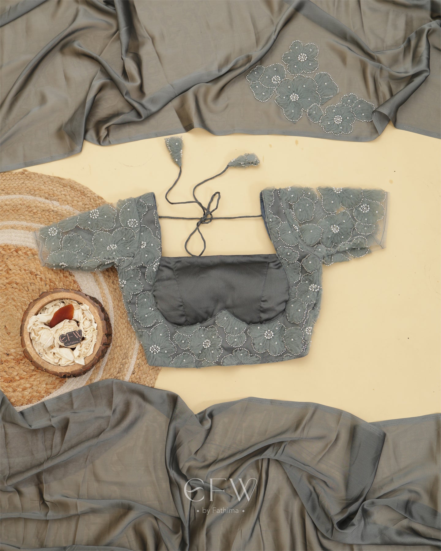 The saree flows in a rich weave that catches the light with every step. A soft shimmer elevates the fabric while floral hand-appliqué work in tonal shades adds dimension. Each flower is meticulously embroidered with pearls and sequins, subtly placed along the drape for understated glamour.