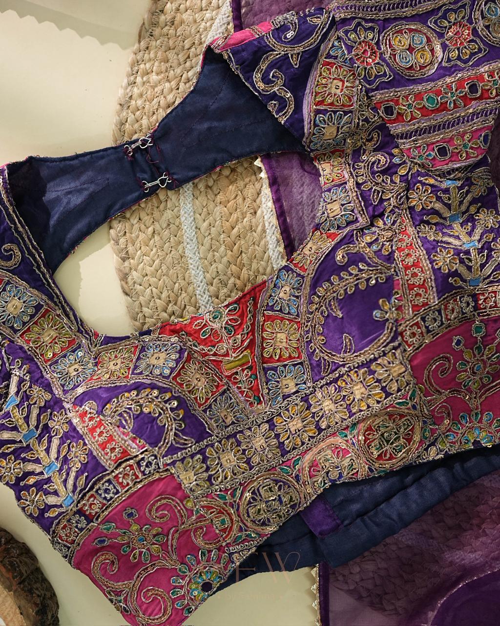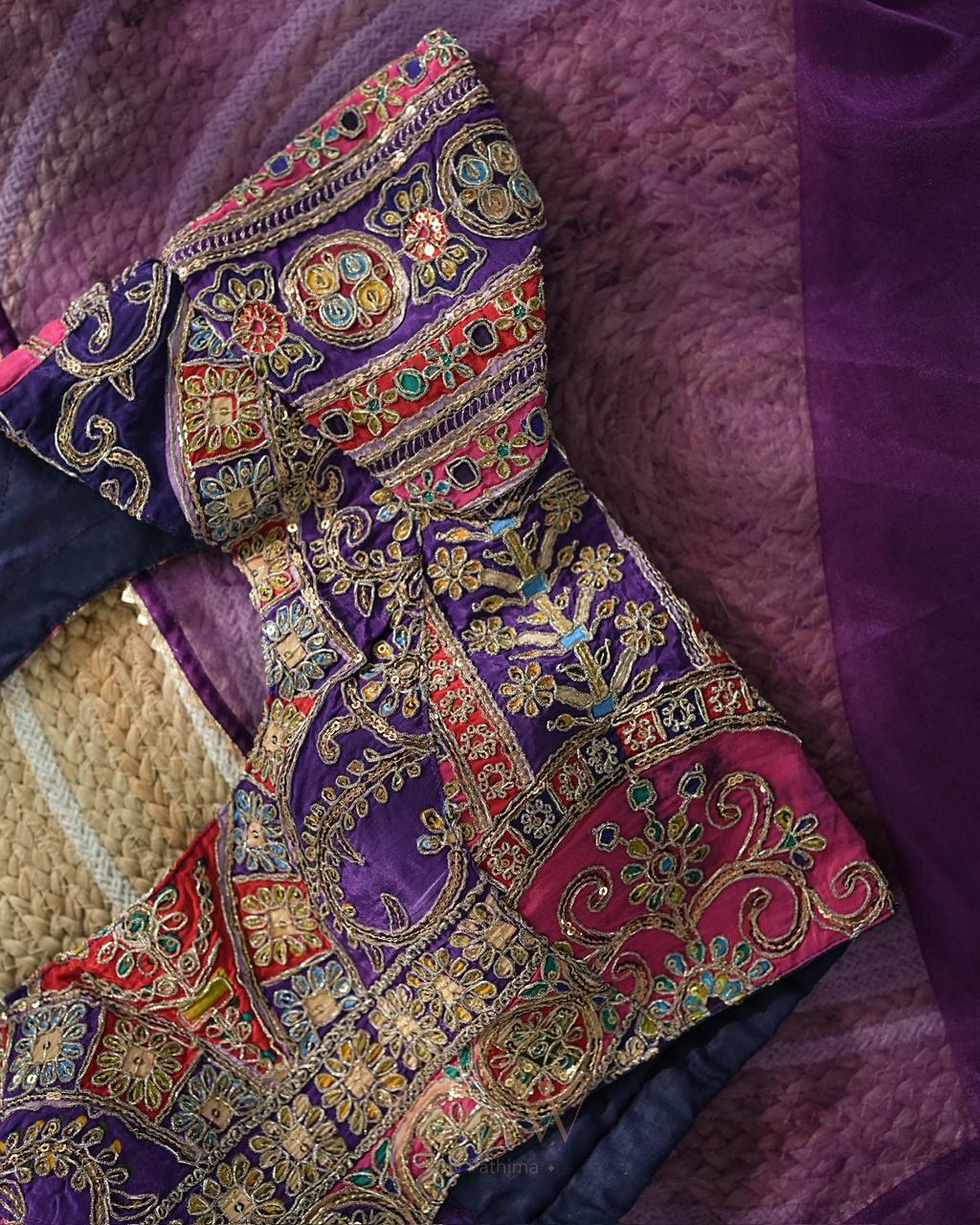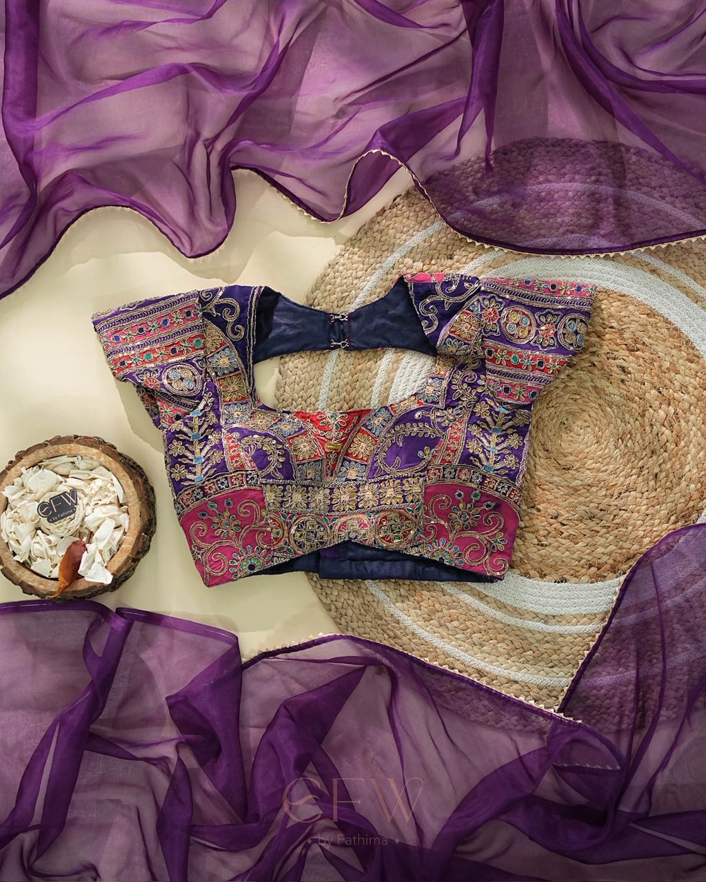 Comes with a rich deep purple blouse, embellished with intricate bead, and zari embroidery in regal motifs.