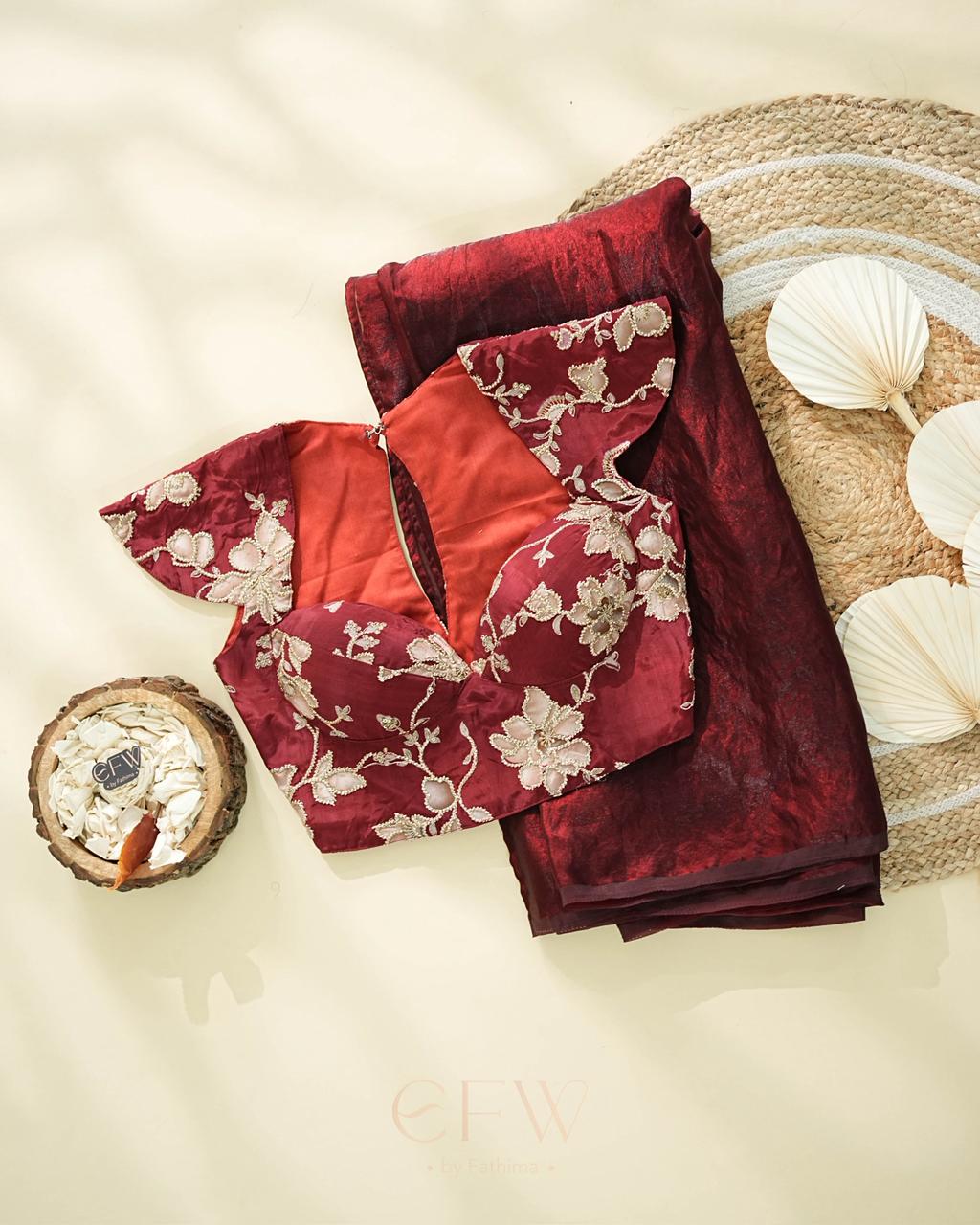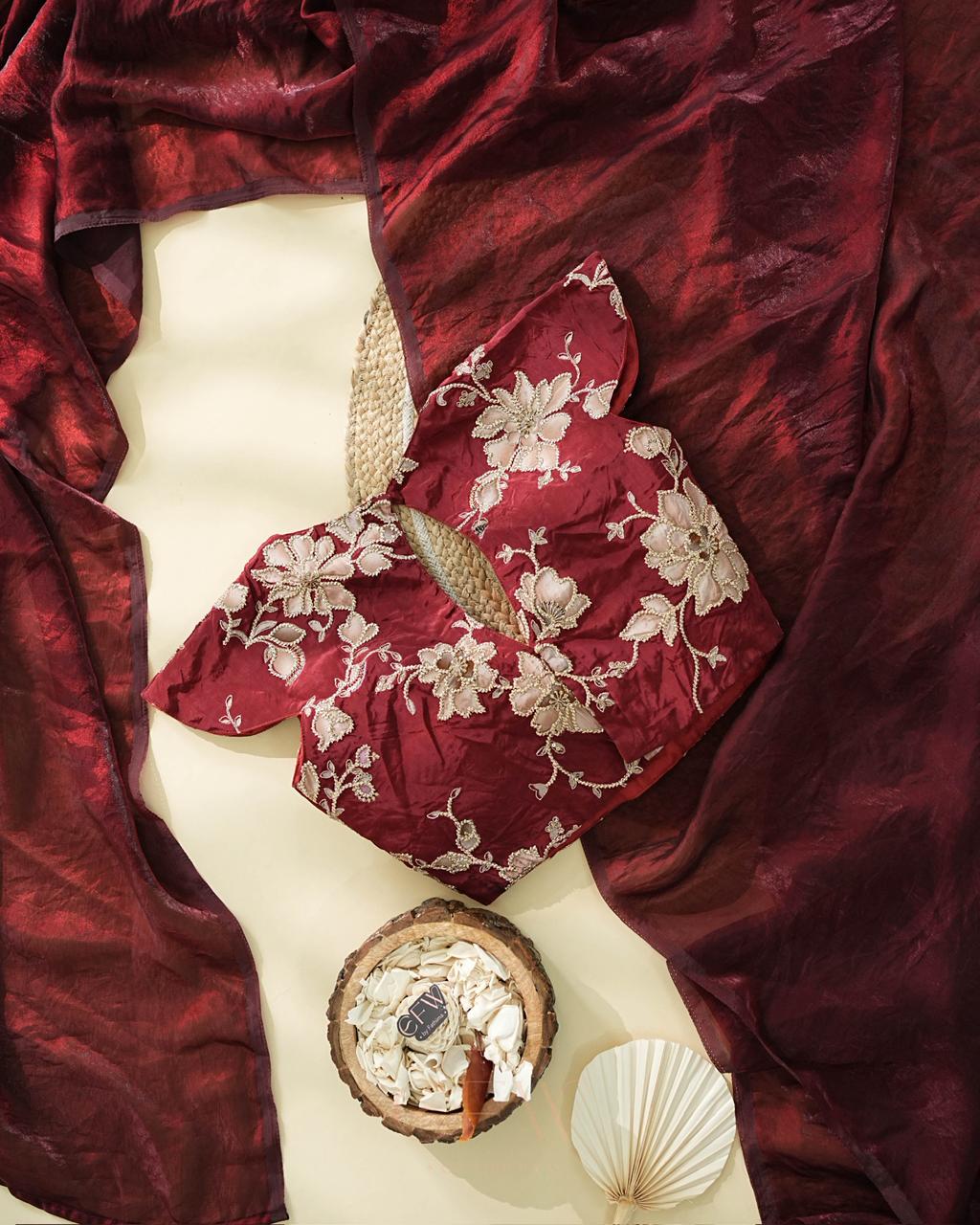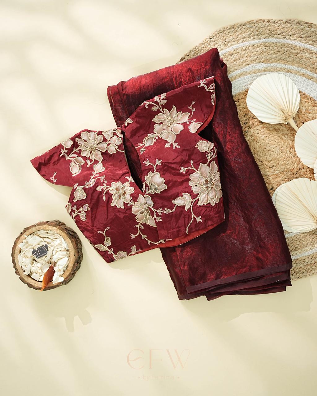This exquisite saree set in deep maroon radiates timeless luxury and grace. The saree, crafted from lustrous silk, drapes beautifully with a subtle sheen that enhances its regal charm. The highlight of the ensemble is the intricately embroidered blouse, adorned with delicate gold floral motifs and shimmering beadwork that elevate its opulence. The structured neckline and dramatic flared sleeves add a contemporary twist, creating a perfect balance between traditional craftsmanship and modern elegance. Ideal for weddings, receptions, or evening festivities, this ensemble embodies refined sophistication — bold, elegant, and effortlessly captivating.