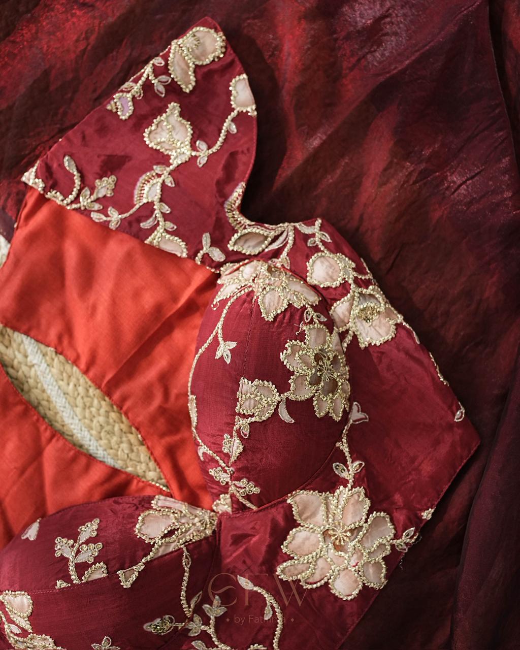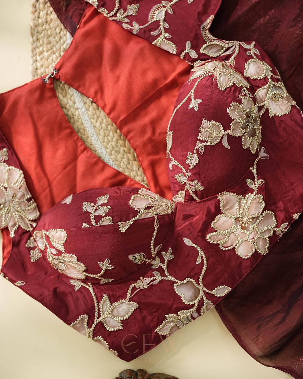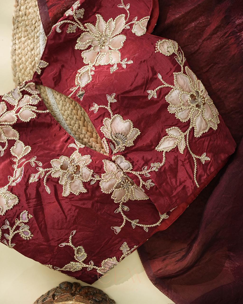 This exquisite saree set in deep maroon radiates timeless luxury and grace. The saree, crafted from lustrous silk, drapes beautifully with a subtle sheen that enhances its regal charm. The highlight of the ensemble is the intricately embroidered blouse, adorned with delicate gold floral motifs and shimmering beadwork that elevate its opulence. The structured neckline and dramatic flared sleeves add a contemporary twist, creating a perfect balance between traditional craftsmanship and modern elegance. Ideal for weddings, receptions, or evening festivities, this ensemble embodies refined sophistication — bold, elegant, and effortlessly captivating.