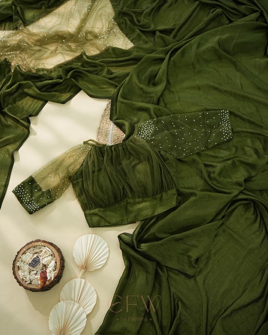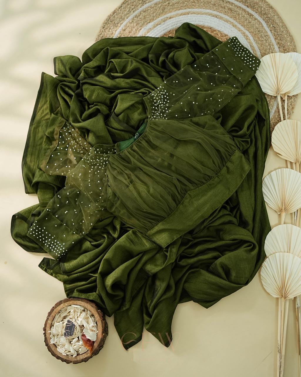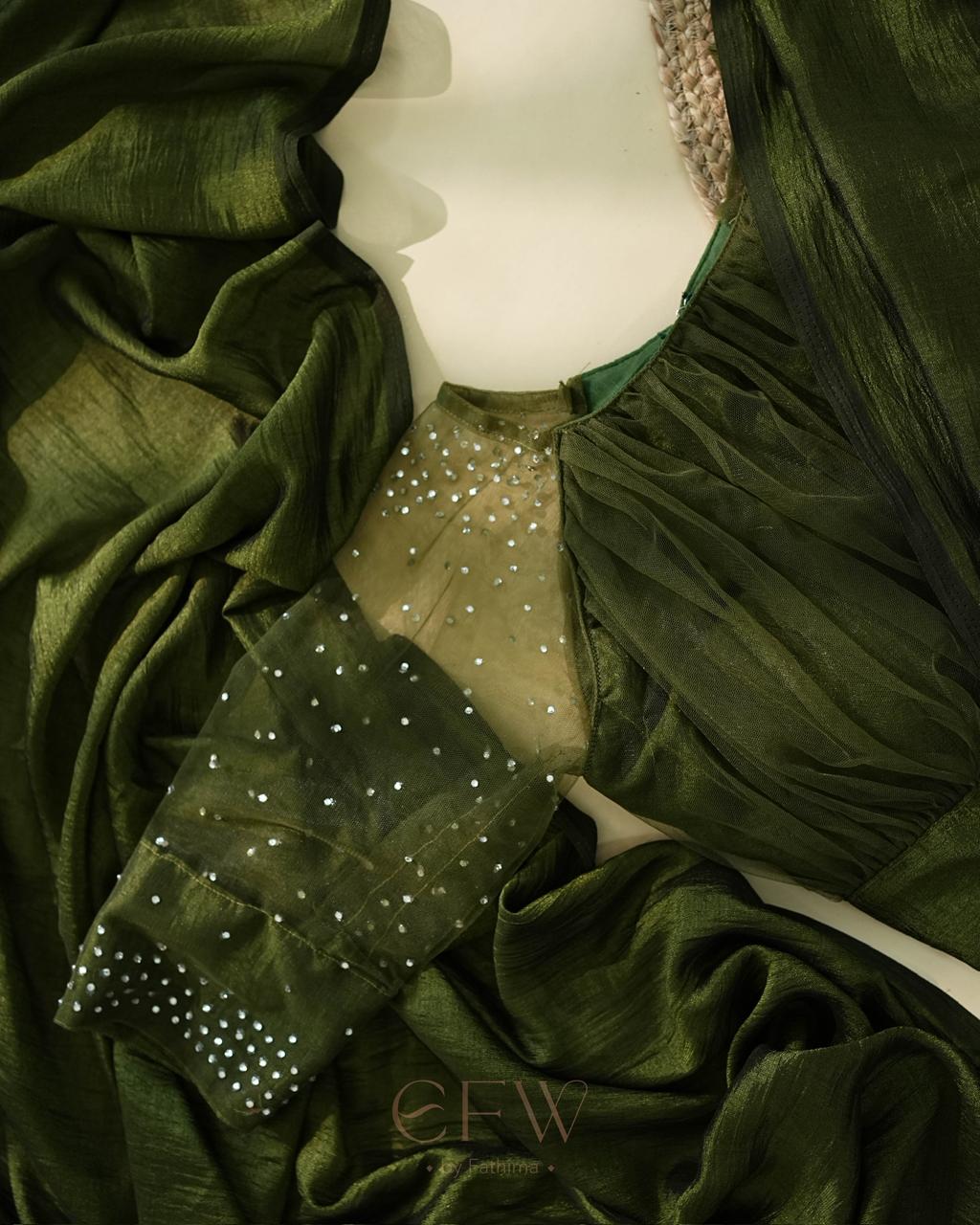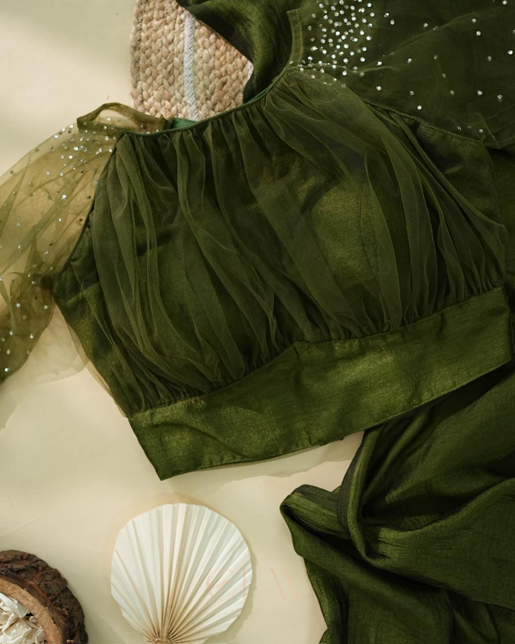 This exquisite saree set in a deep olive green tone embodies quiet luxury and modern poise. The saree, crafted from textured silk, drapes beautifully with a natural sheen that enhances its sophisticated appeal. Its matching blouse features a contemporary gathered net overlay, delicately adorned with scattered crystal embellishments along the neckline and sleeves, adding a subtle sparkle to its earthy base. The half-sheer sleeves and soft pleated detailing bring a refined, romantic edge to the overall look. Perfect for cocktail evenings, festive gatherings, or intimate celebrations, this ensemble blends simplicity with glamour — making it an effortlessly elegant statement piece.
