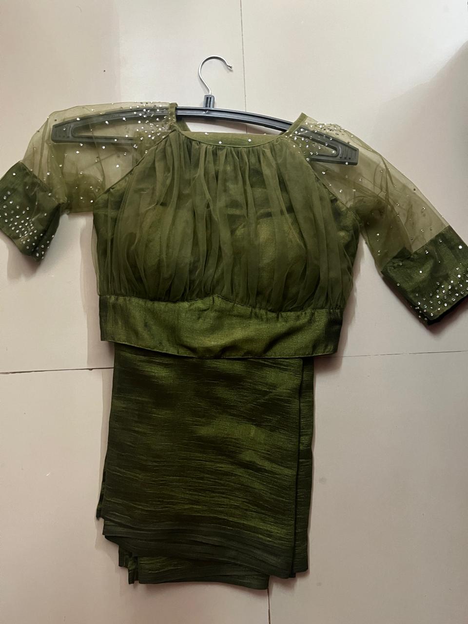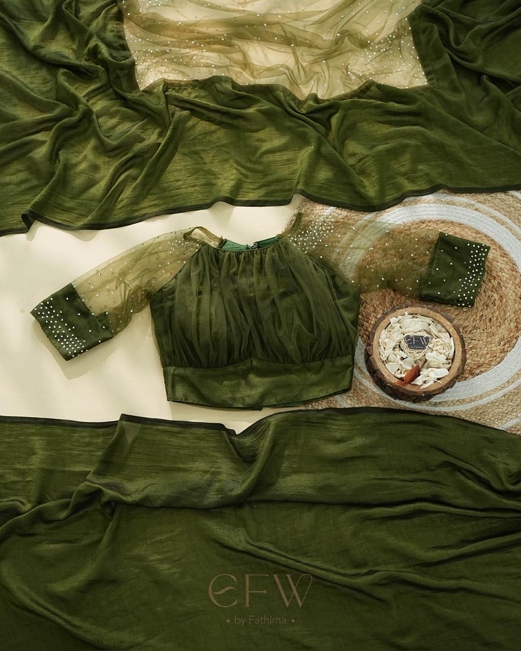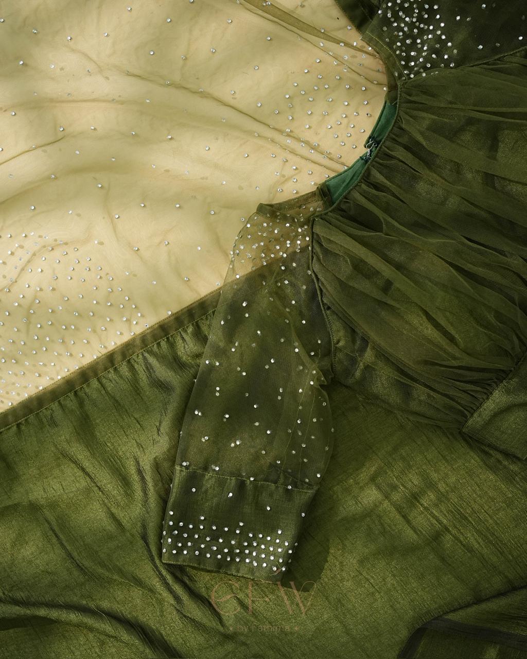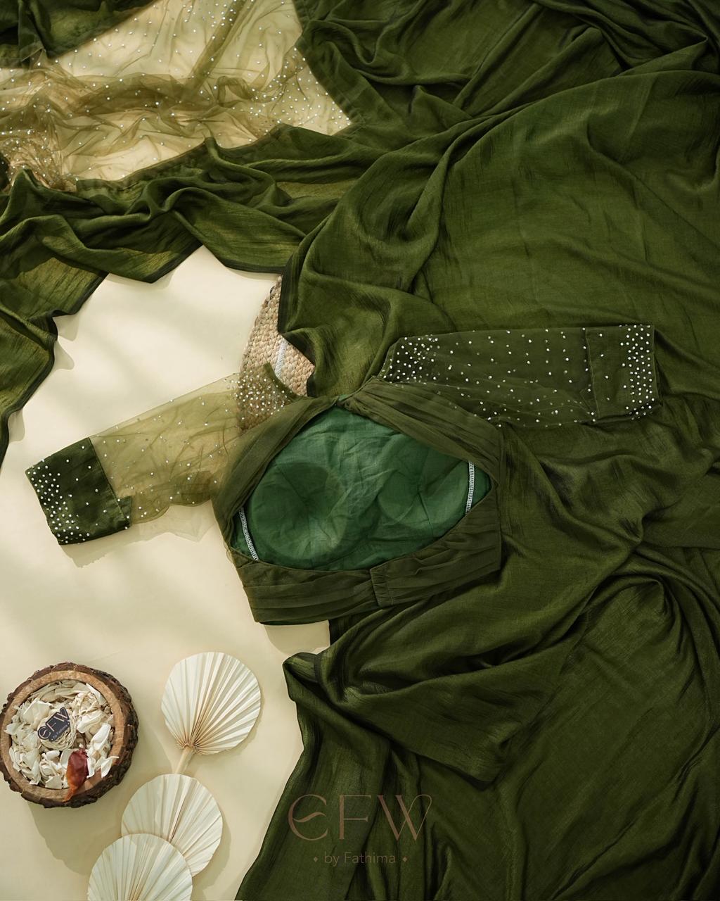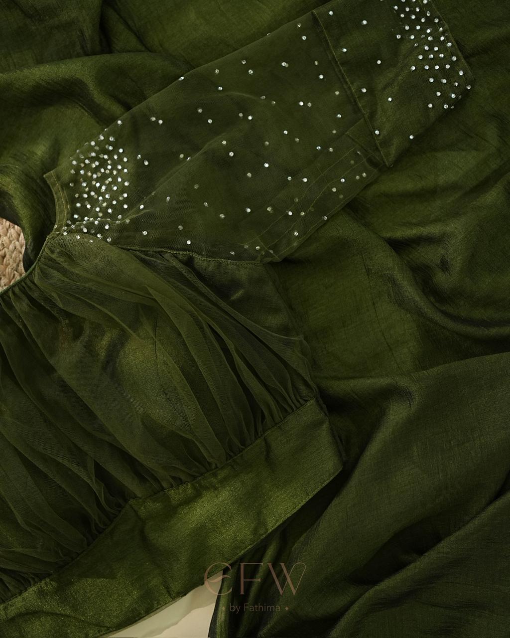 This exquisite saree set in a deep olive green tone embodies quiet luxury and modern poise. The saree, crafted from textured silk, drapes beautifully with a natural sheen that enhances its sophisticated appeal. Its matching blouse features a contemporary gathered net overlay, delicately adorned with scattered crystal embellishments along the neckline and sleeves, adding a subtle sparkle to its earthy base. The half-sheer sleeves and soft pleated detailing bring a refined, romantic edge to the overall look. Perfect for cocktail evenings, festive gatherings, or intimate celebrations, this ensemble blends simplicity with glamour — making it an effortlessly elegant statement piece.