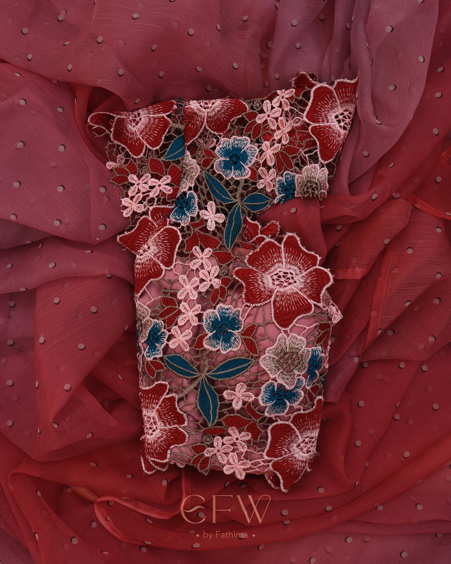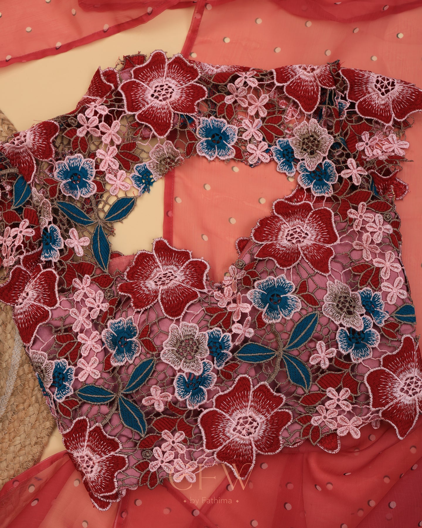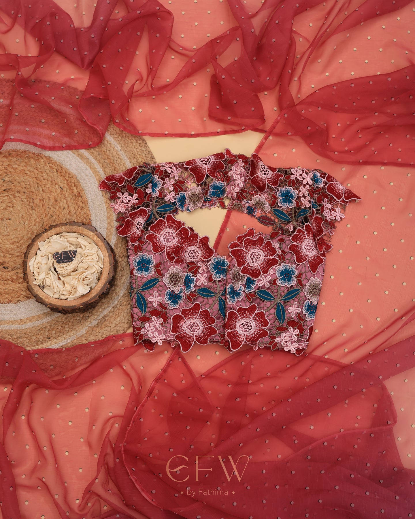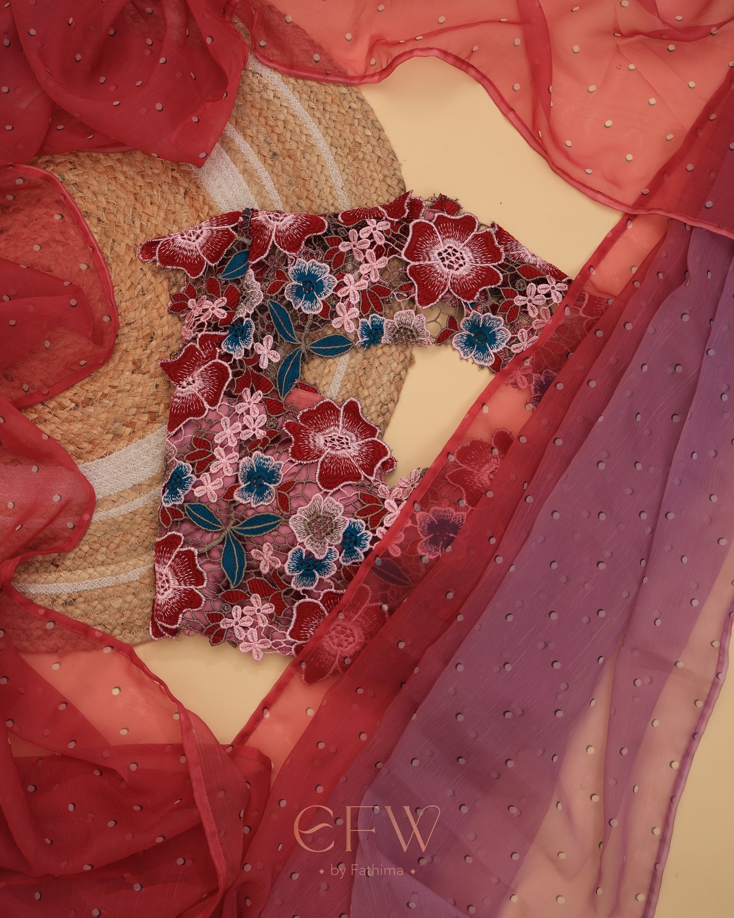 Paired with a pastel floral blouse in gentle shades, the look is complete without needing any extra effort. The blouse itself is a piece of art — romantic, versatile, and timeless.