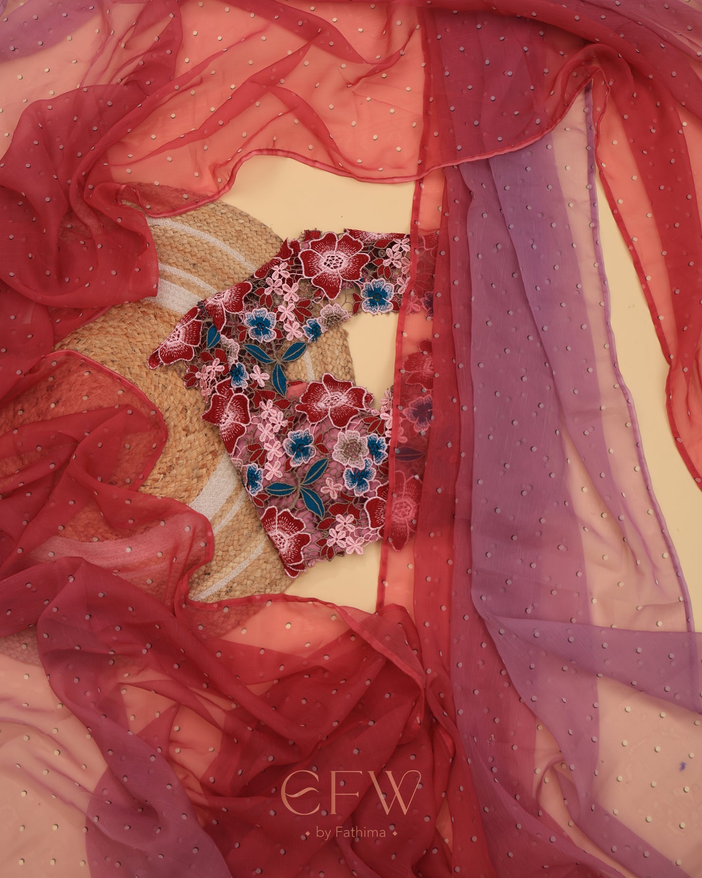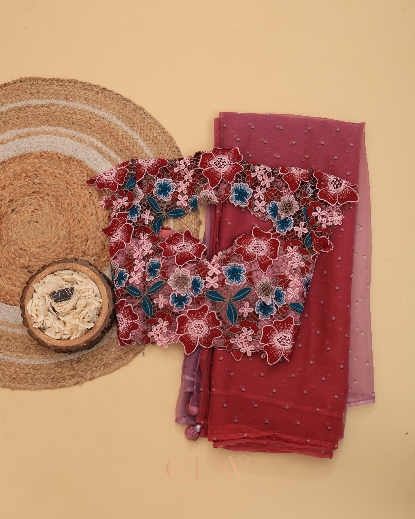 The fabric is soft chiffon with delicate dotted detailing, adding a playful texture while keeping the saree light as air. It’s the ultimate “one-minute drape” saree — weightless, flowy, and so easy to carry that you’ll forget you’re even wearing it.