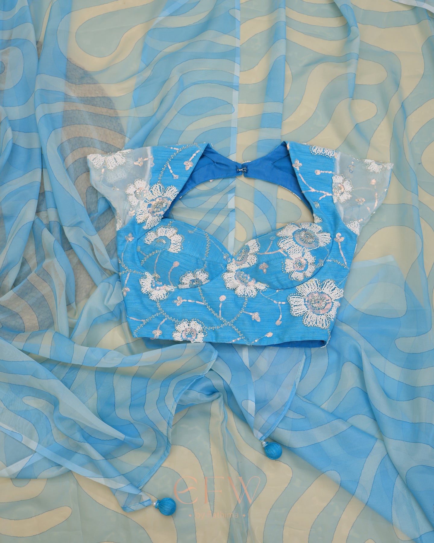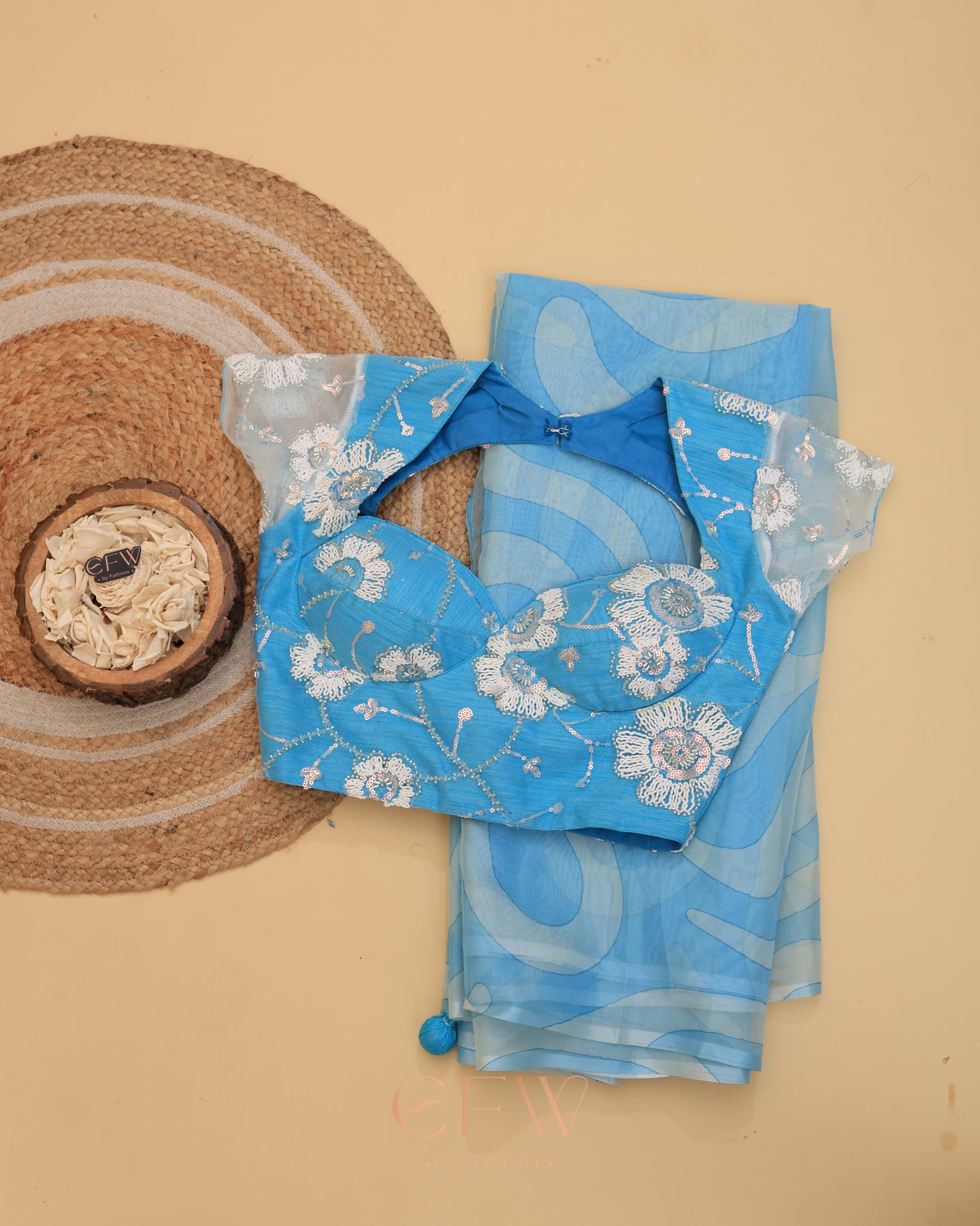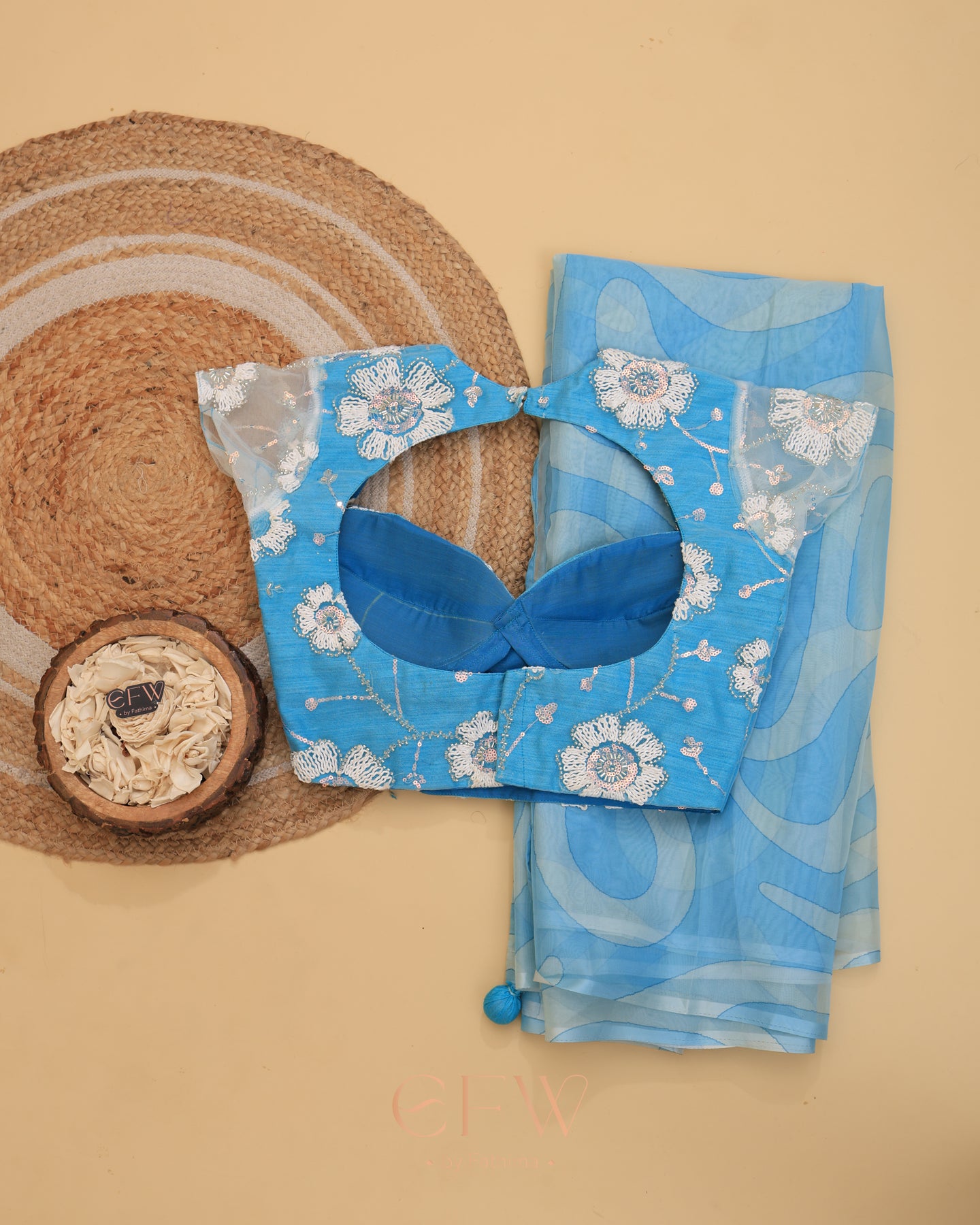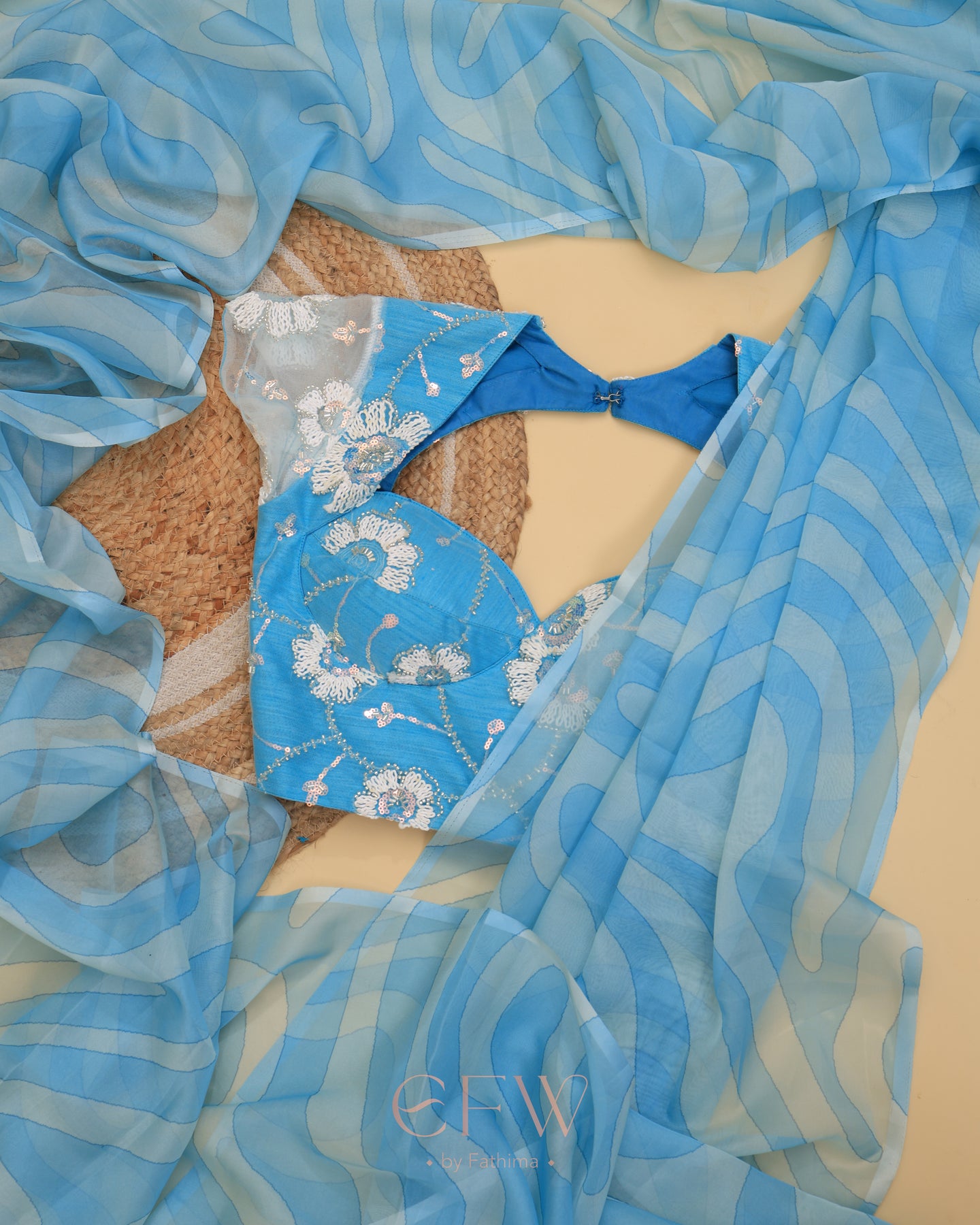 Step into effortless elegance with Azura luxe, a saree that radiates freshness and charm in its serene aqua blue shade. The flowing organza base is designed with subtle wave-like patterns, lending a modern yet fluid appeal to the drape.