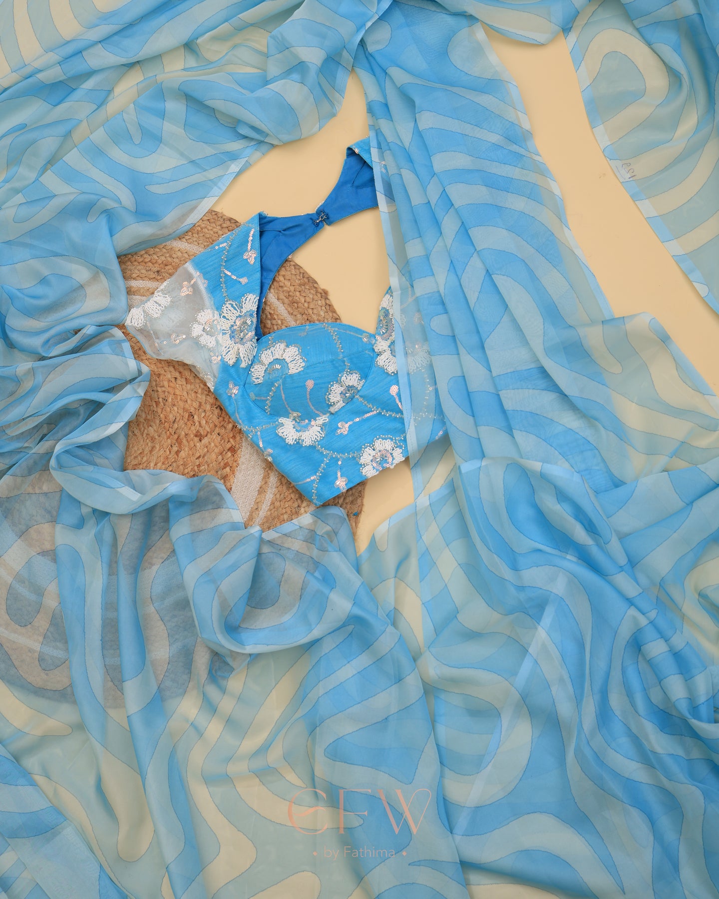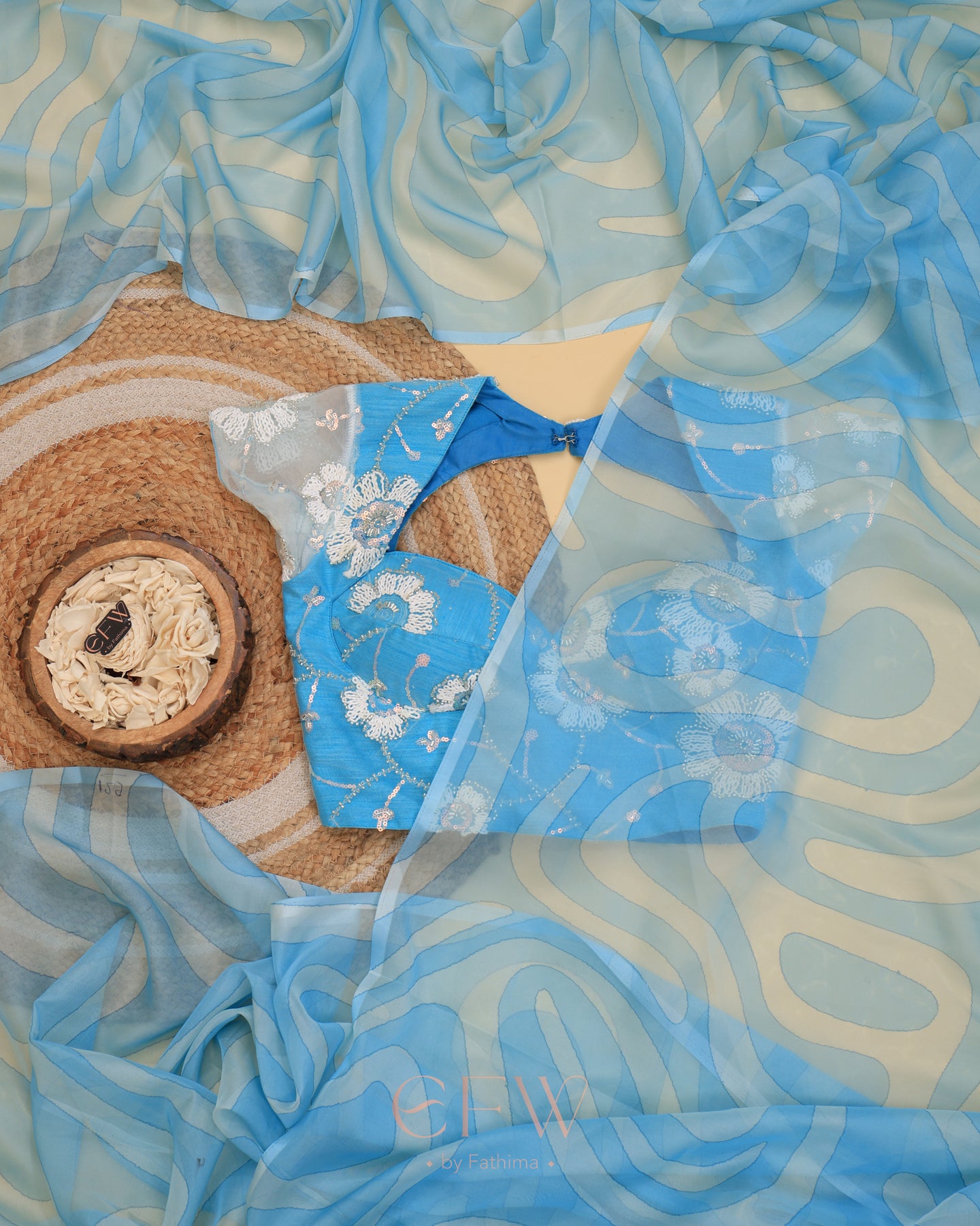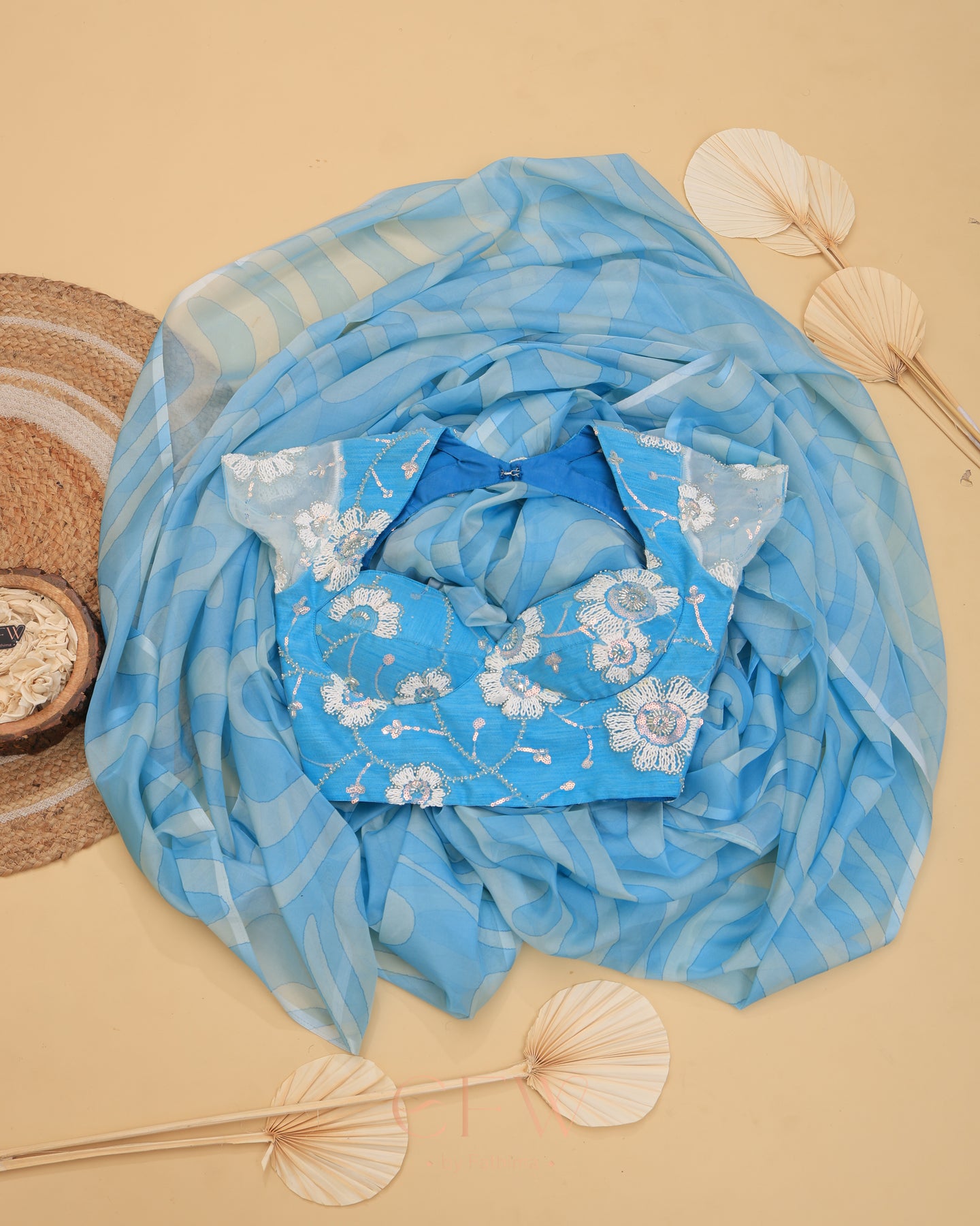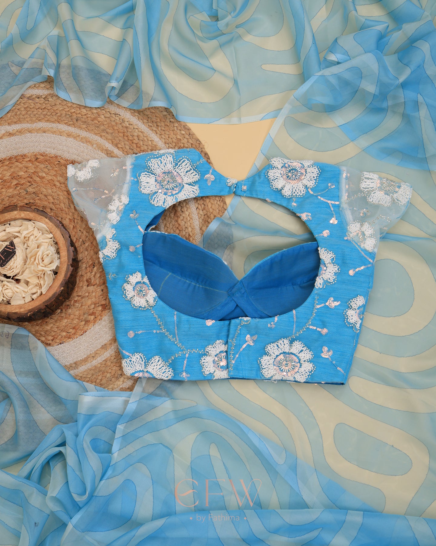 Step into effortless elegance with Azura luxe, a saree that radiates freshness and charm in its serene aqua blue shade. The flowing organza base is designed with subtle wave-like patterns, lending a modern yet fluid appeal to the drape.