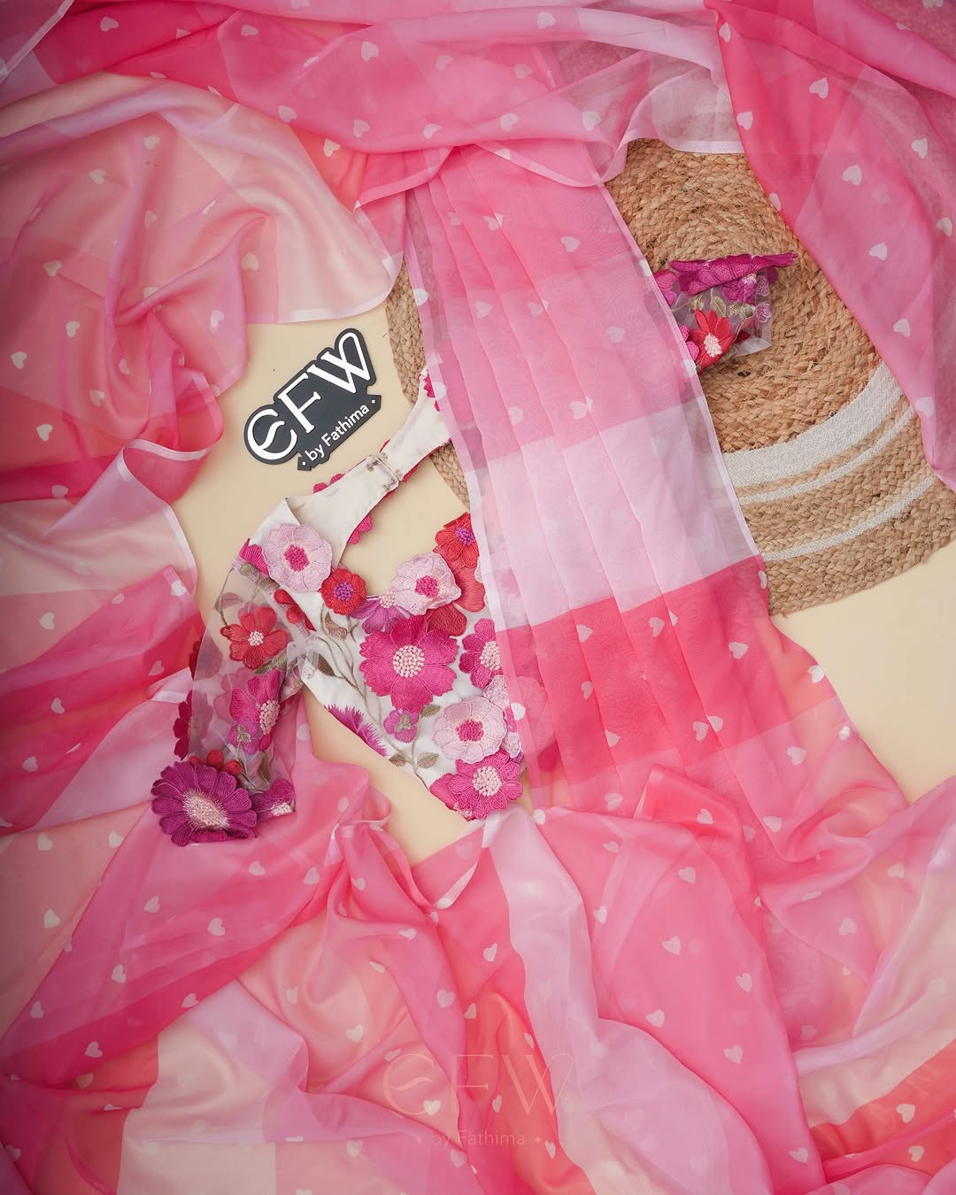 The Blossomia Heartbloom Saree Set is a dreamy celebration of romance, colour, and feminine charm. Crafted in a refreshing shade of bubblegum pink, the saree flows gently with soft translucent layers patterned with delicate white heart motifs — adding a playful, youthful touch to its drape. Lightweight and airy, it creates a whimsical silhouette that feels perfect for daytime festivities or cheerful celebrations.