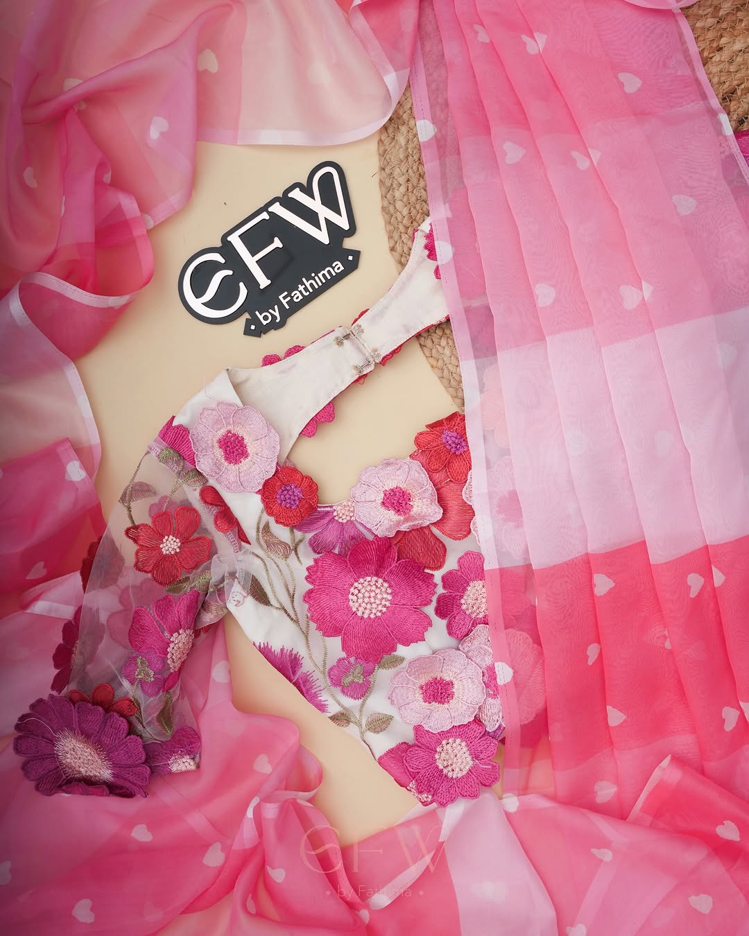 The show-stealer is the stunning 3D floral blouse adorned with exquisite embroidered blossoms in shades of fuchsia, rose pink, blush, and magenta. Each flower is delicately layered, creating a dimensional, handcrafted garden effect that instantly elevates the ensemble. The sheer shoulders and sculpted neckline enhance its romantic elegance.