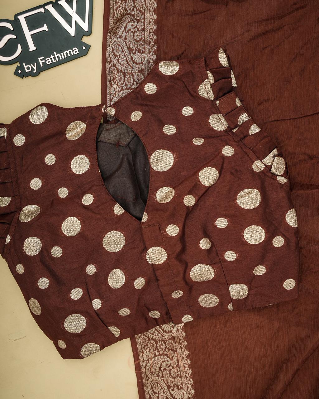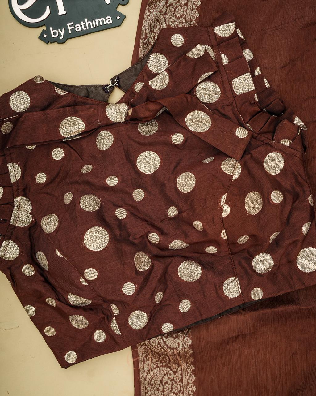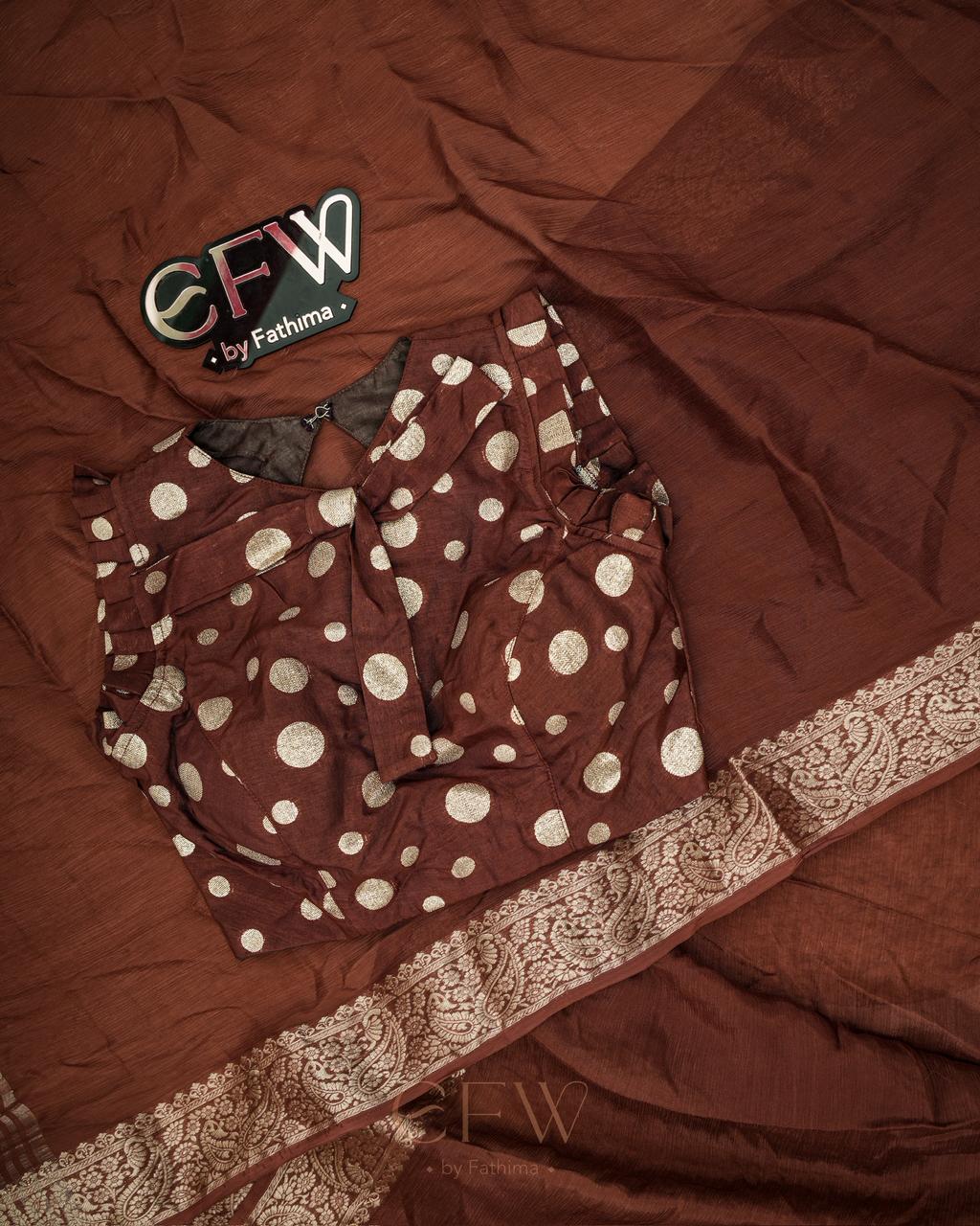 Warning: Prepare for endless stares and compliments in this dreamy saree! Soft chinon silk that feels like a whisper and drapes like a dream, complete with a gorgeous border and a polka dot silk blouse for that extra touch of elegance.