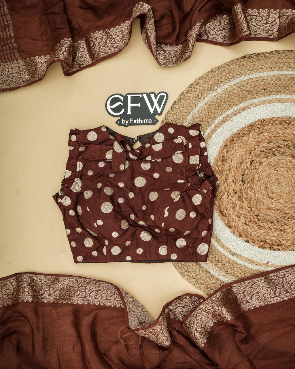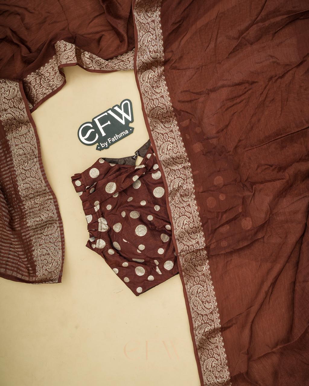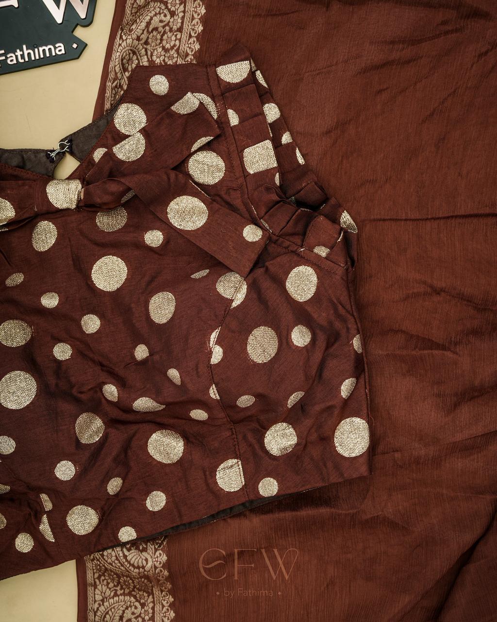 Warning: Prepare for endless stares and compliments in this dreamy saree! Soft chinon silk that feels like a whisper and drapes like a dream, complete with a gorgeous border and a polka dot silk blouse for that extra touch of elegance.