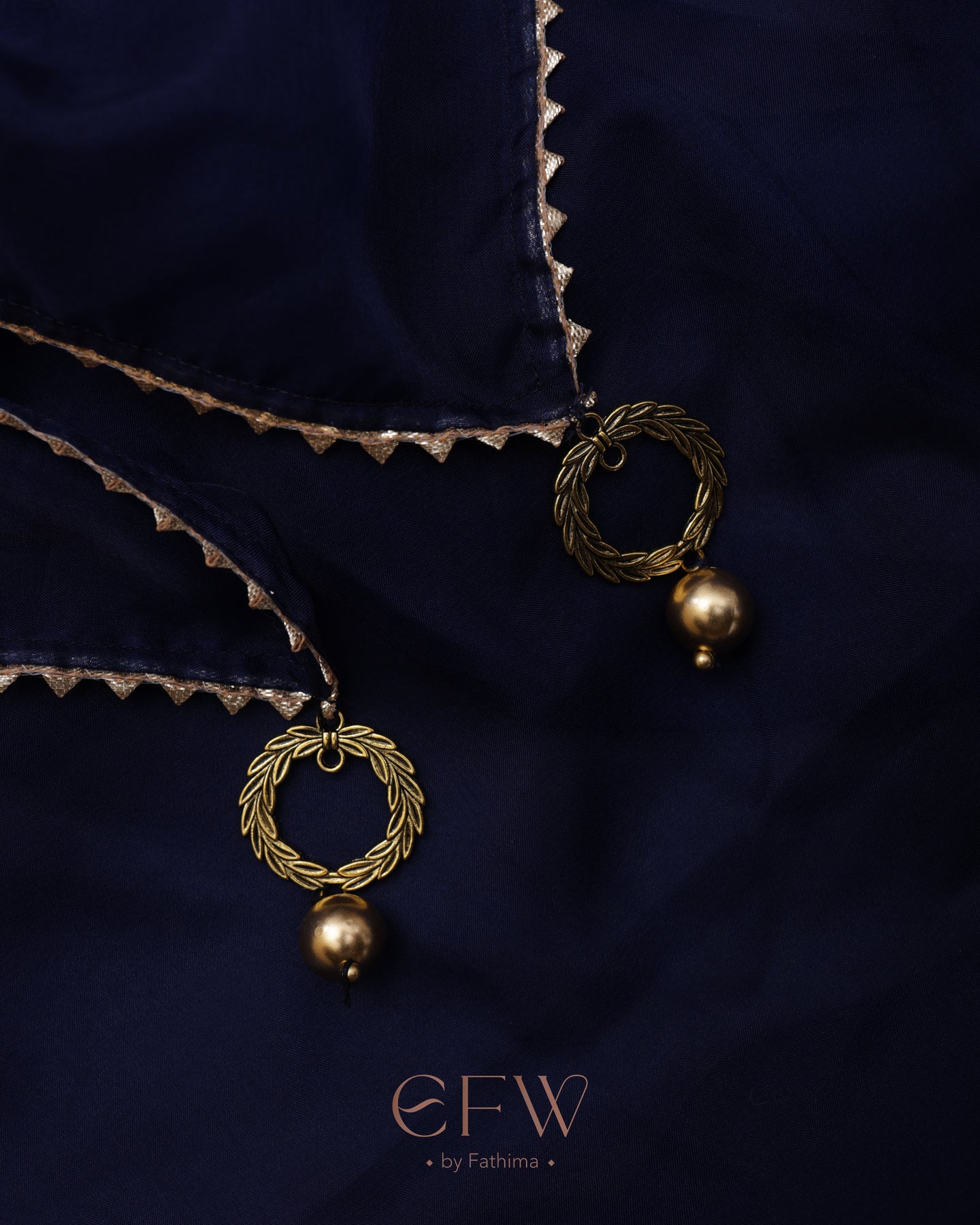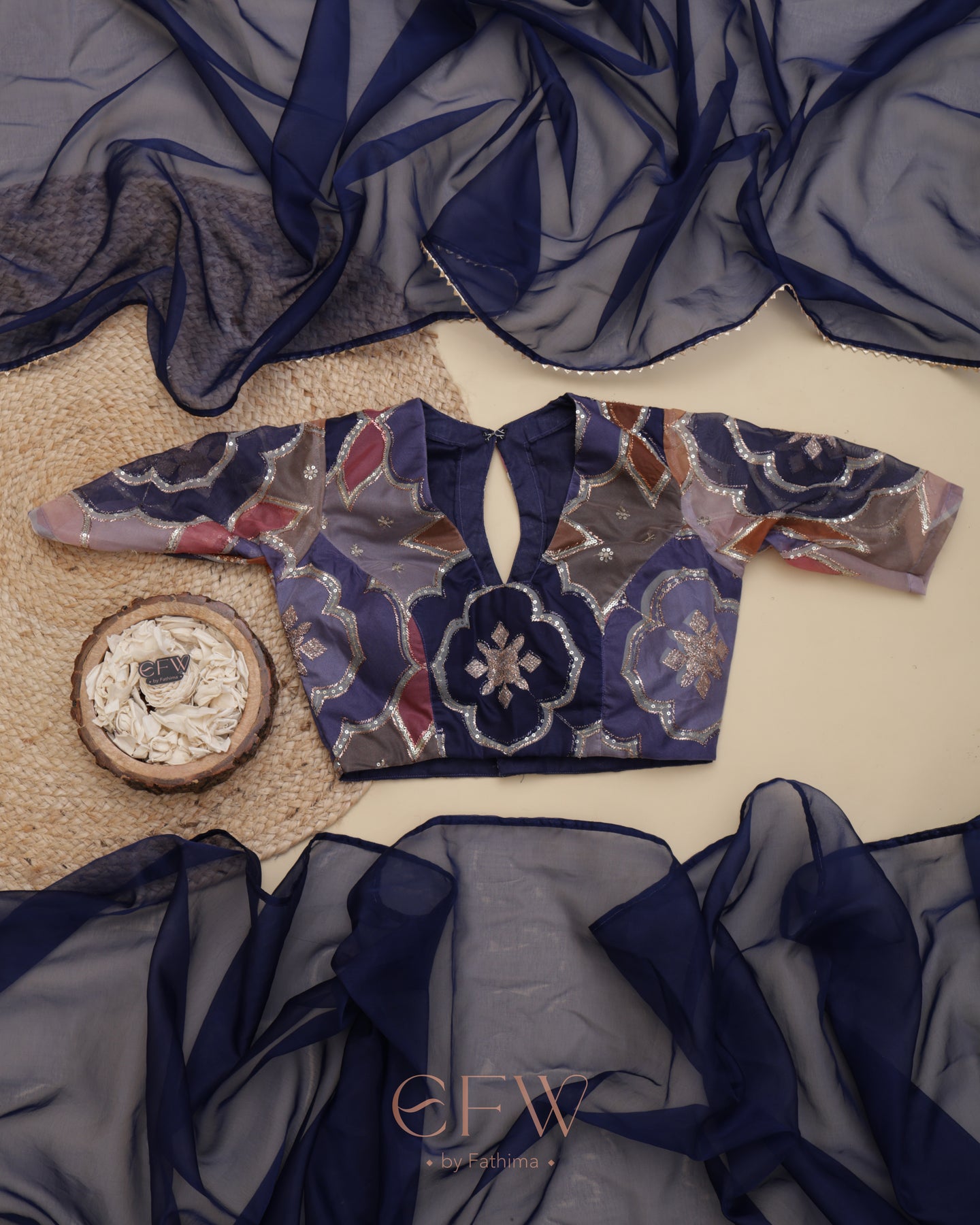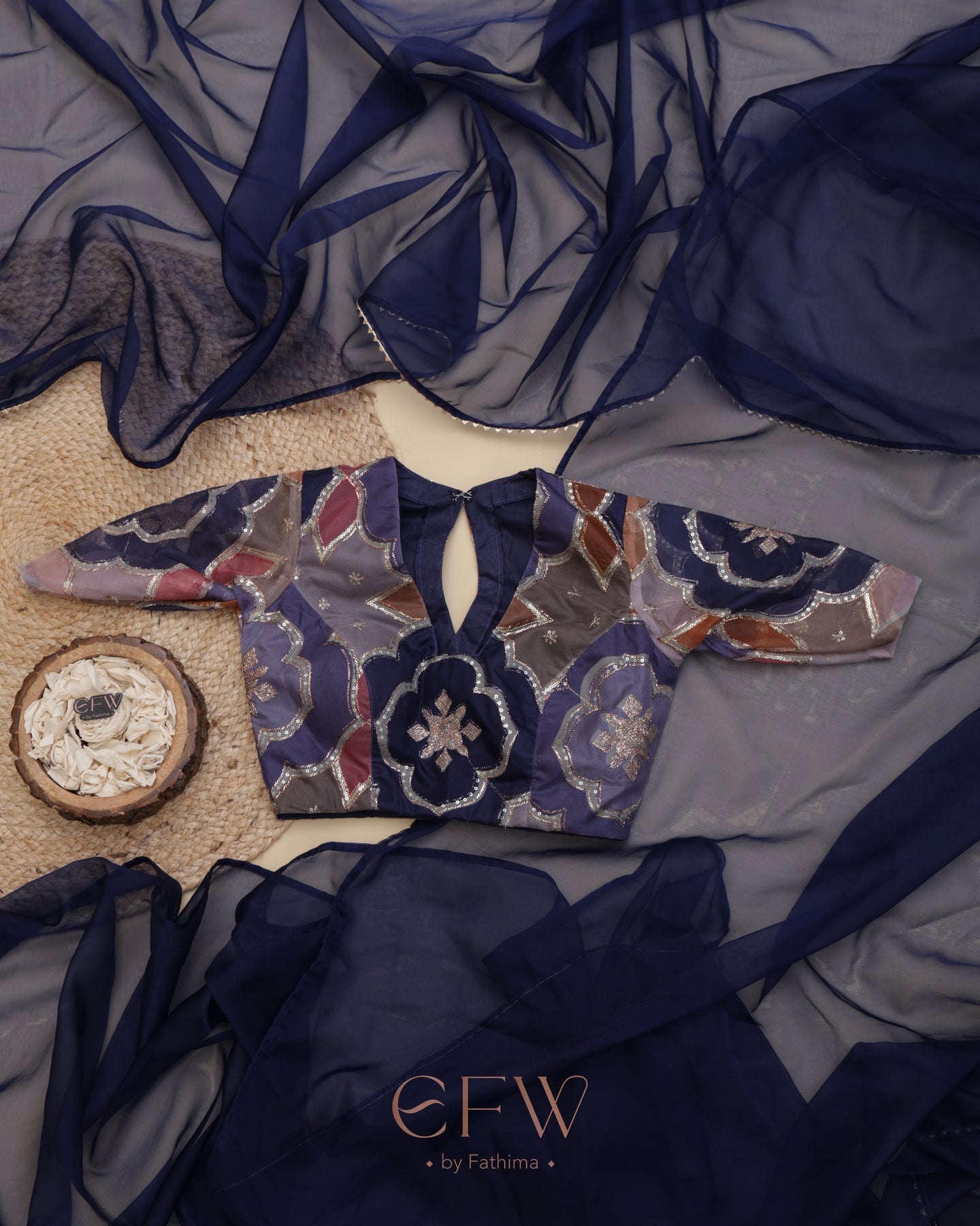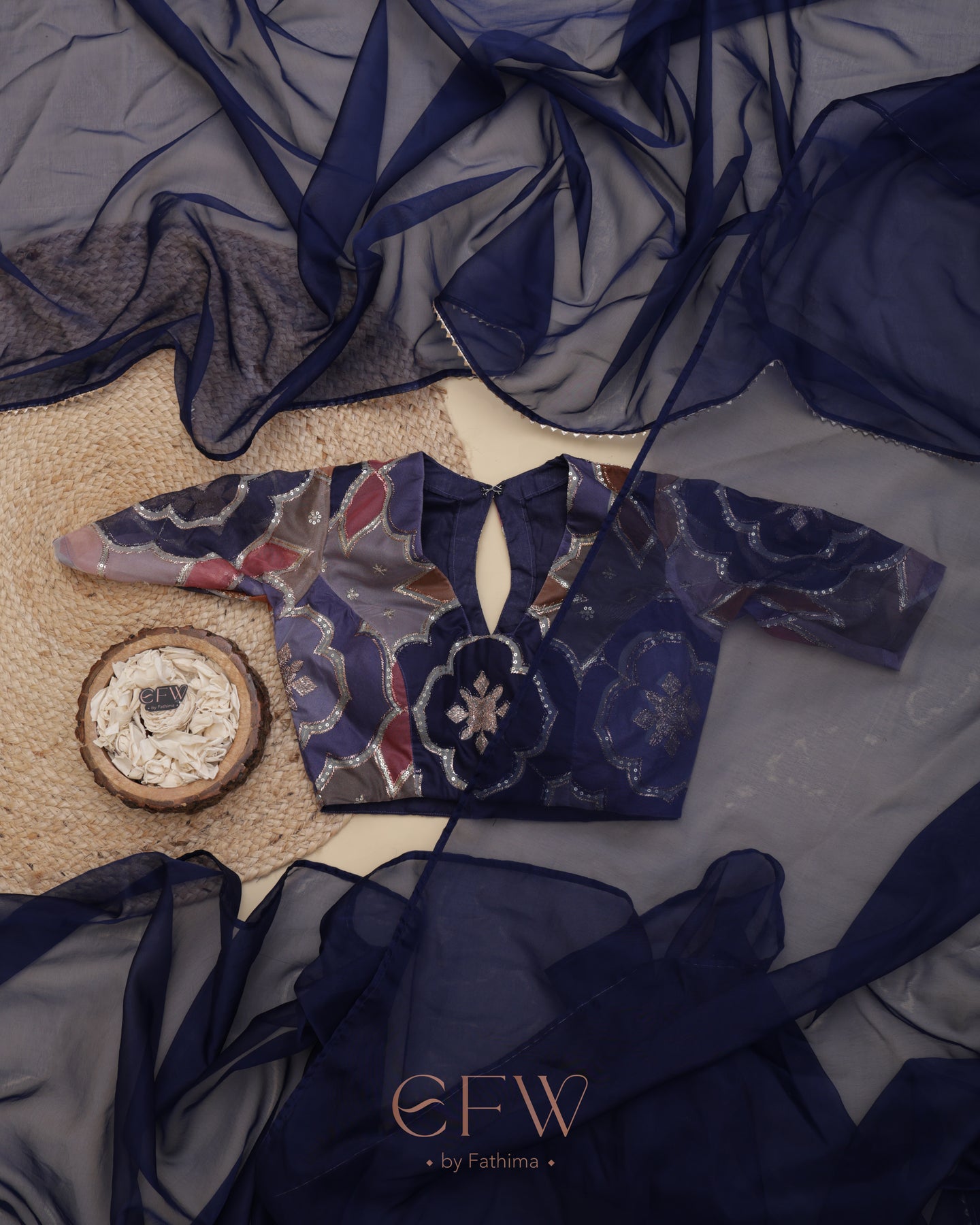 Midnight-blue organza drape with gold picot edge & a jewel-tone jharokha blouse.