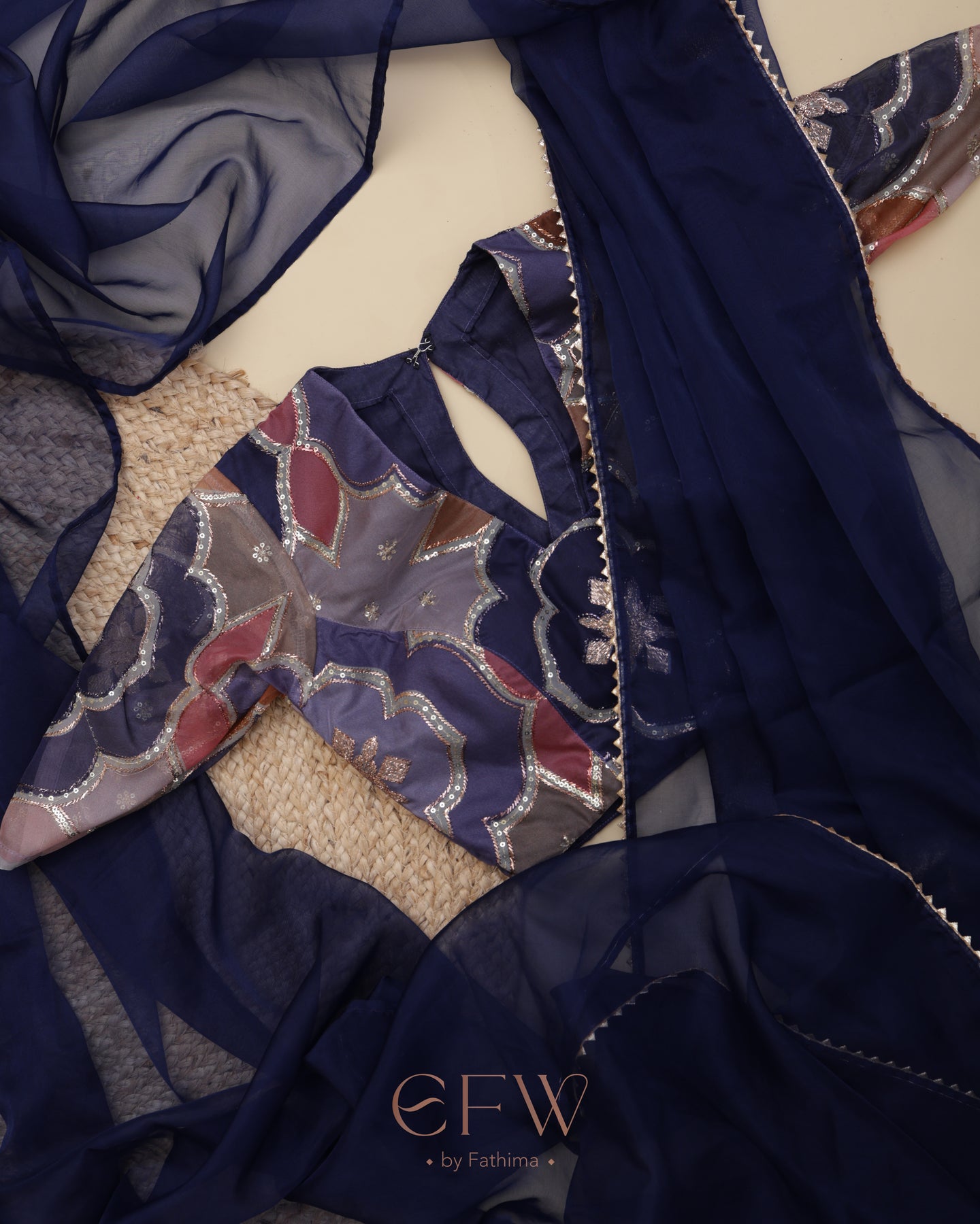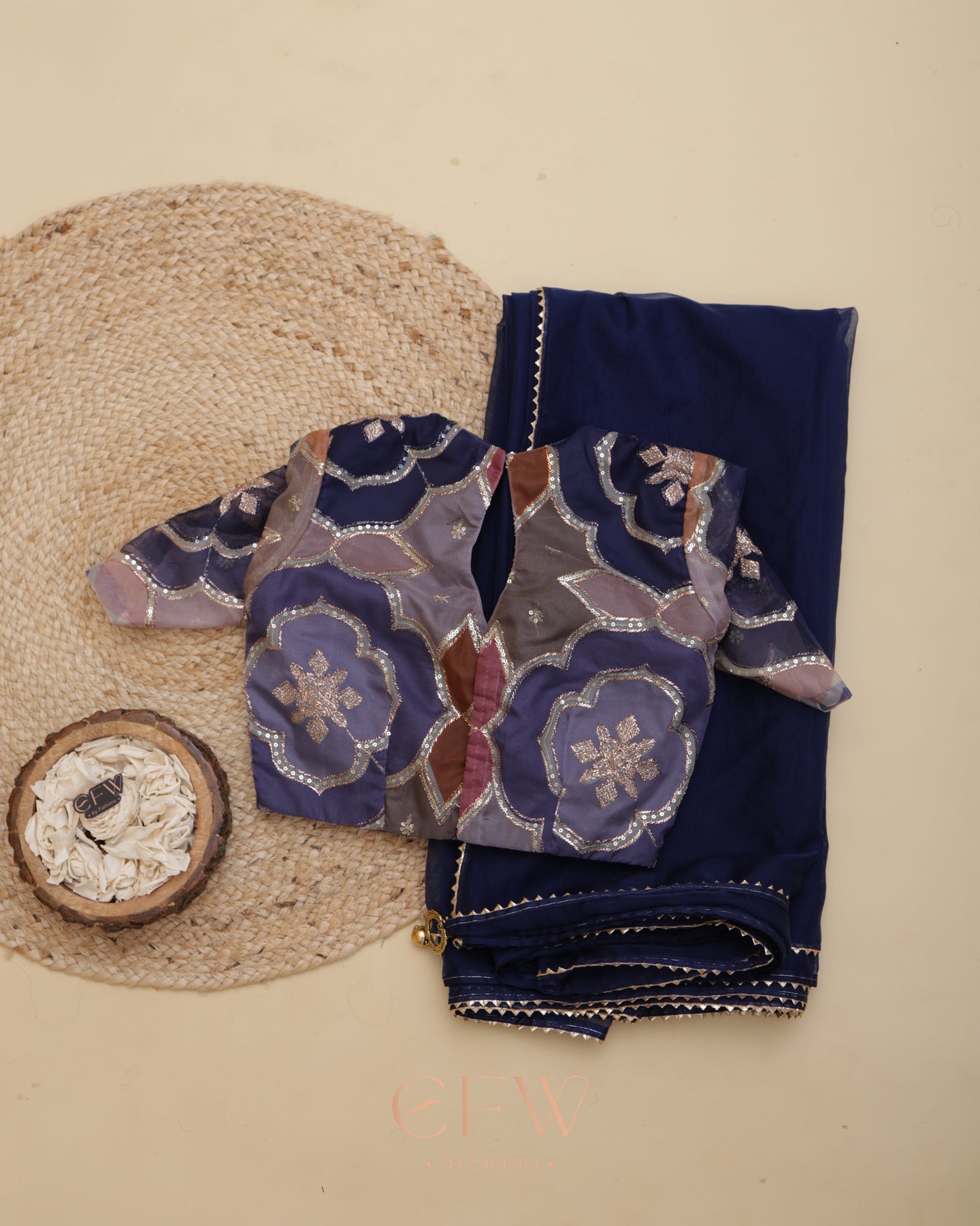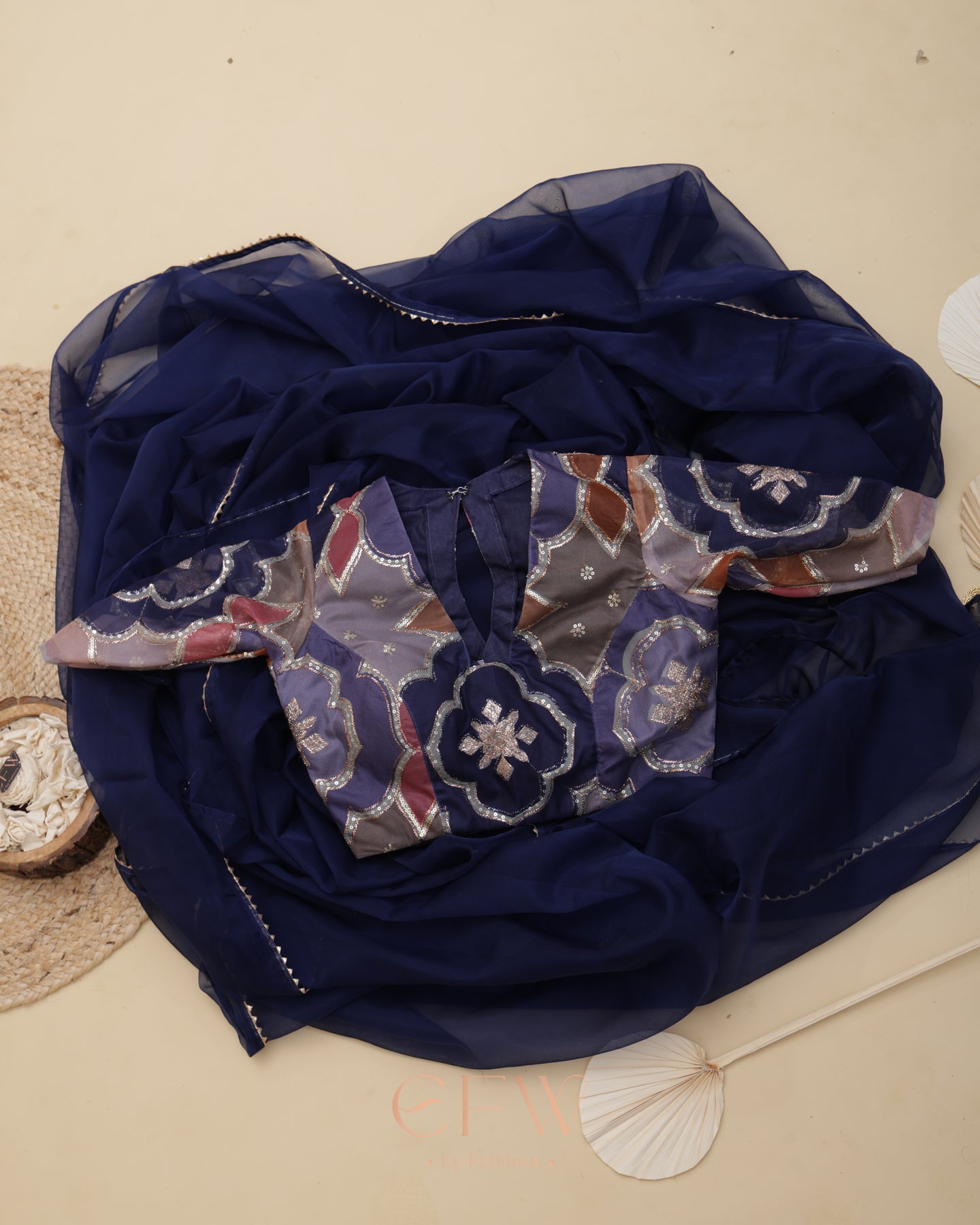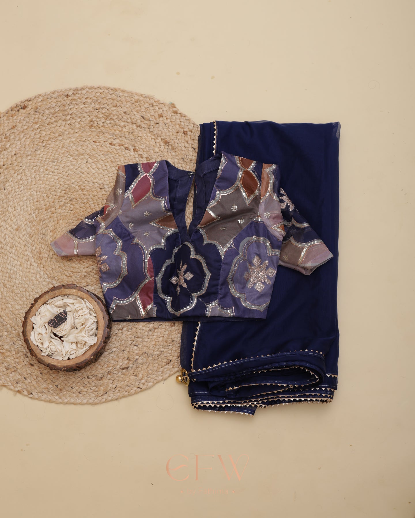 Step into the festival of lights with the Deepotsav Neel Jharokha Saree Set. The saree is a sheer midnight-blue with a soft glow and crisp fall, finished with a delicate gold gota edging that twinkles like rows of diyas. The statement blouse features jharokha-style panels in jewel tones—lilac, rose, copper and plum—outlined with sequins and metallic trims, plus tiny starbursts that echo rangoli sparkle. Elegant, modern, and made for Diwali evenings.