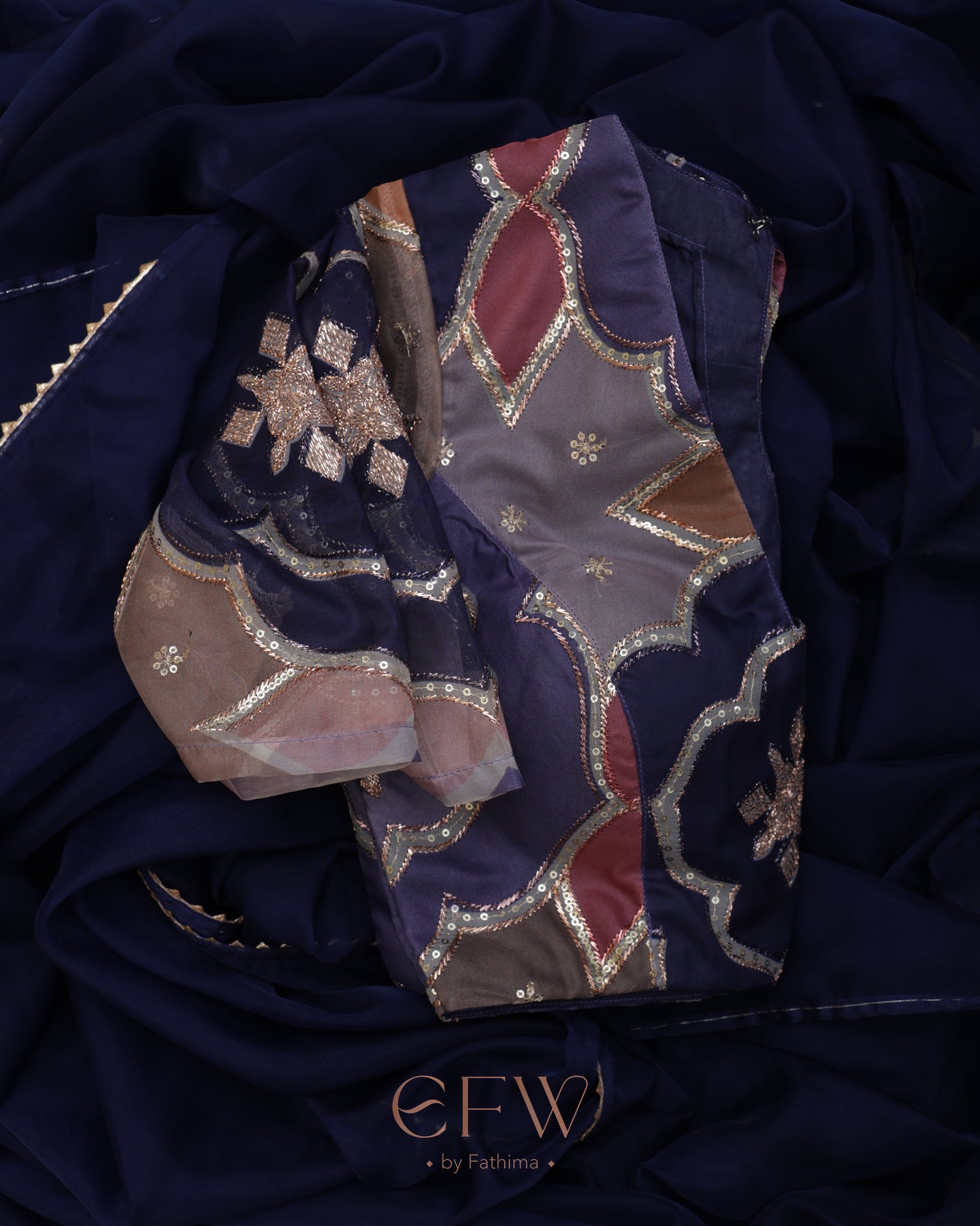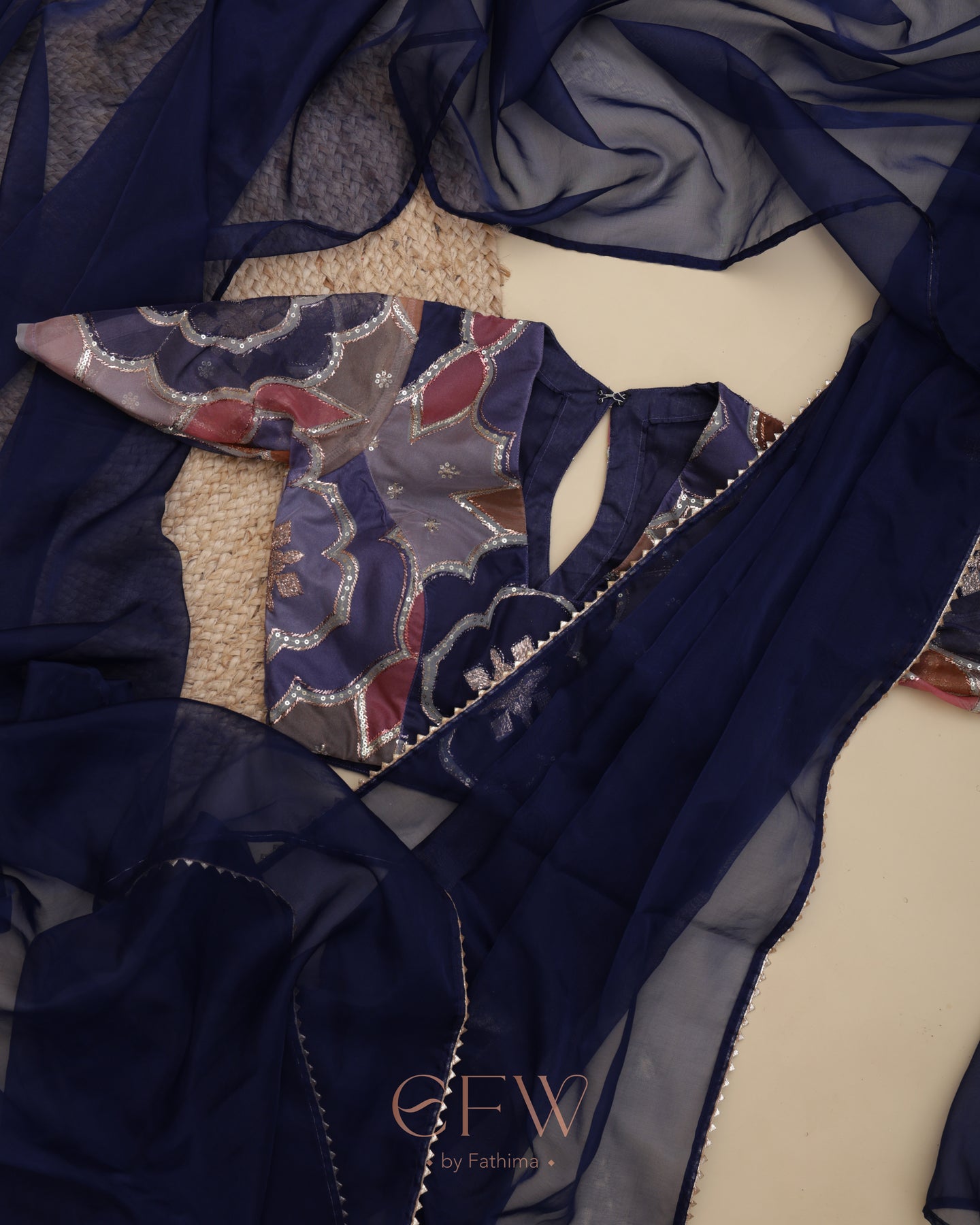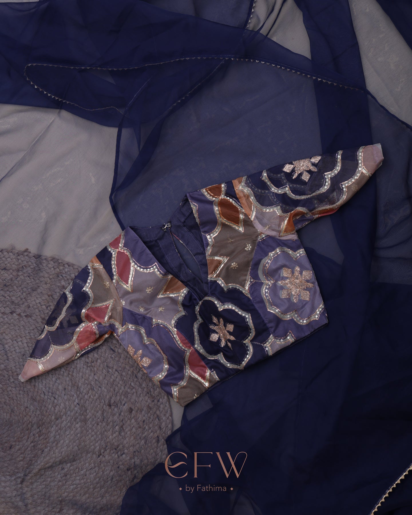 Step into the festival of lights with the Deepotsav Neel Jharokha Saree Set. The saree is a sheer midnight-blue with a soft glow and crisp fall, finished with a delicate gold gota edging that twinkles like rows of diyas. The statement blouse features jharokha-style panels in jewel tones—lilac, rose, copper and plum—outlined with sequins and metallic trims, plus tiny starbursts that echo rangoli sparkle. Elegant, modern, and made for Diwali evenings.